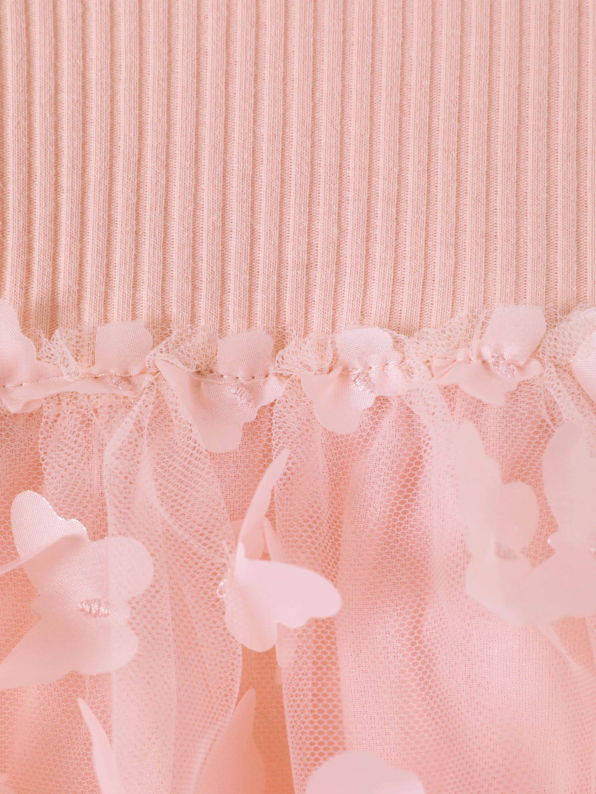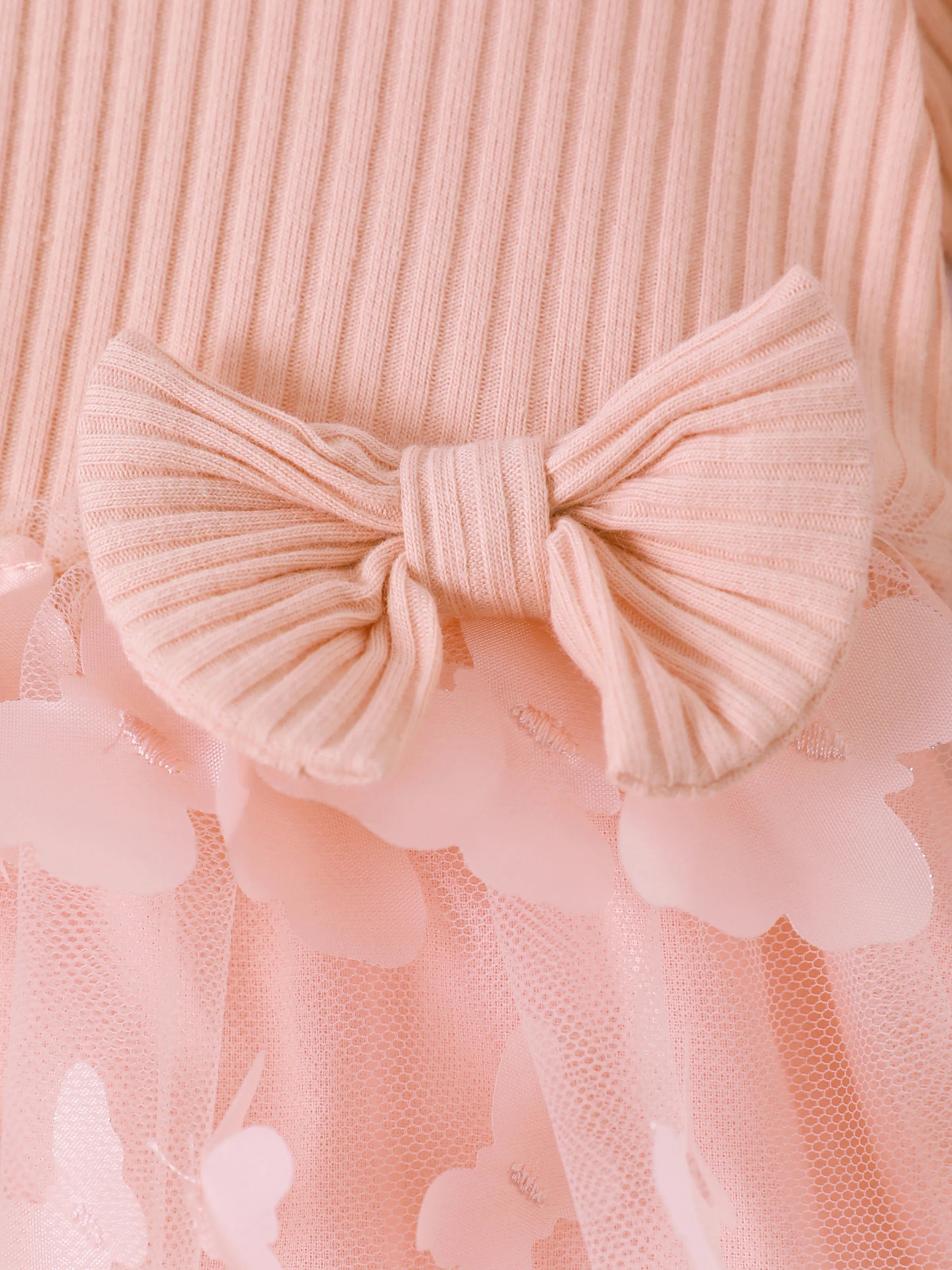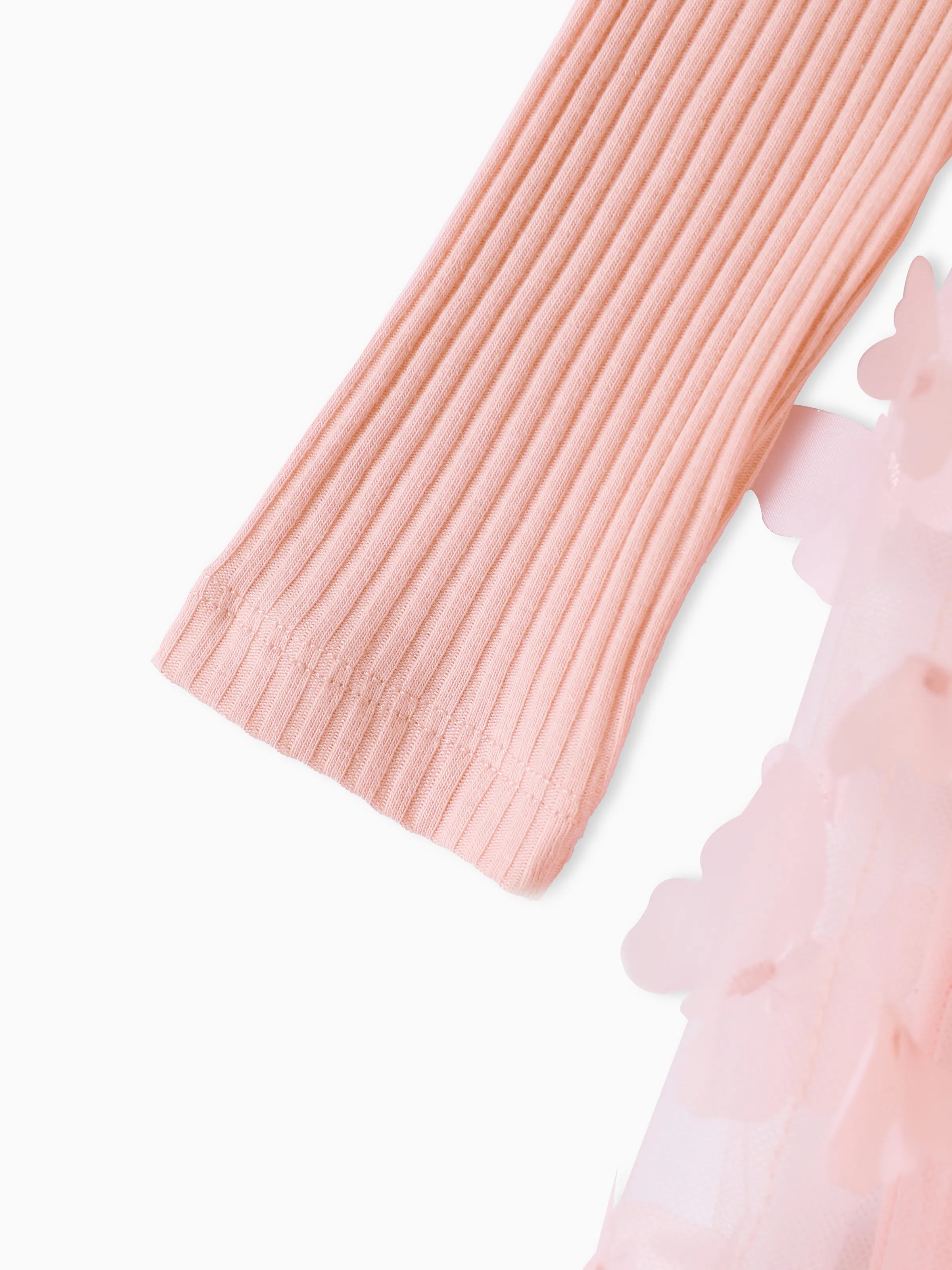 2pcs Baby Mädchen 95% Baumwolle gerippt Langarm Spleißen 3D-Schmetterling Applikationen Netzkleid mit Stirnband-Set rosa