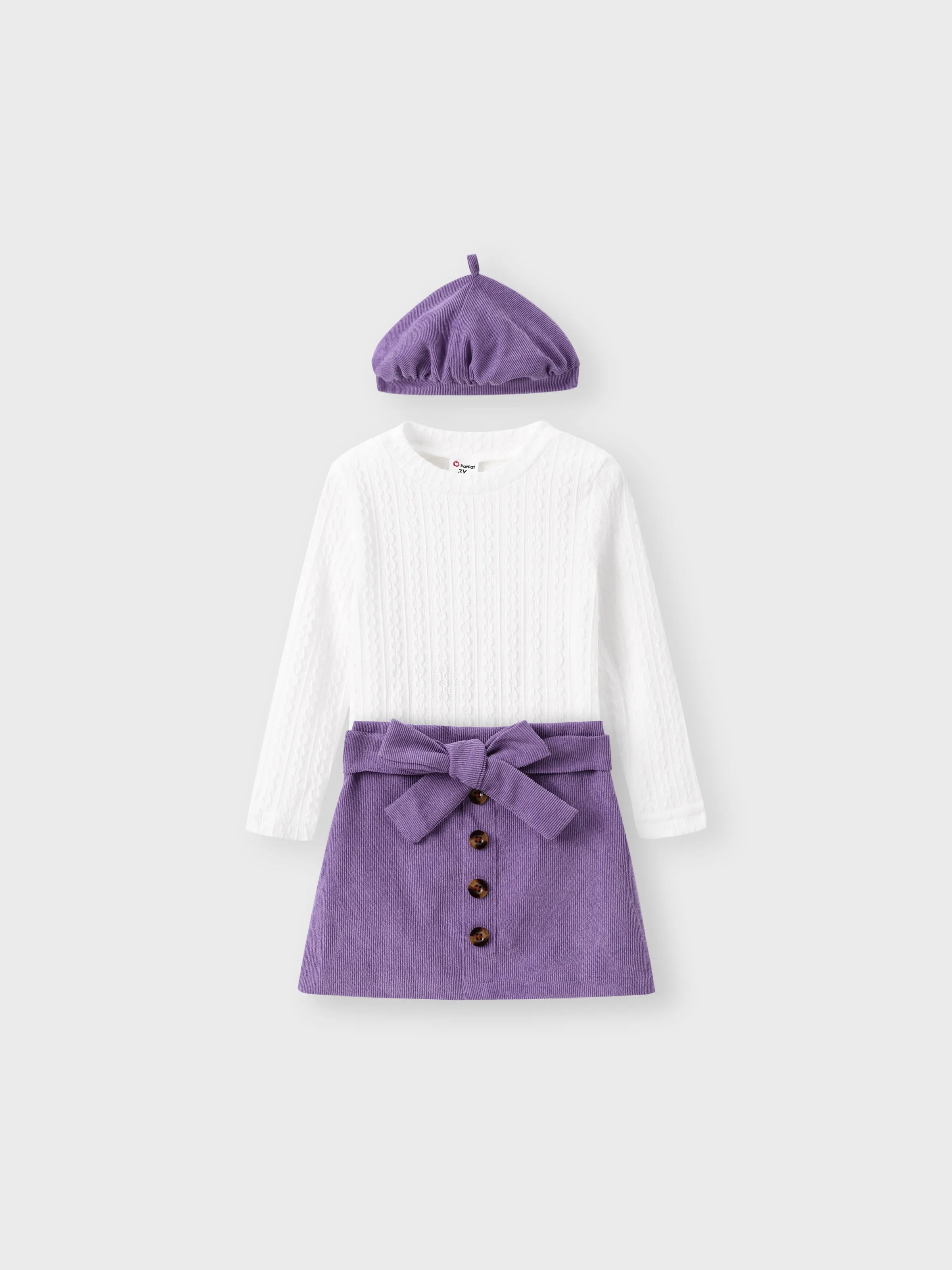 3-teiliges Kleinkindmädchen-Zopfstrickoberteil & Gürtelrock & Hut-Set lila
