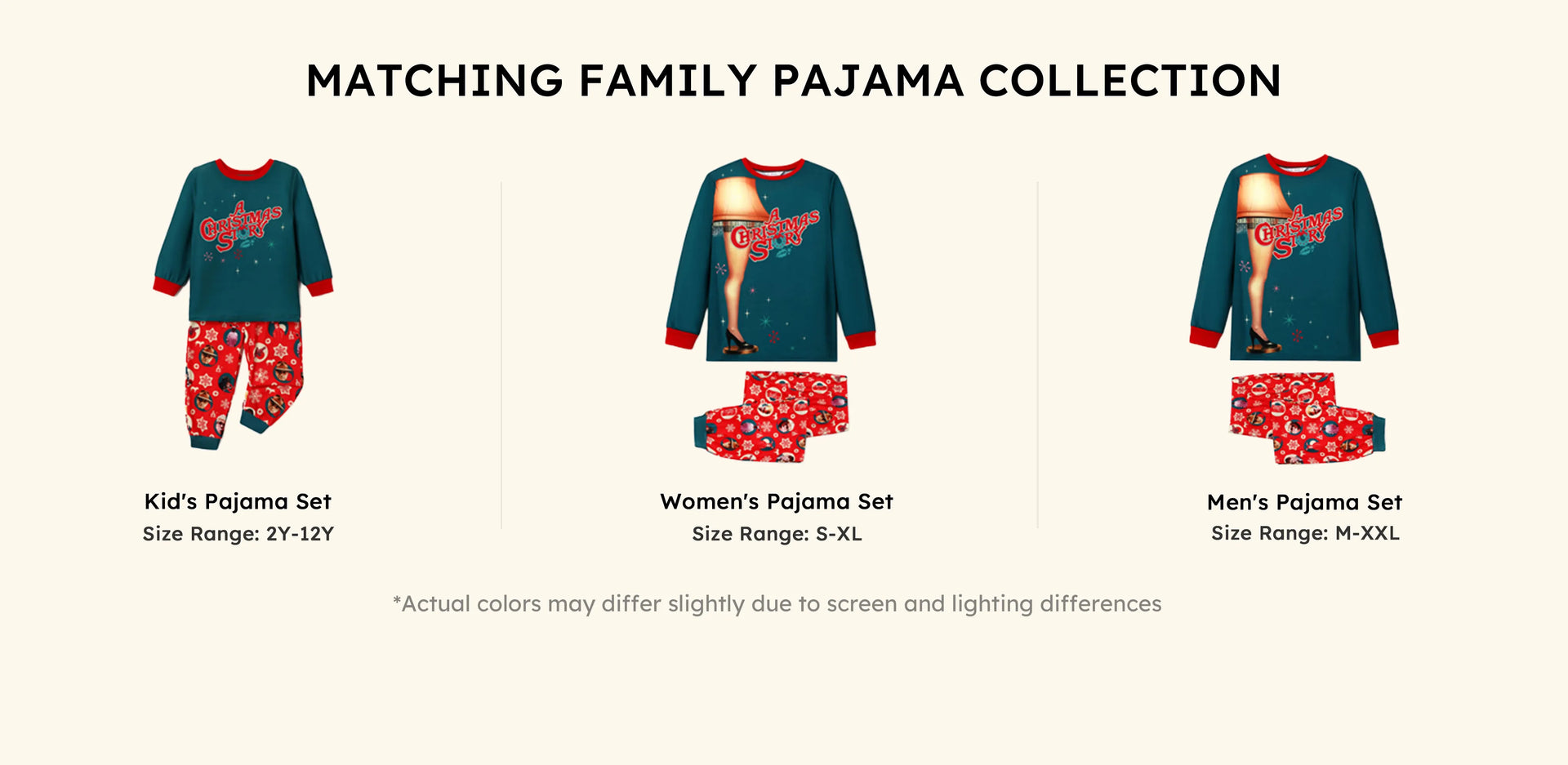 This A Christmas Story™ pajama set features the iconic lamp graphic with "A Christmas Story" text. The festive red and green color combination, along with holiday-themed patterned pants, make it perfect for family photos and cozy holiday moments. Available for adults, kids, and babies.