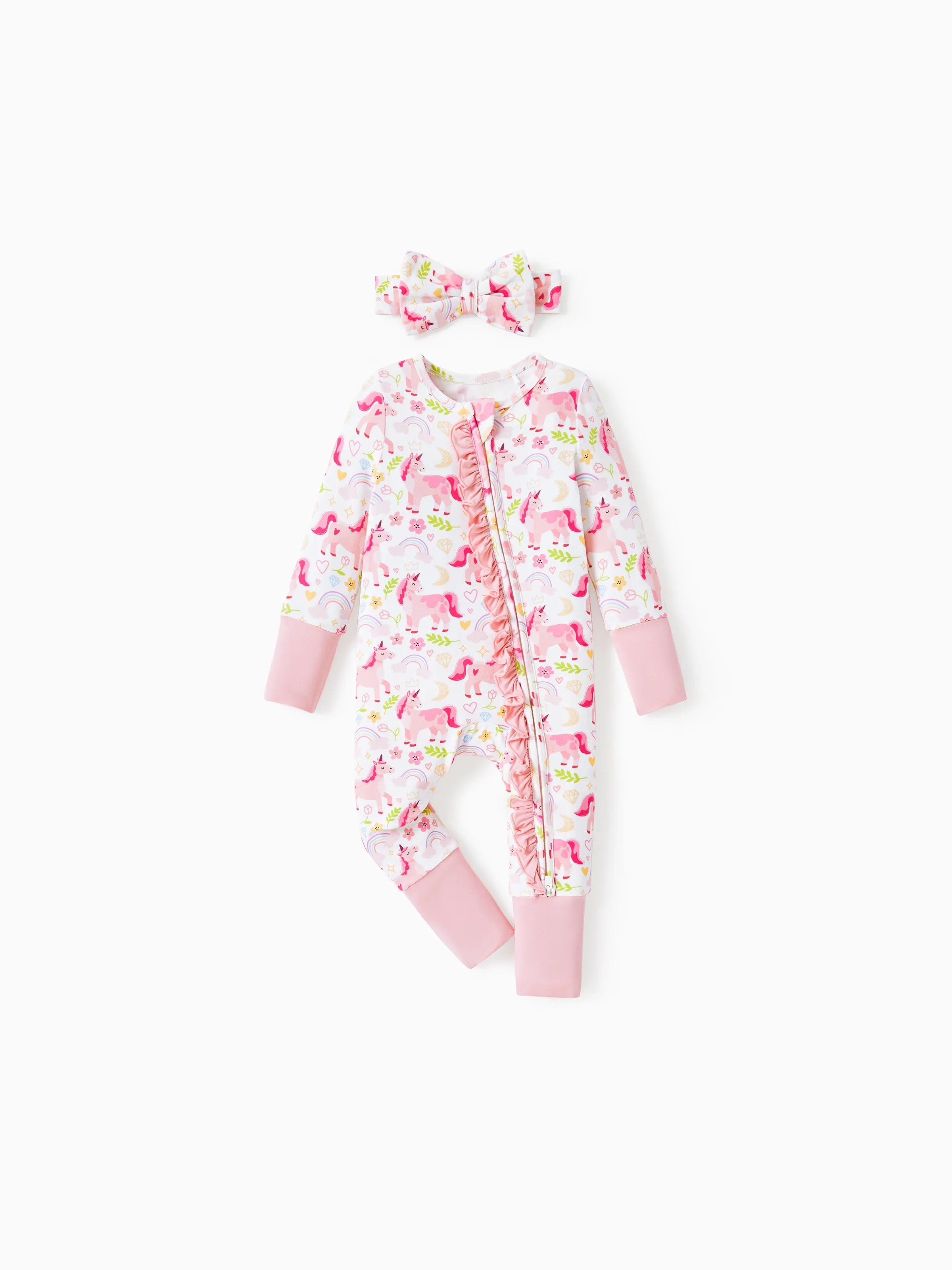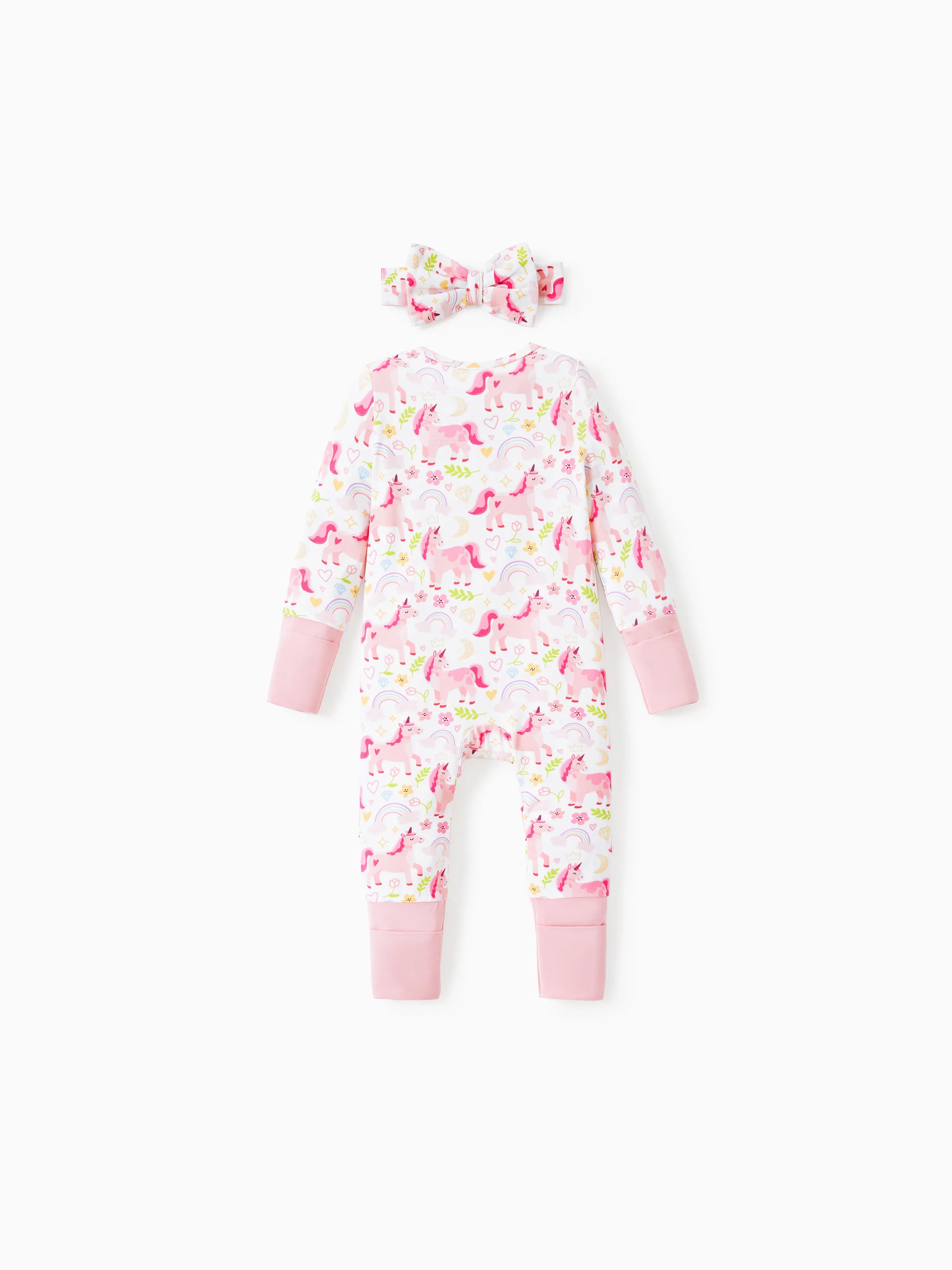 Bambus Baby Jungen/Mädchen Tier bedruckt 2-Wege-Reißverschluss Strampler Anti-Rutsch Langarmfußball mit Haarband rosa