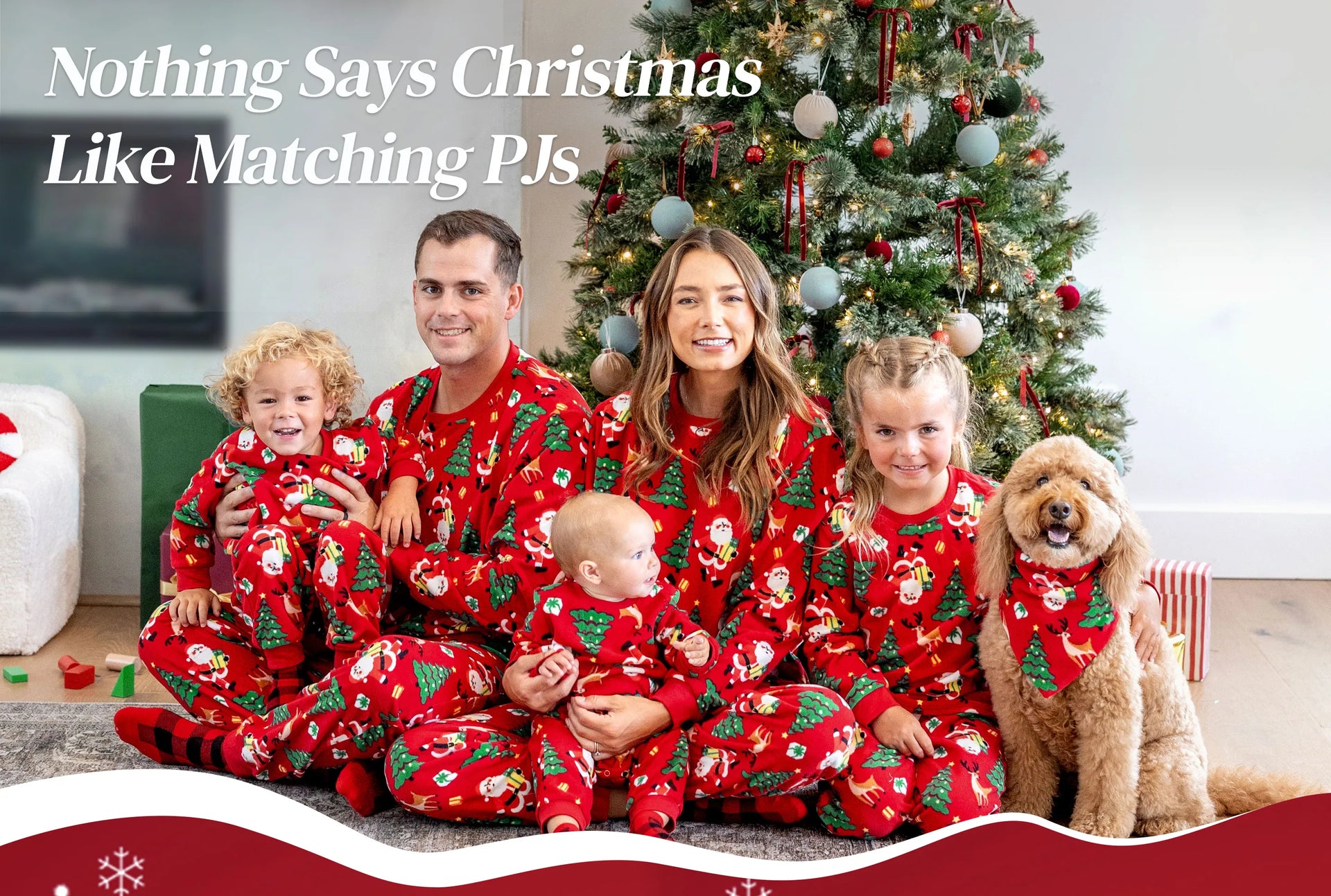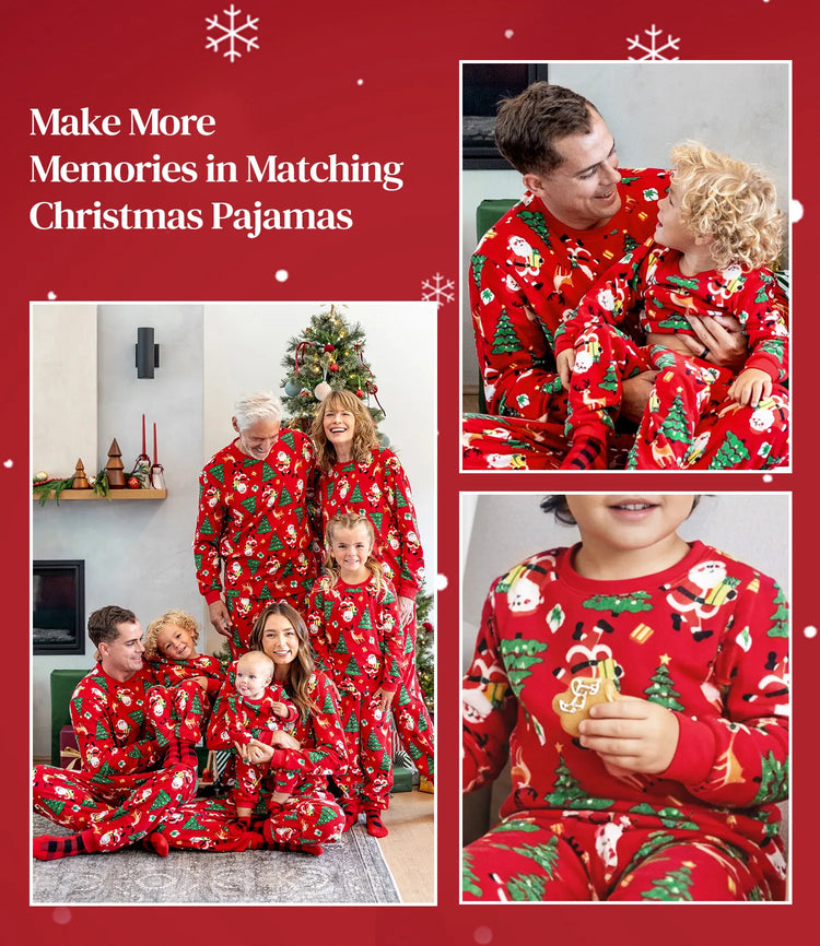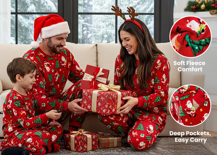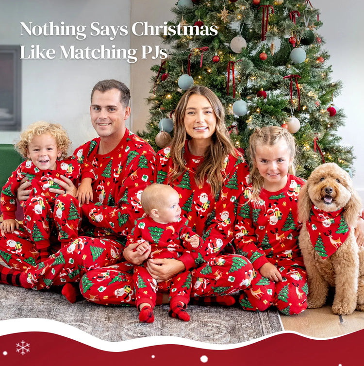 Festliche rote Familienpyjamas mit Weihnachtsbaum- und Weihnachtsmann-Motiven, ideal für Weihnachts-Pyjamapartys, Familienfotos und zur Steigerung des Feiertagsgeistes und des Familienzusammenhalts.