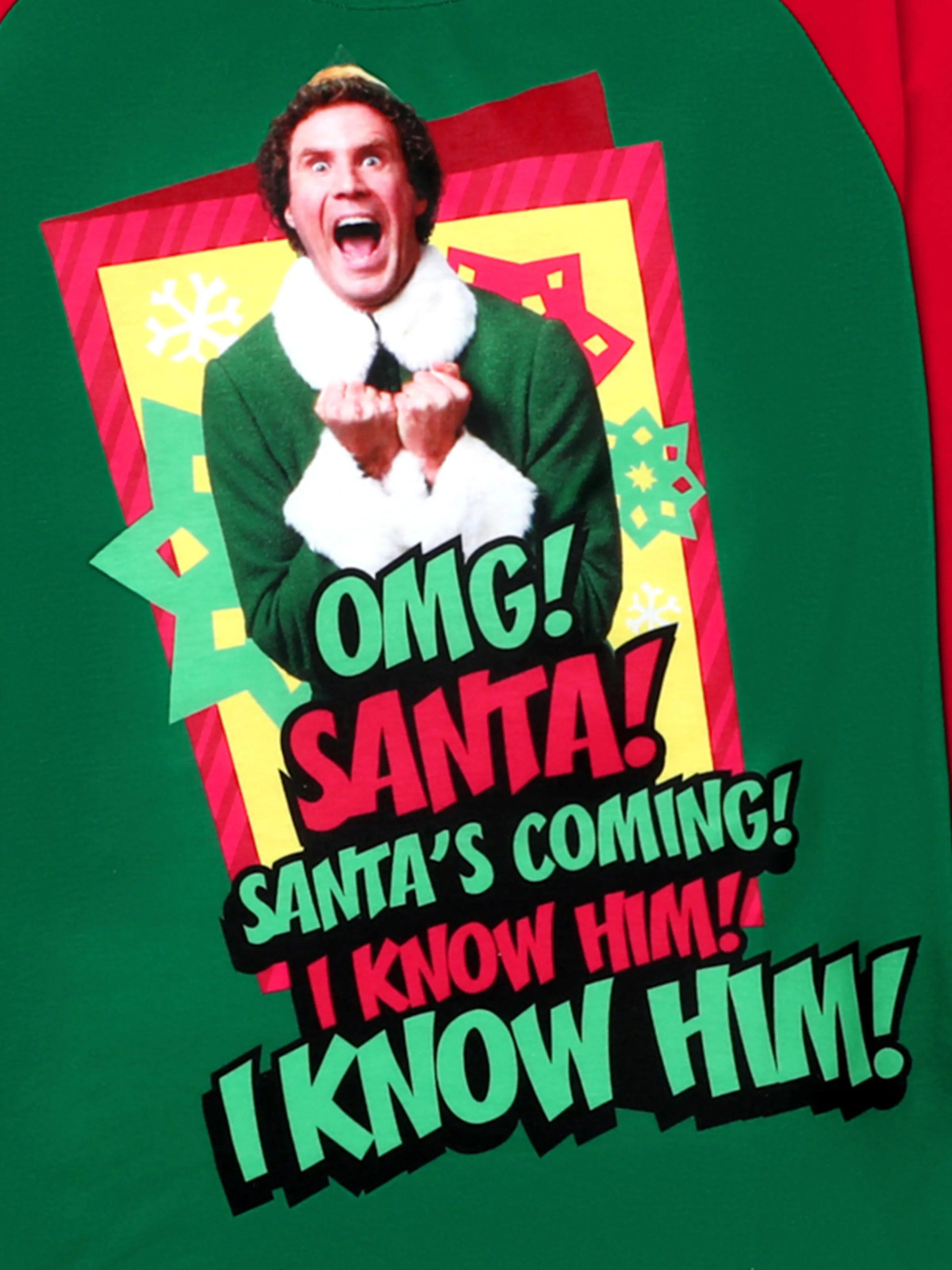 Dieses Elf™ Weihnachtsschlafanzug-Set zeigt ein lustiges „OMG! Santa kommt!“-Motiv mit Buddy dem Elf. Das rot-grüne Farbblockdesign in Kombination mit festlich thematischen Hosen ist ideal für Familienfotos und gemütliche Feiern. Verfügbar für Erwachsene, Kinder und Babys.