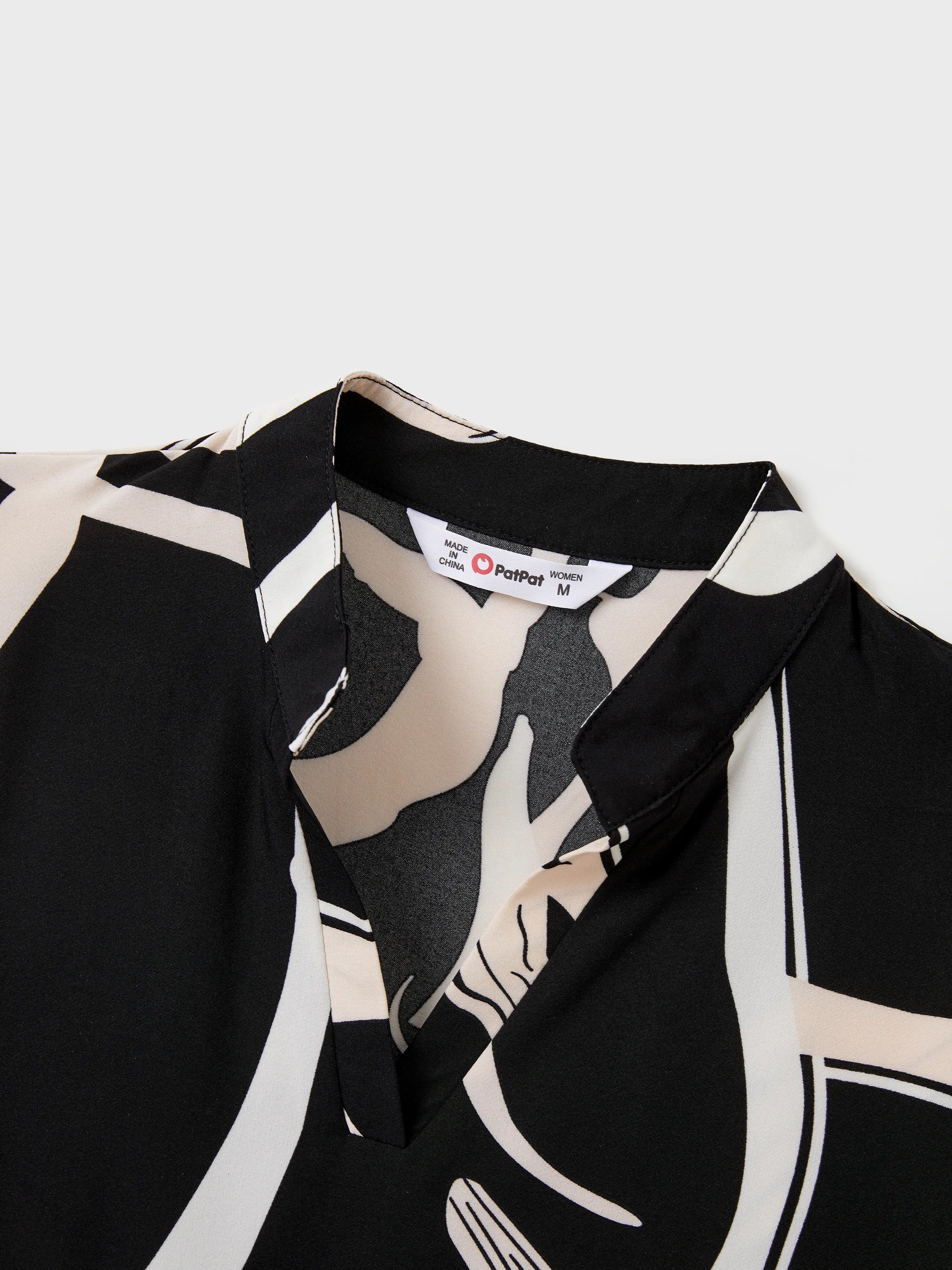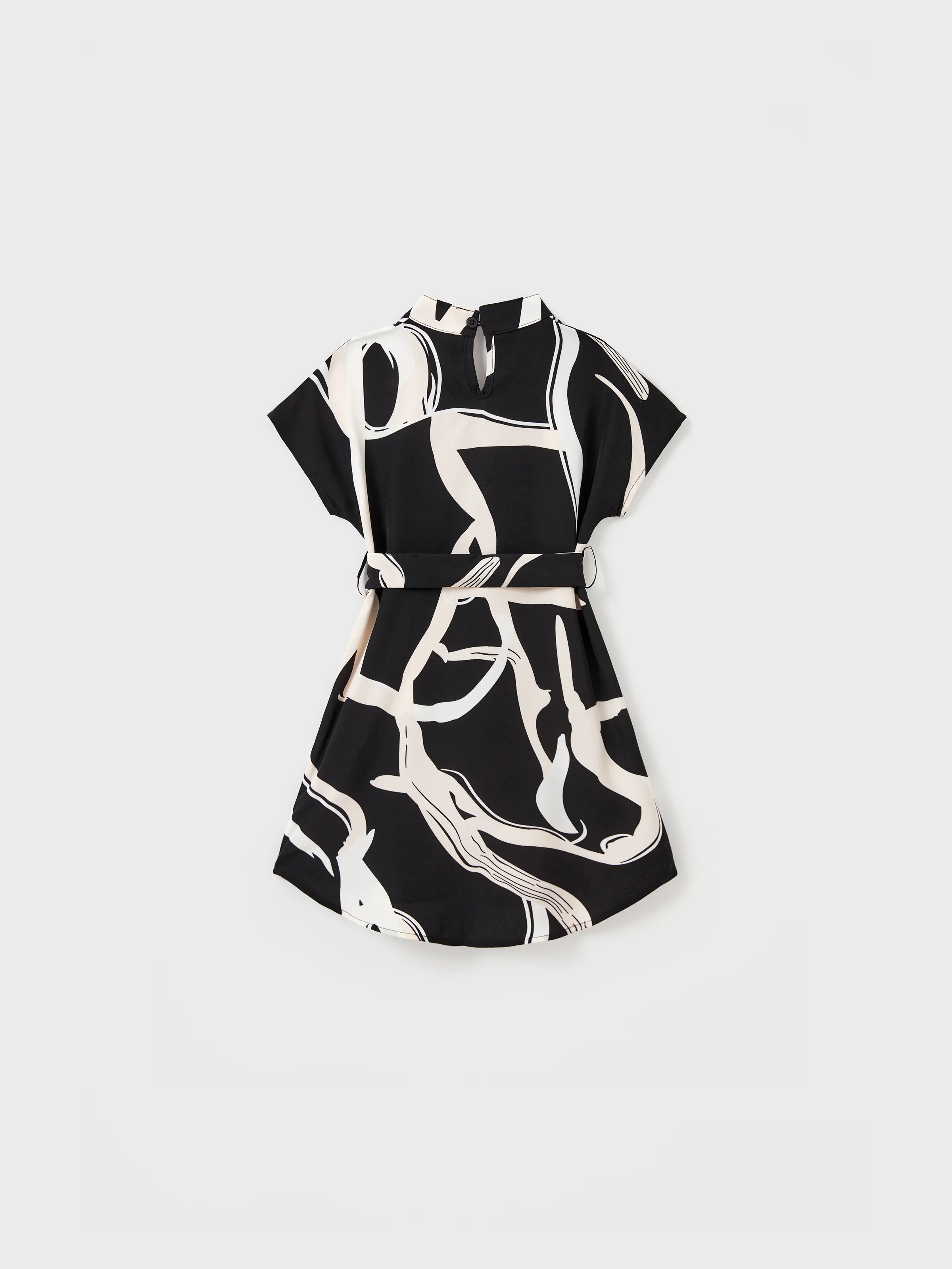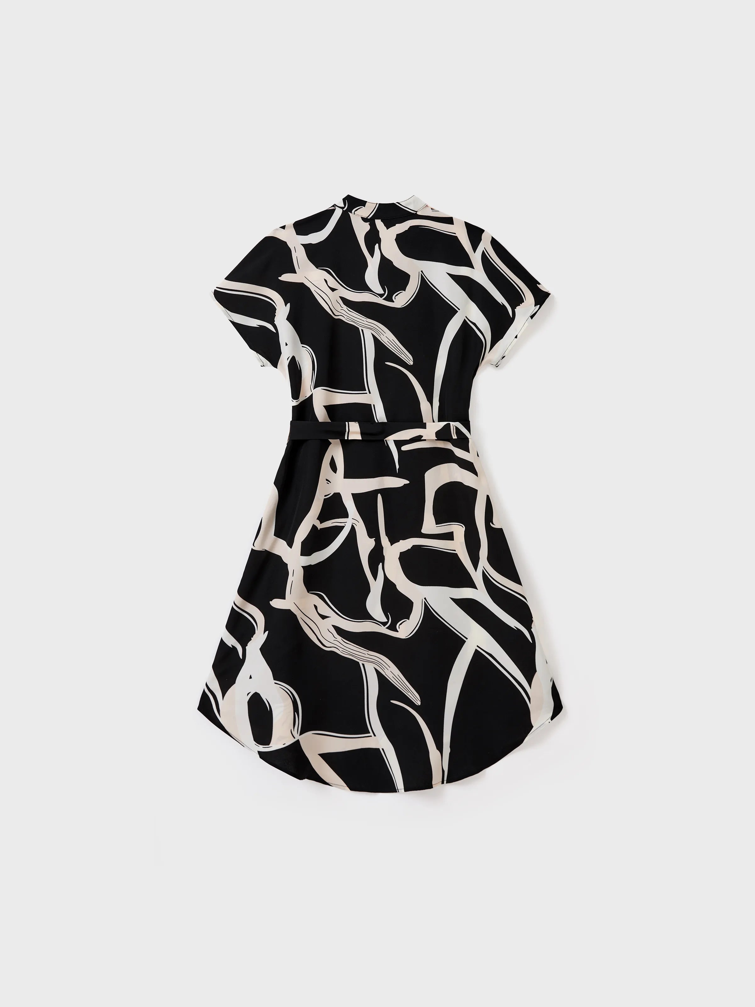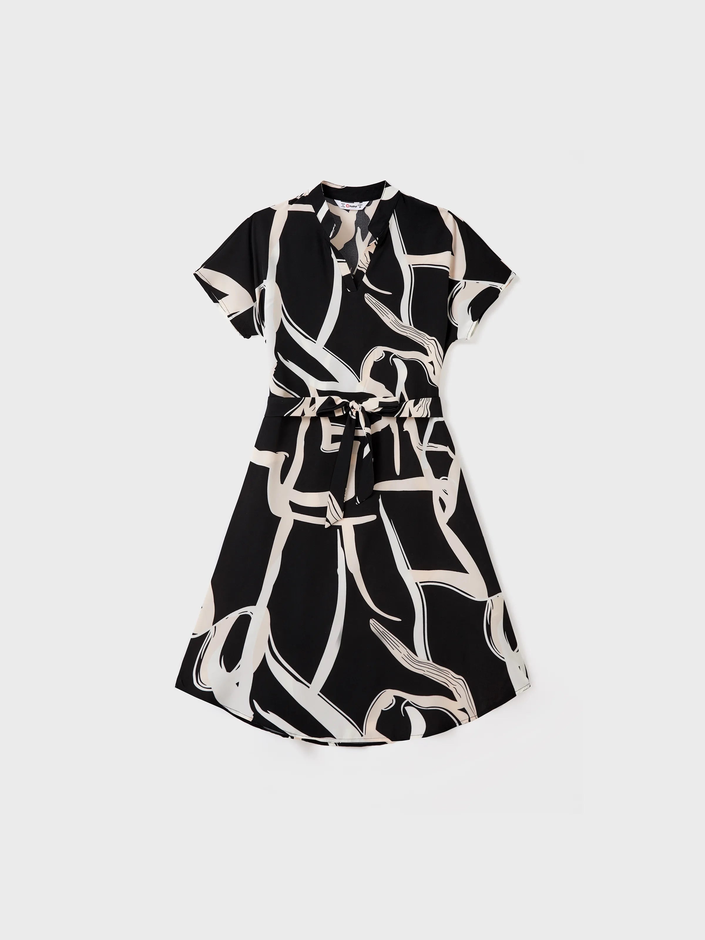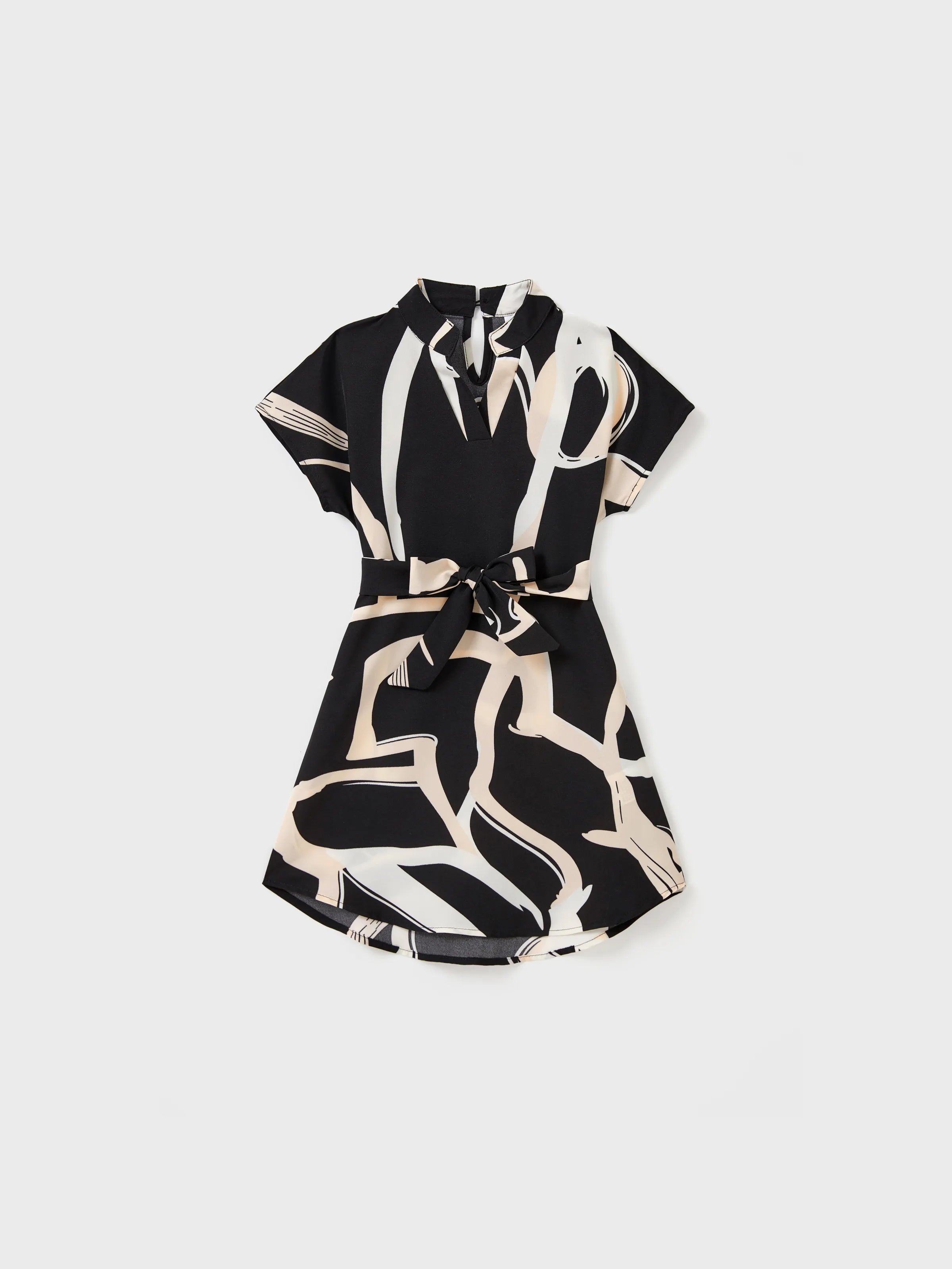 Familienpassendes Farbblock-Baumwoll-T-Shirt oder modernes Kurzarmkleid mit abstraktem Druck und Taillengürtel schwarz