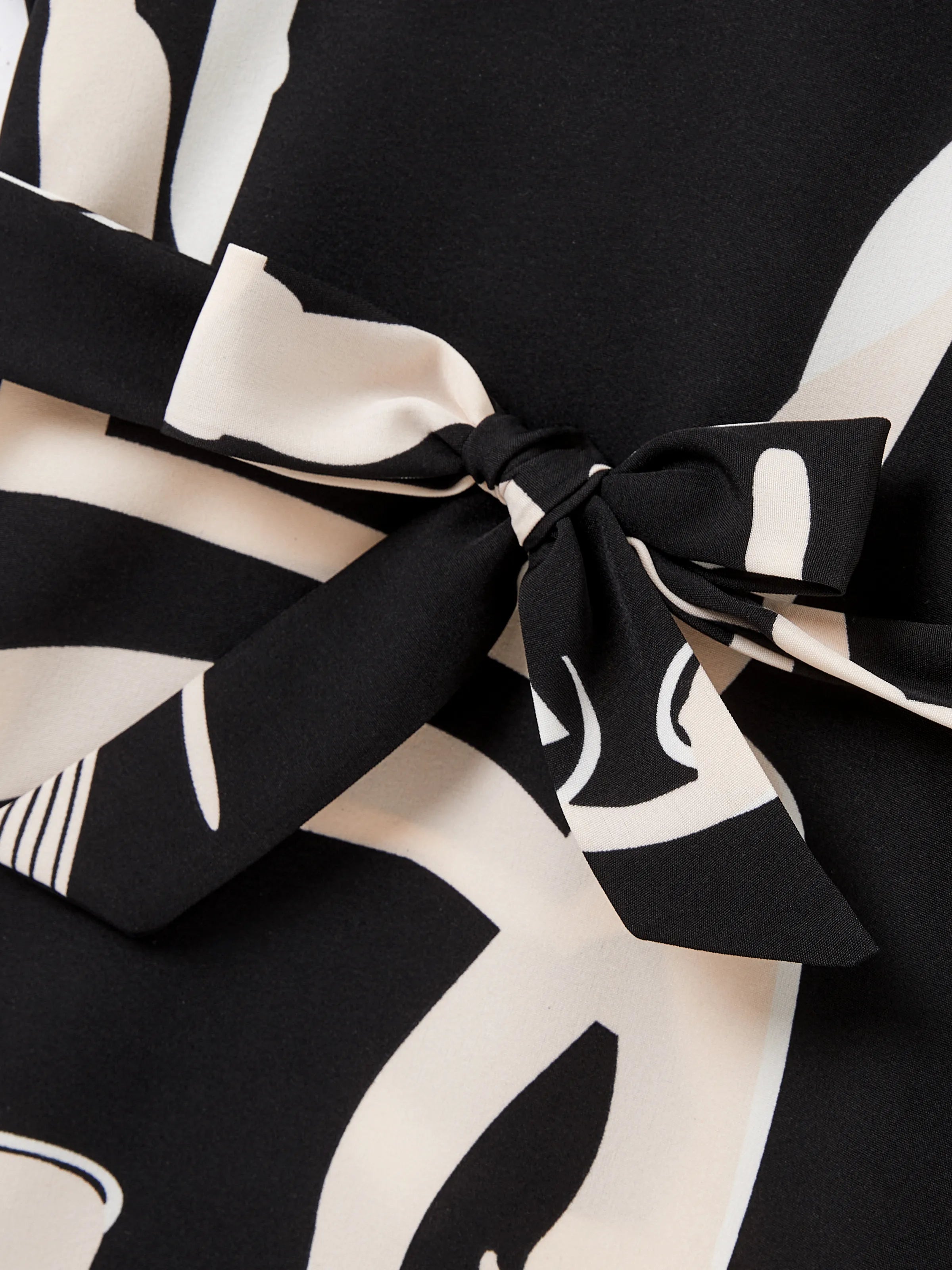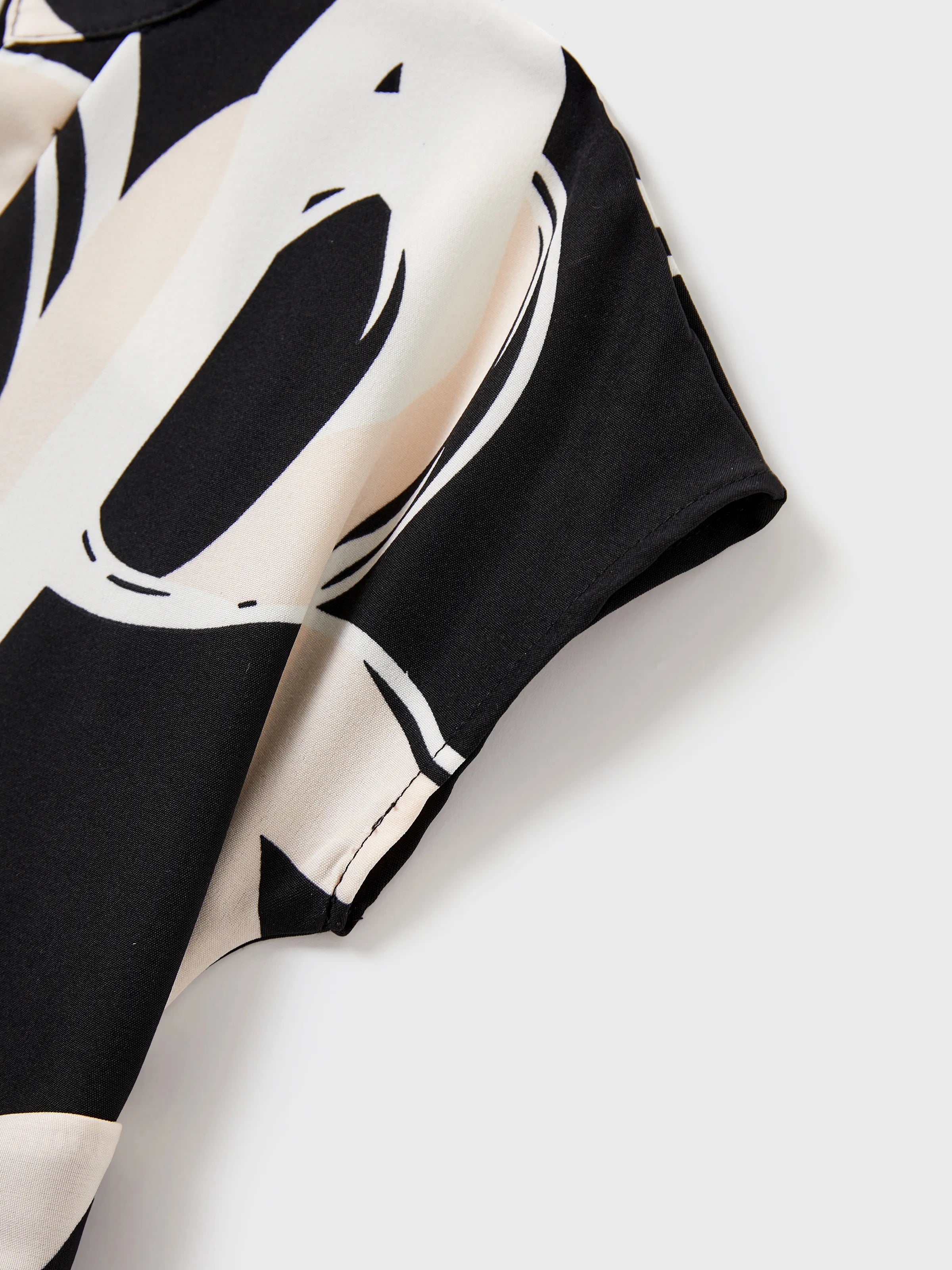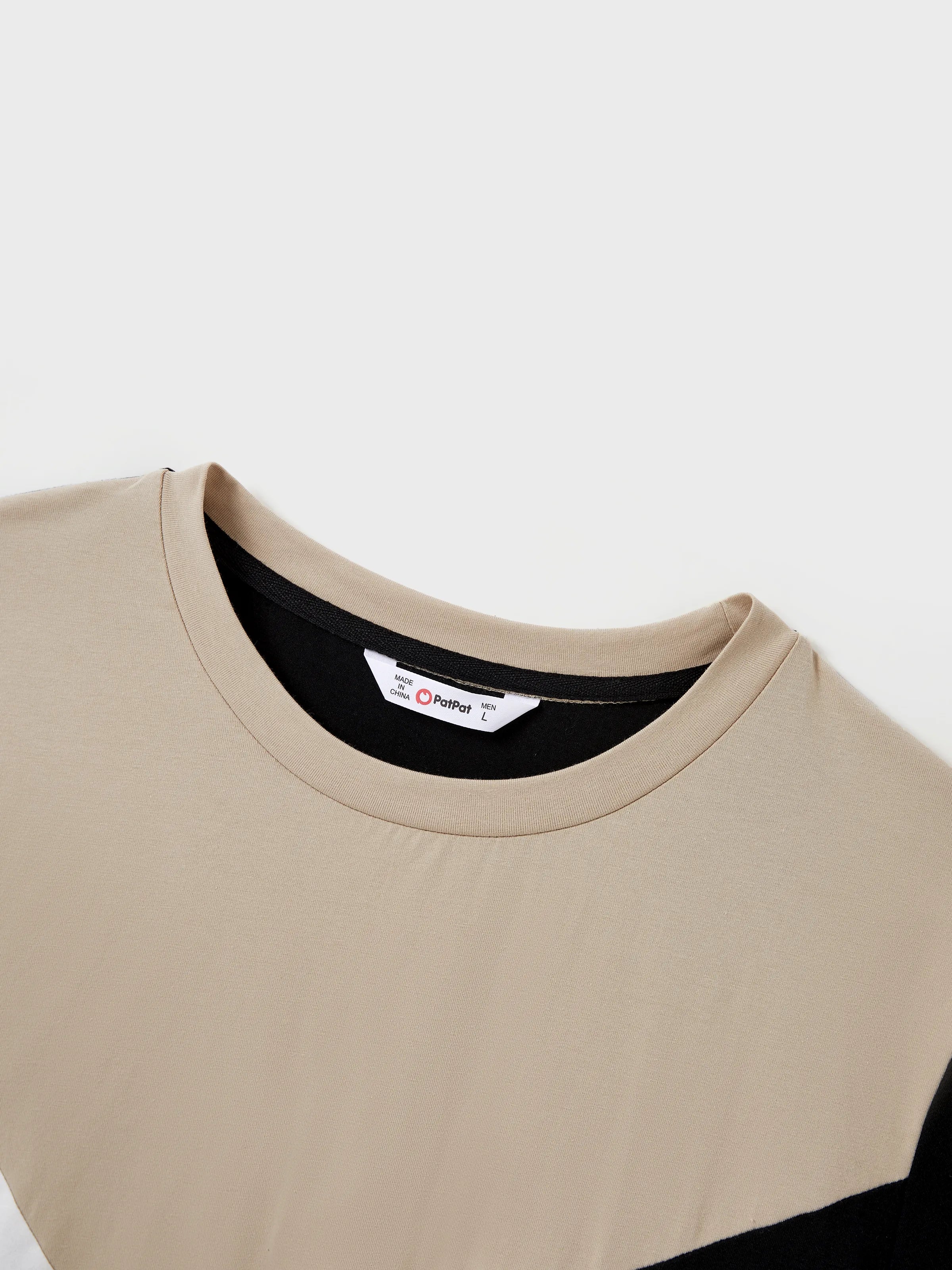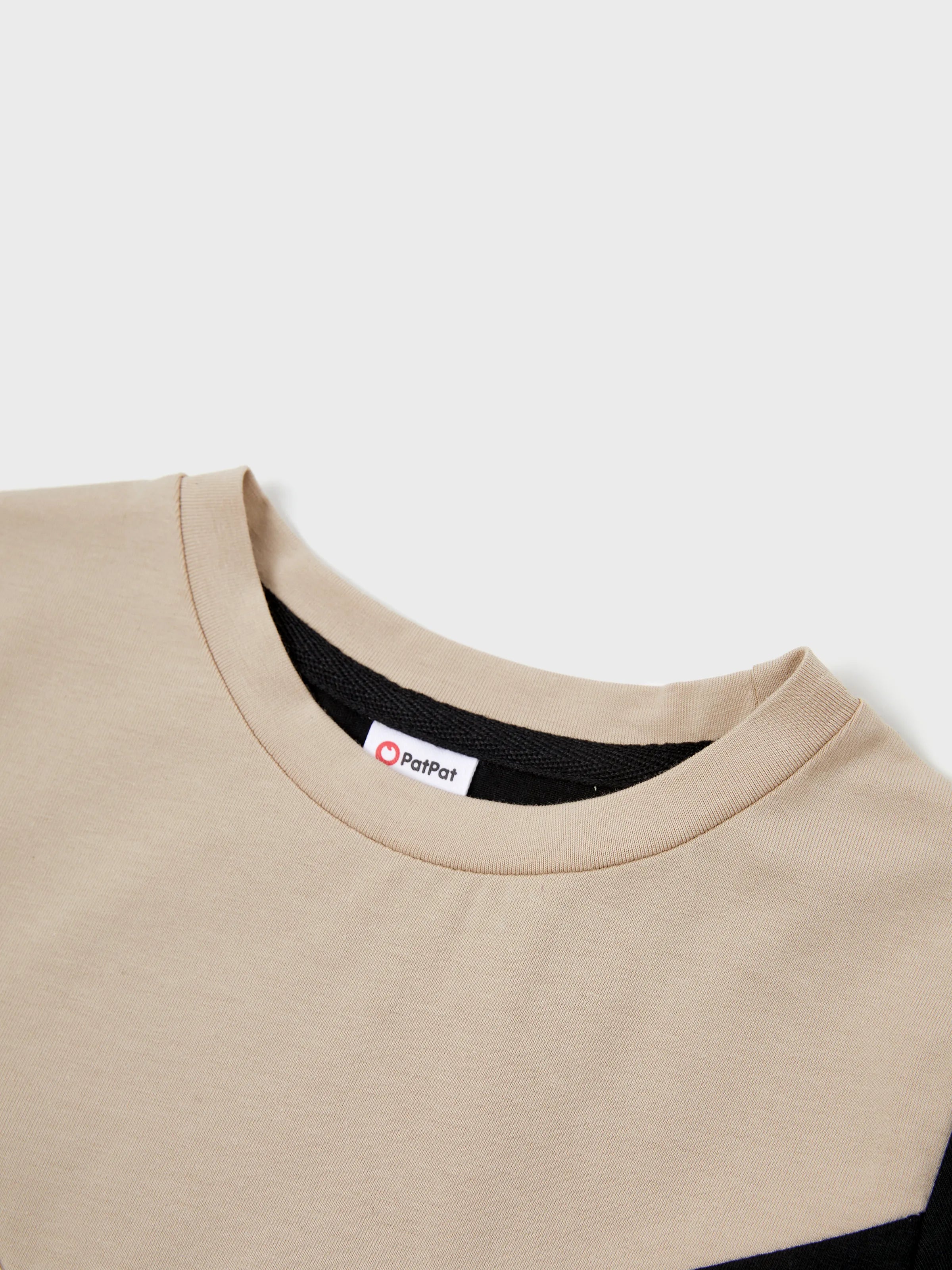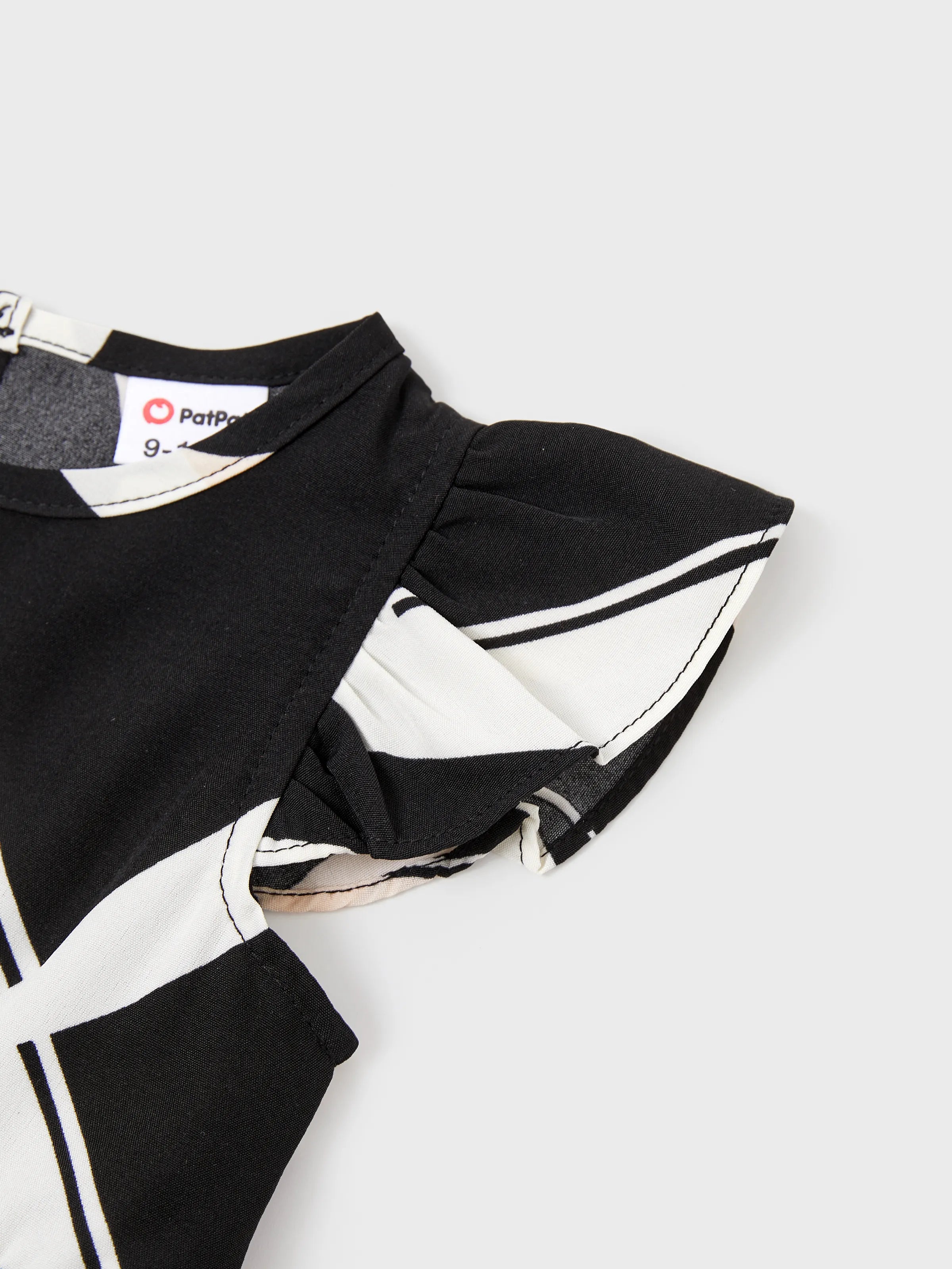 Familienpassendes Farbblock-Baumwoll-T-Shirt oder modernes Kurzarmkleid mit abstraktem Druck und Taillengürtel schwarz