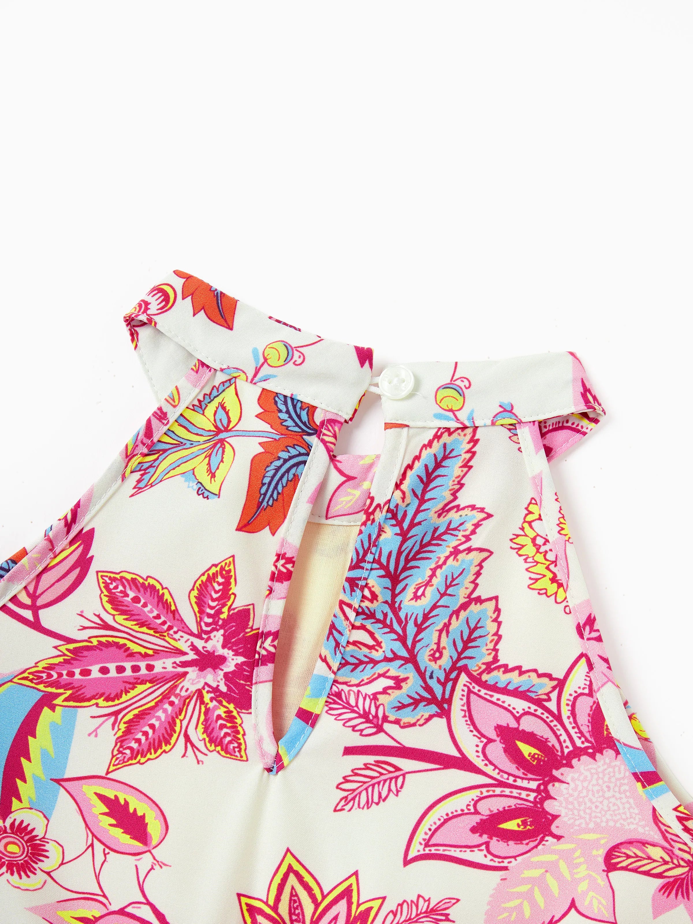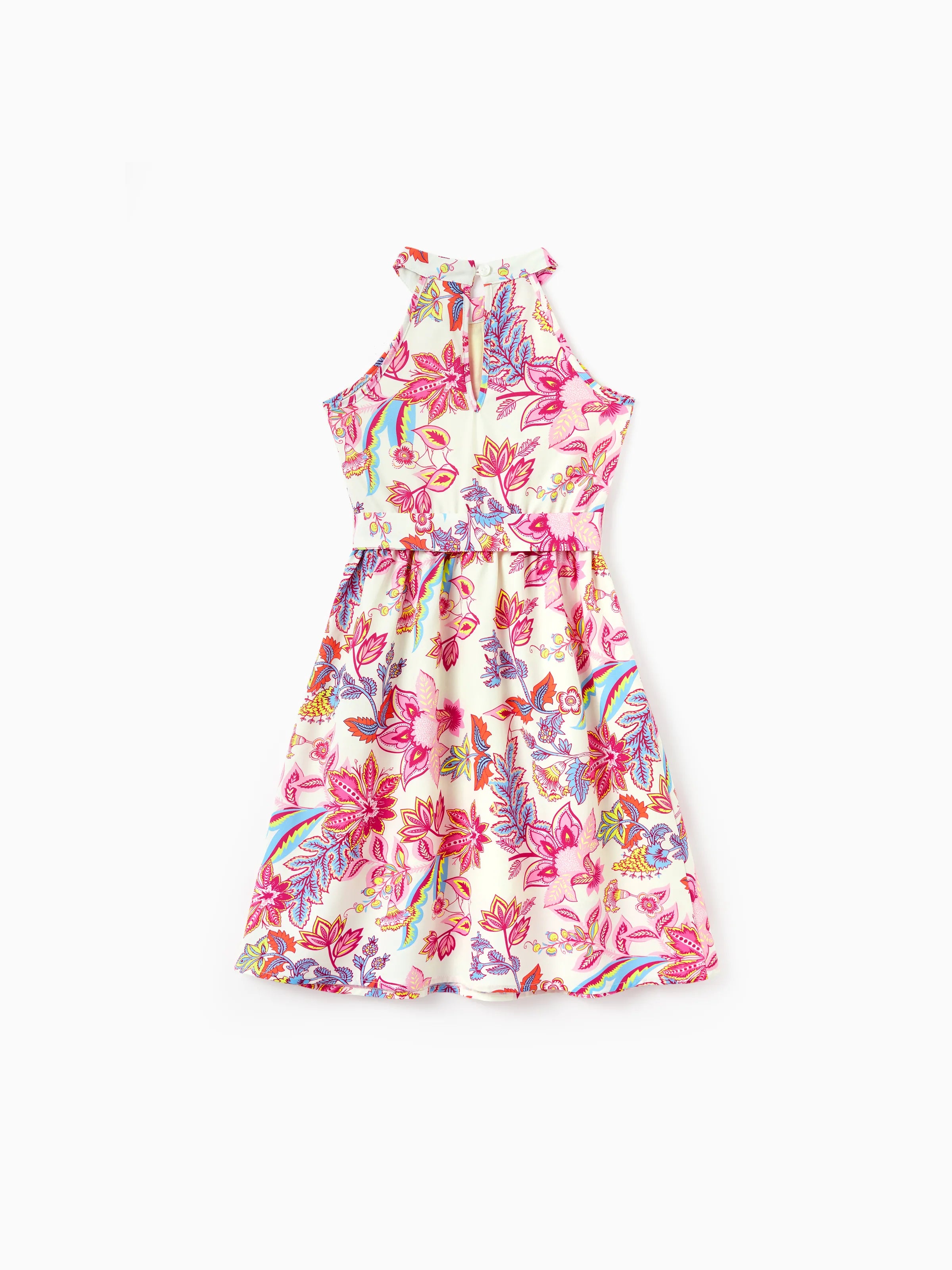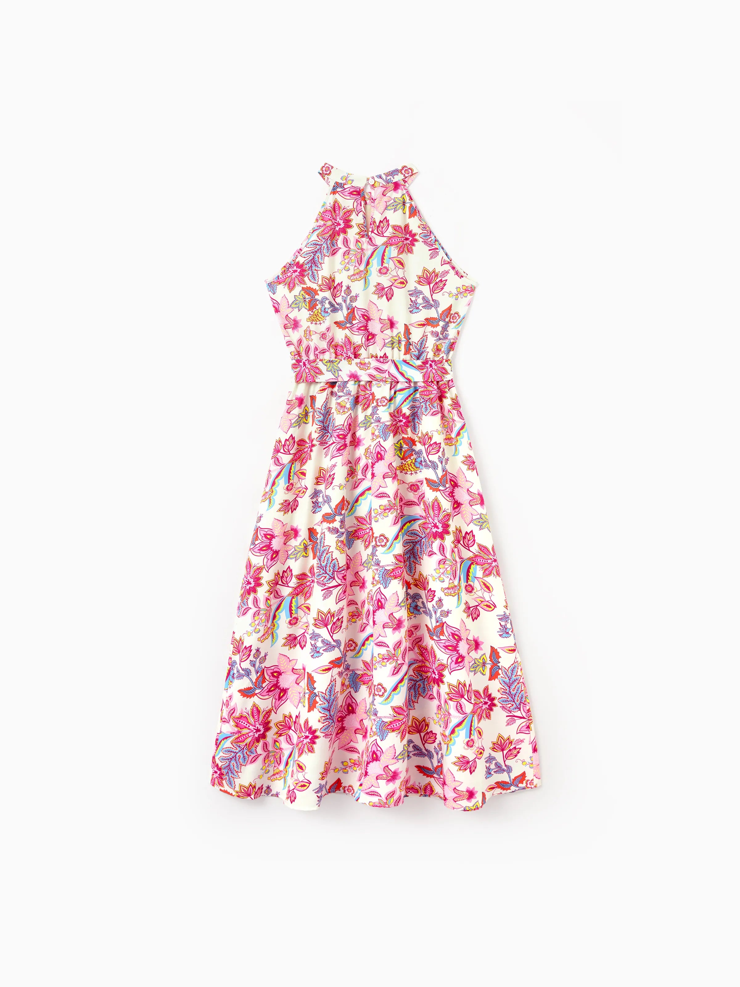Family Matching Outfits Set Tropical Flora Print Short-sleeve Collar Shirt or Halter Belted Dress for Summer Vacation Beige