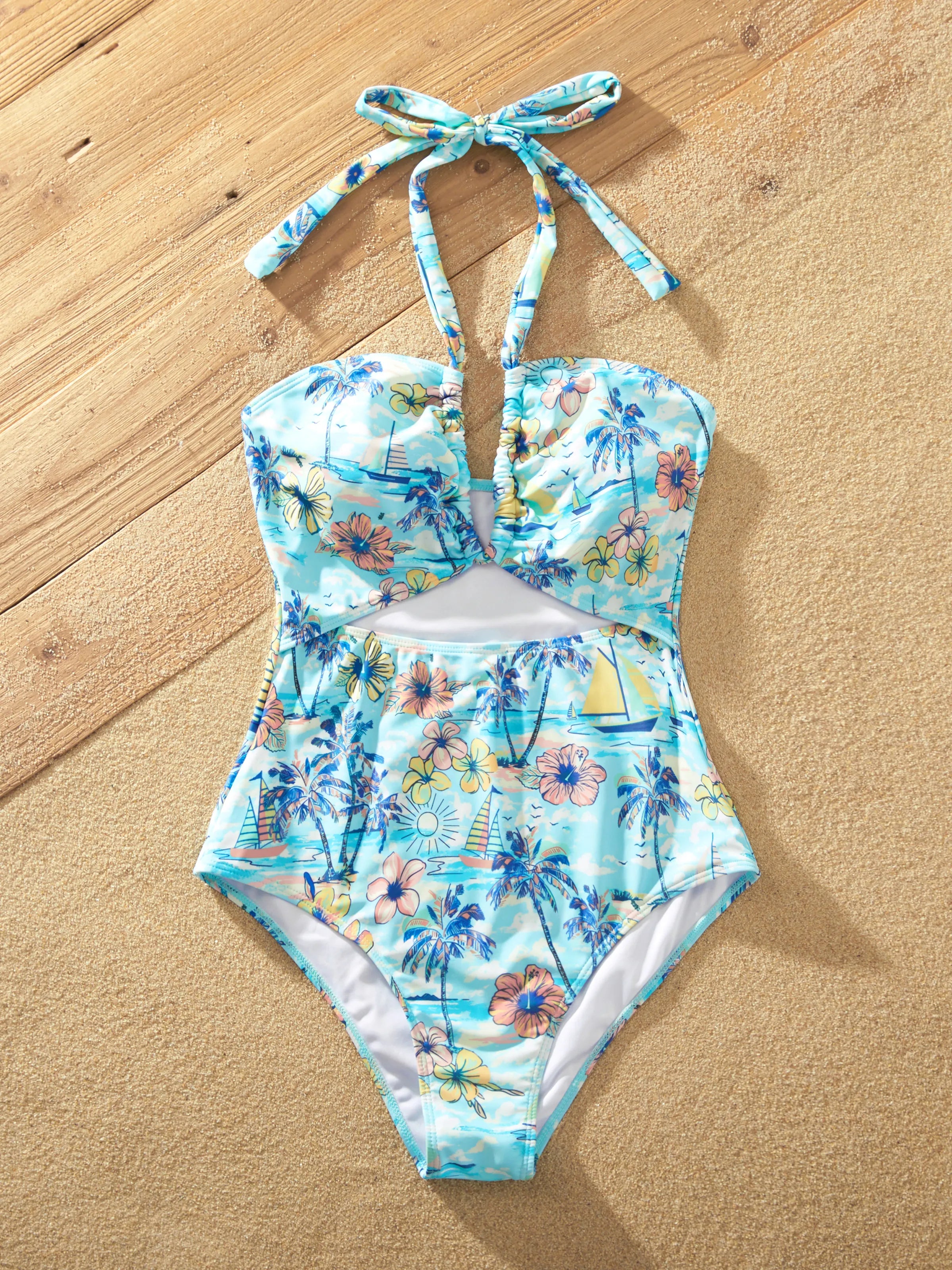 Stylish family matching swimwear with vibrant tropical summer vibes.