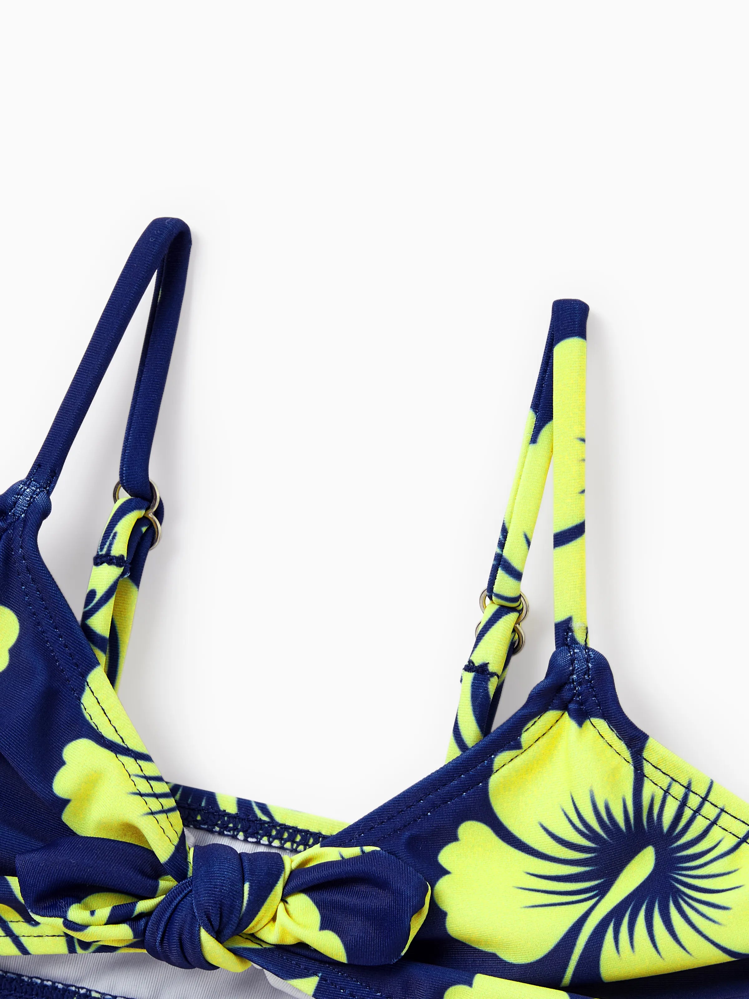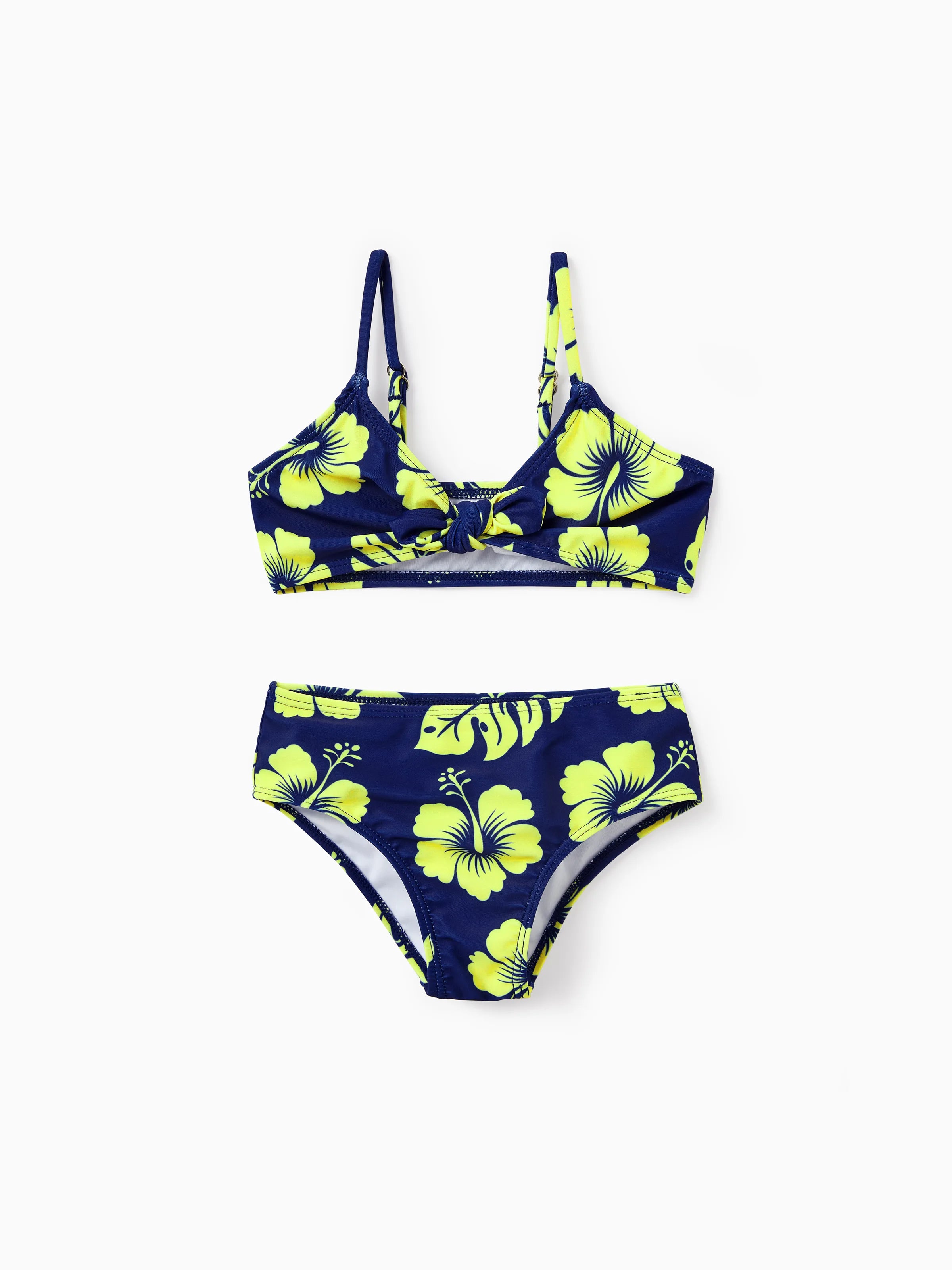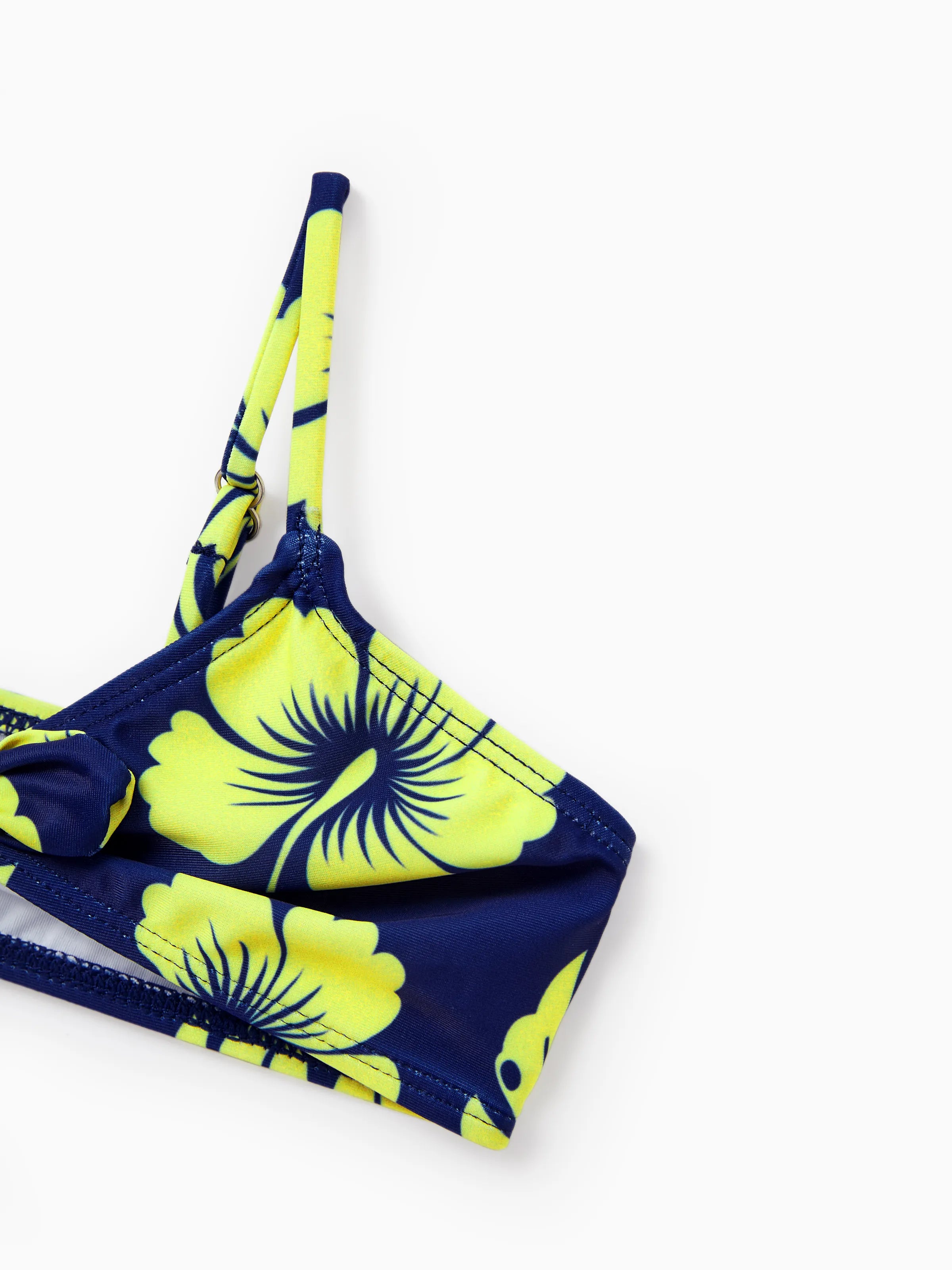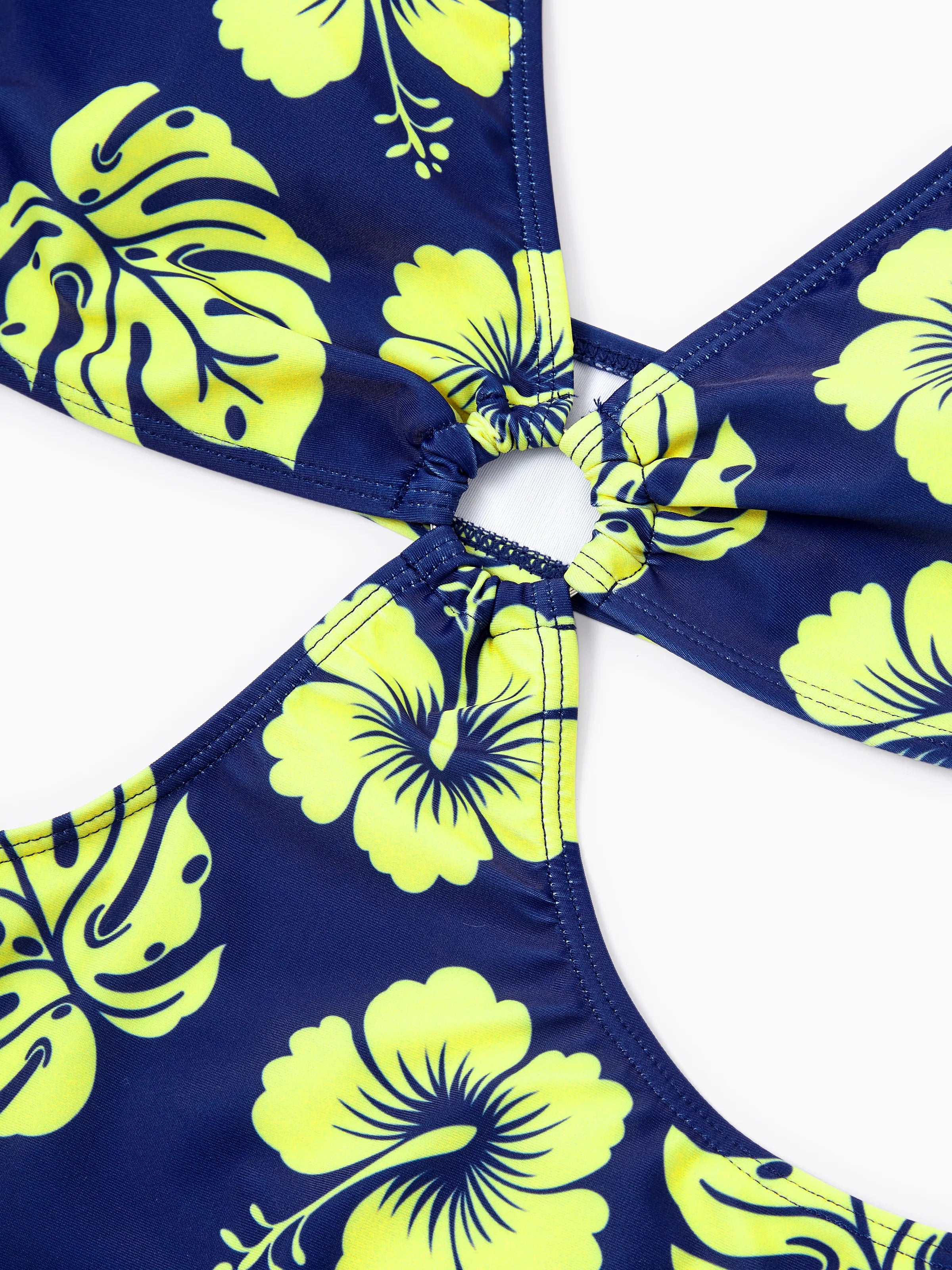 Bring the vibe of a Hawaiian vacation to your summer with our bold, vibrant hibiscus-print matching swimsuits! This coordinated set features eye-catching yellow hibiscus flowers on a classic navy background, designed to make your whole family stand out at the beach or pool.