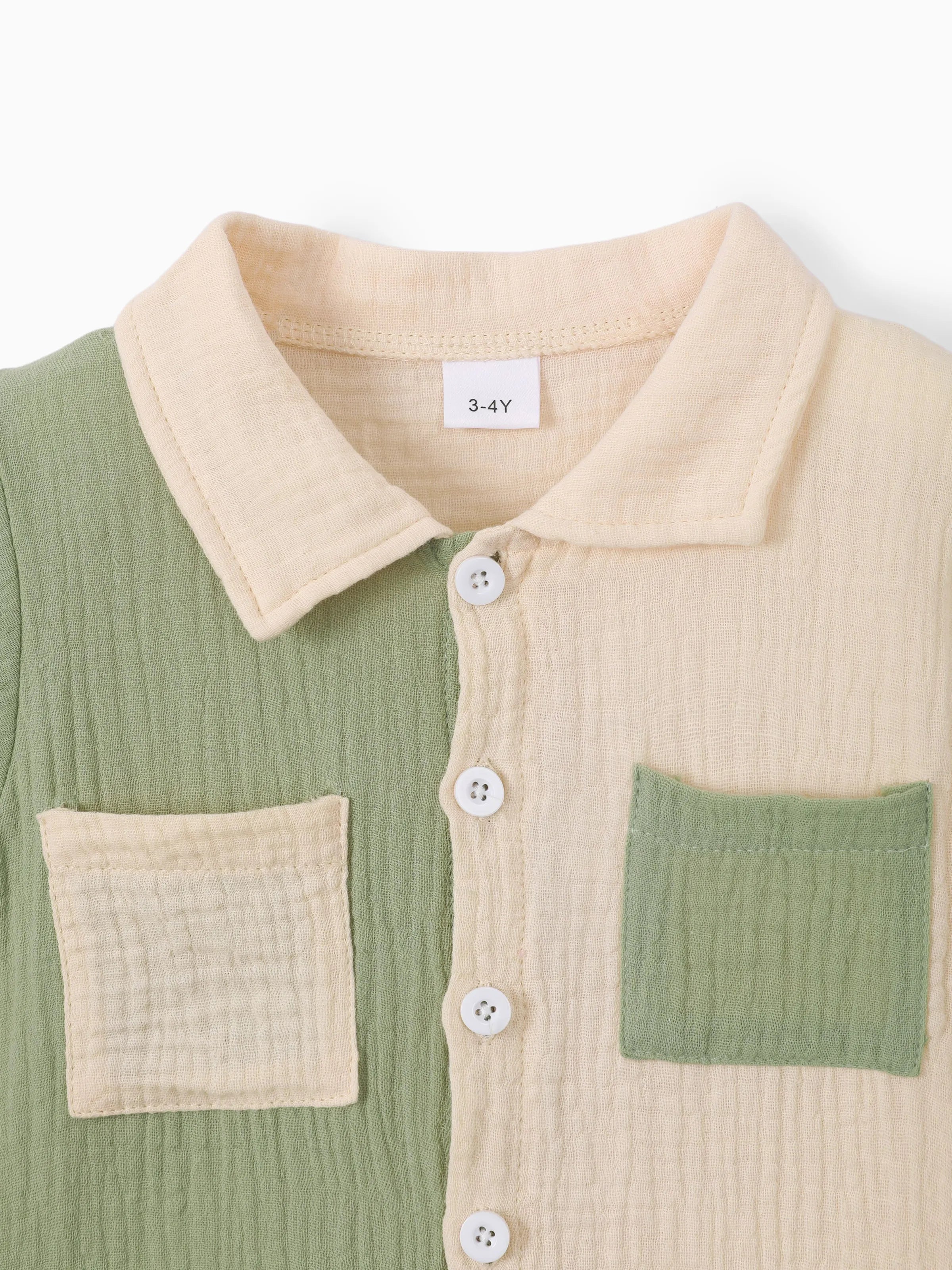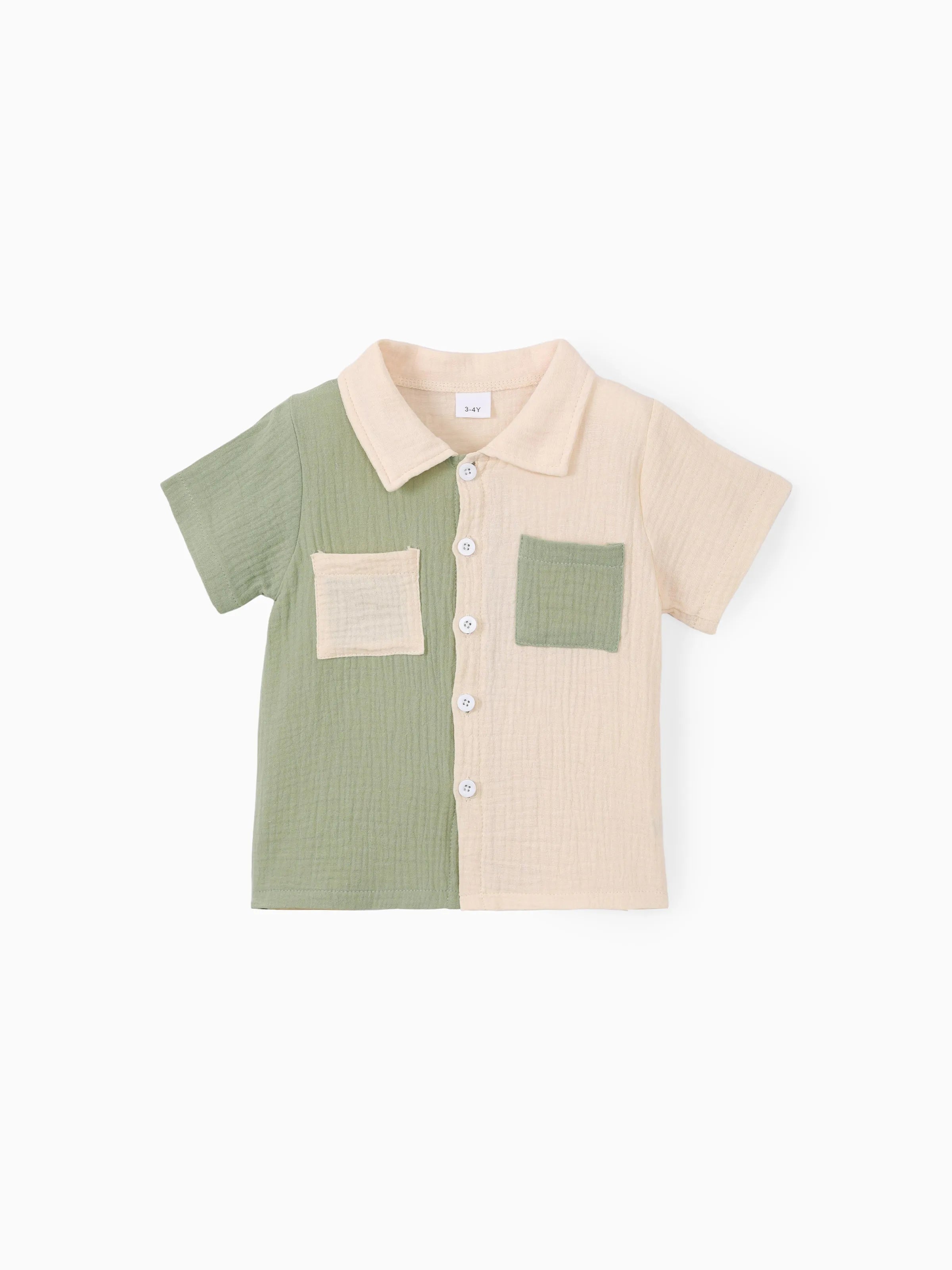 Kleinkind Junge 3-teiliges strukturiertes Revershemd und festes T-Shirt und Shorts Set Farbblock