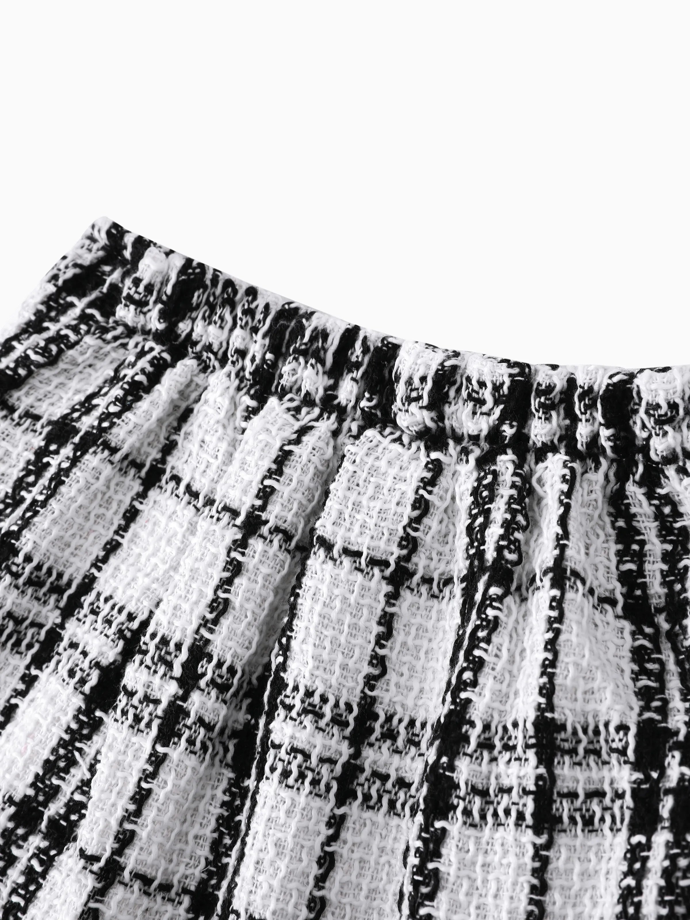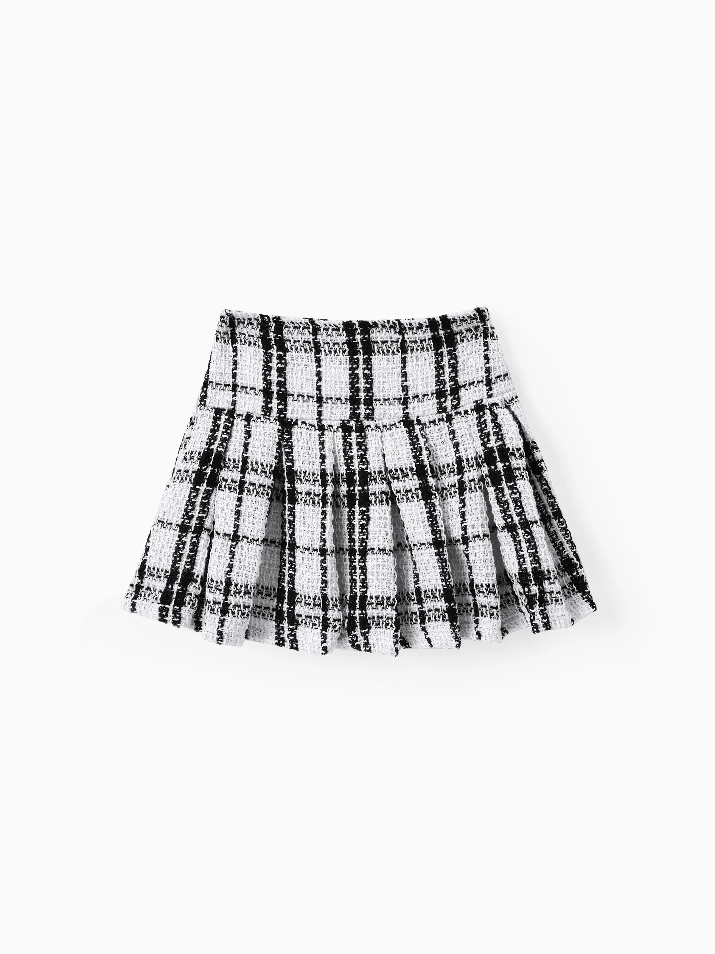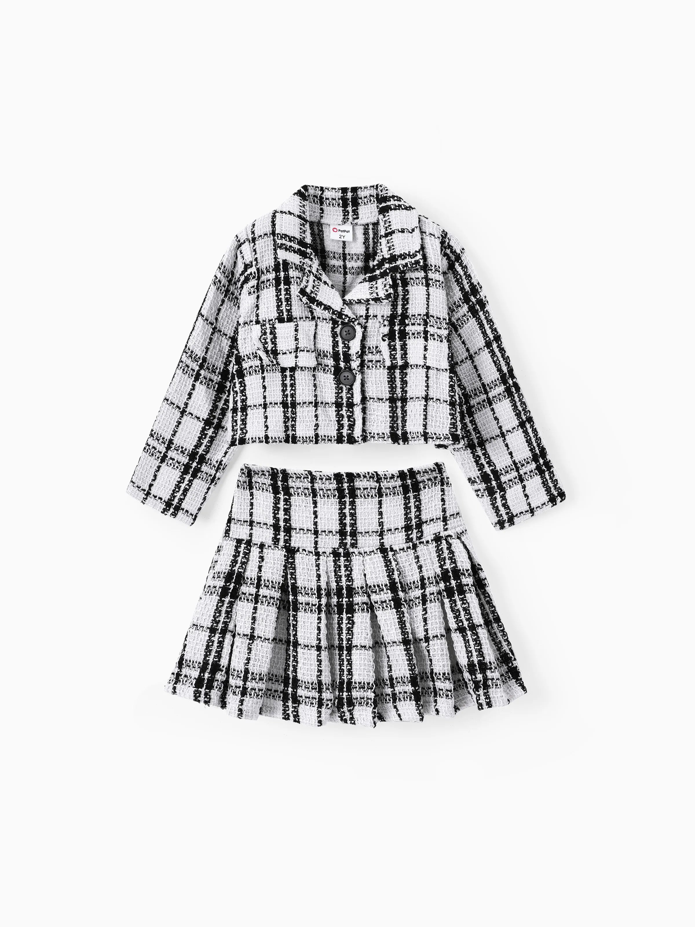 Un conjunto elegante y moderno compuesto por una chaqueta y una falda con diseño de cuadros, perfecto para el invierno y las salidas diarias.