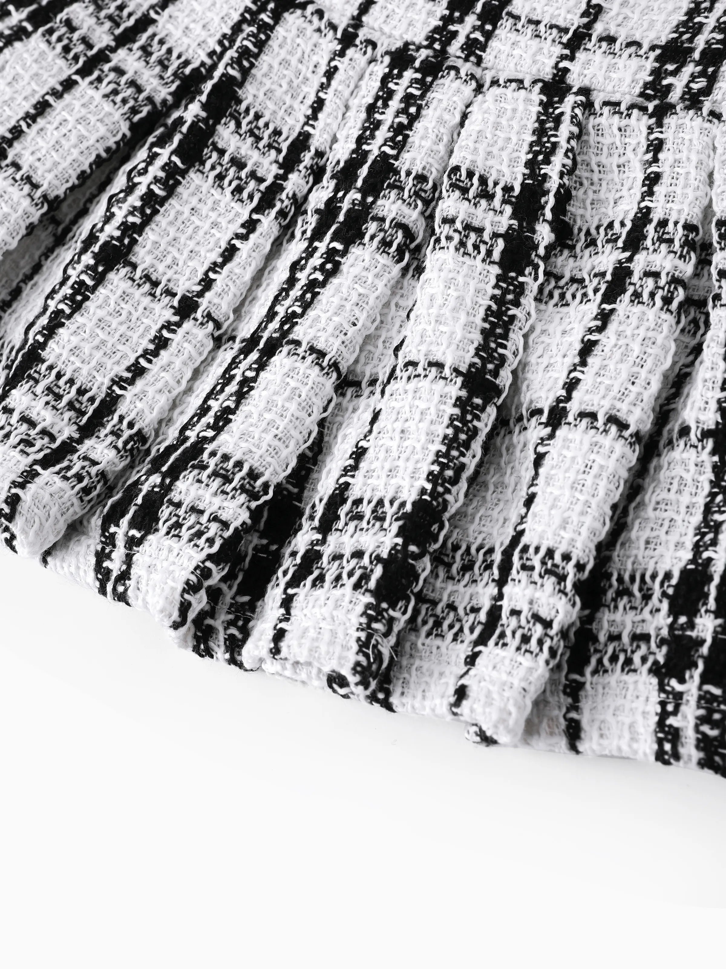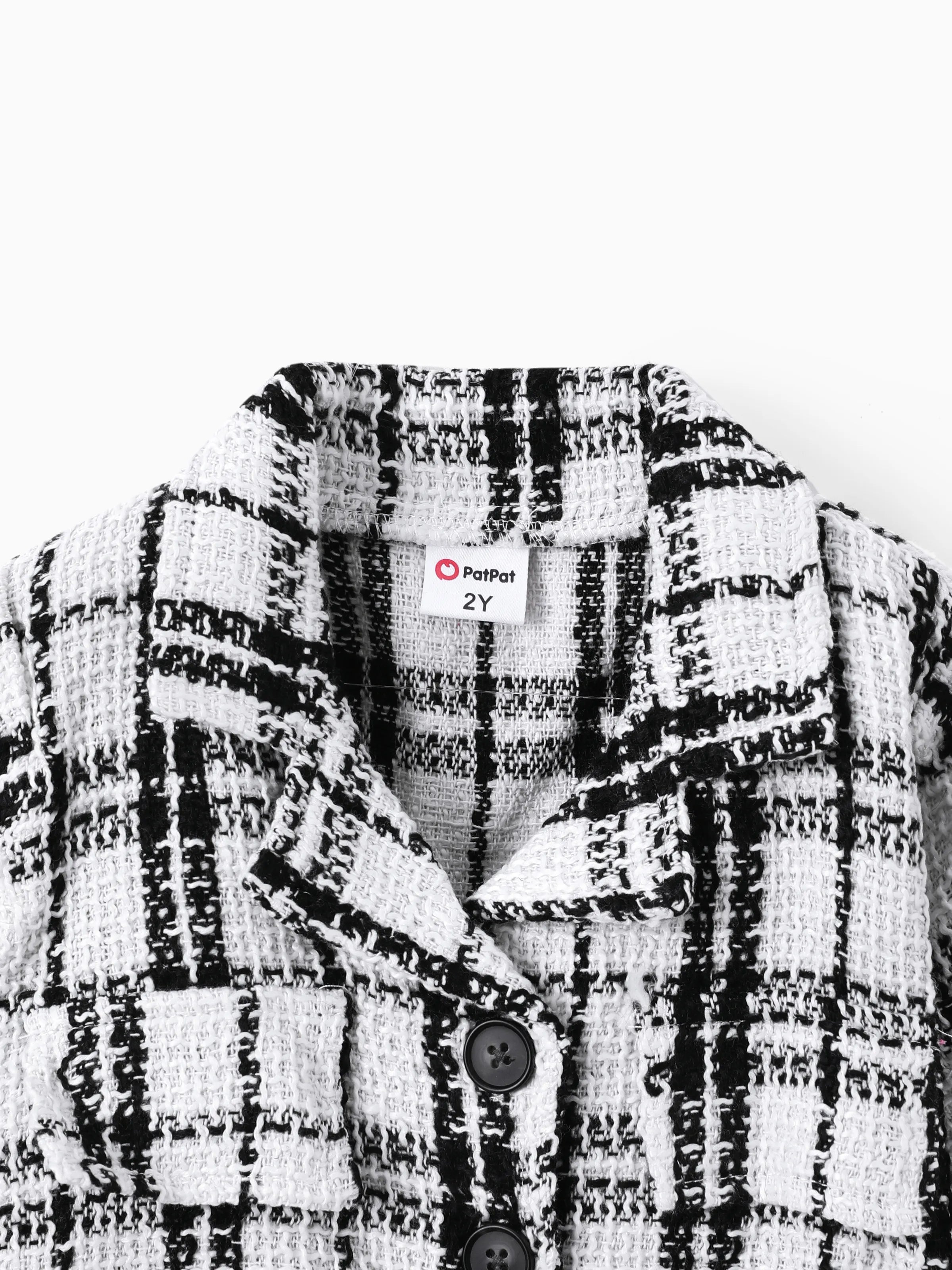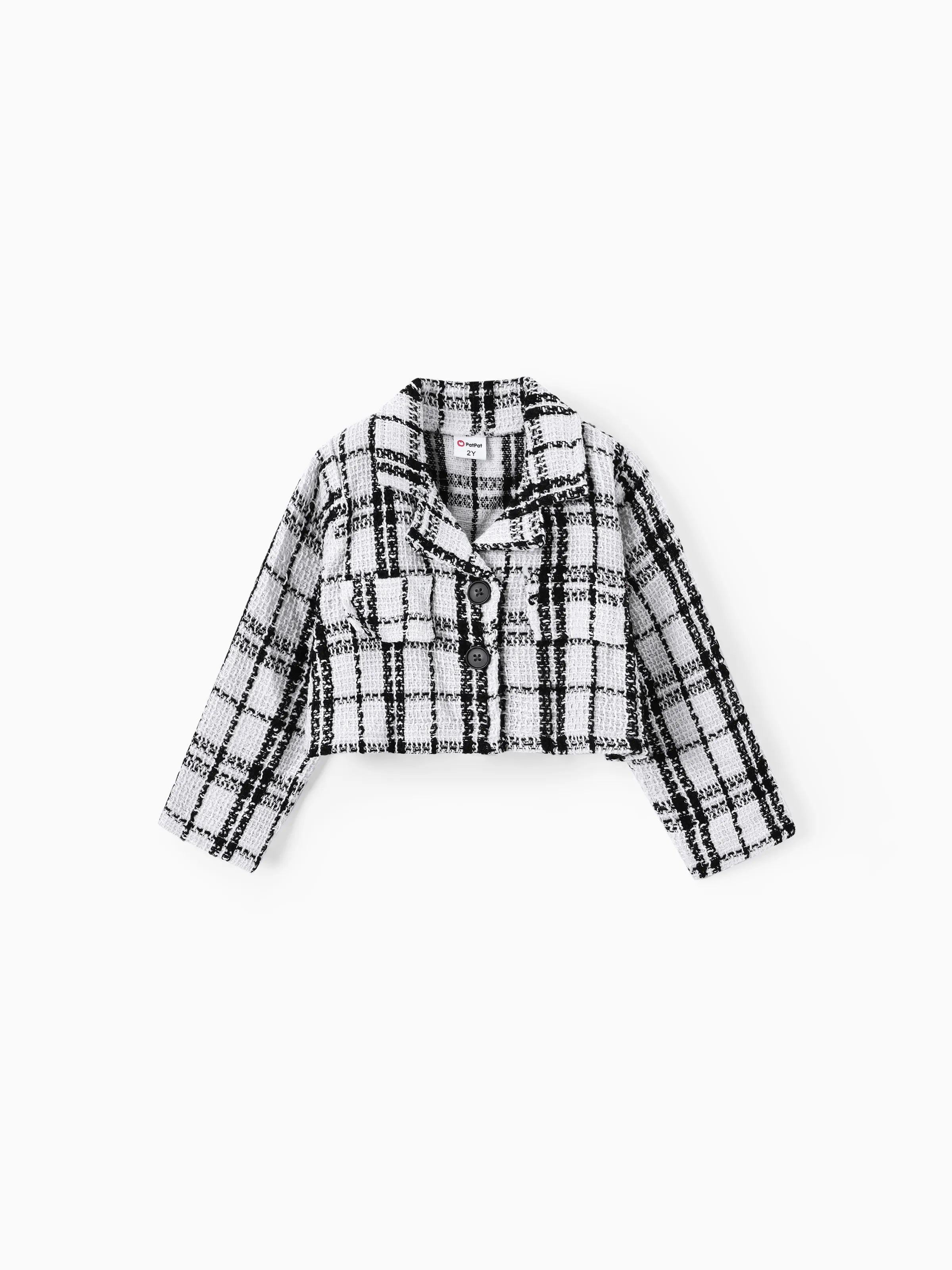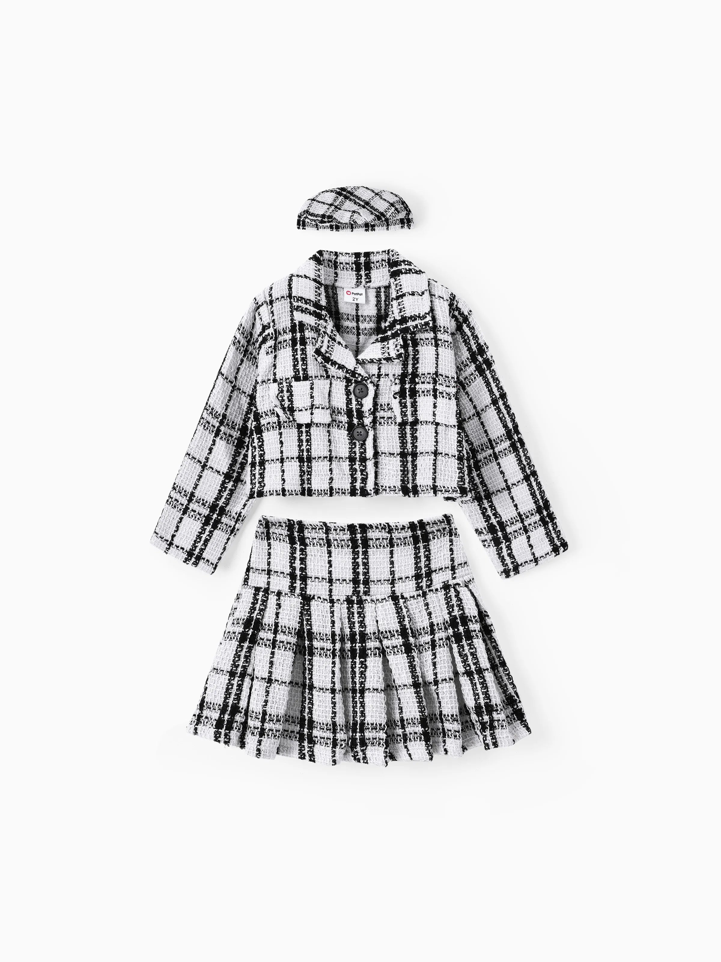 Un conjunto elegante y moderno compuesto por una chaqueta y una falda con diseño de cuadros, perfecto para el invierno y las salidas diarias.