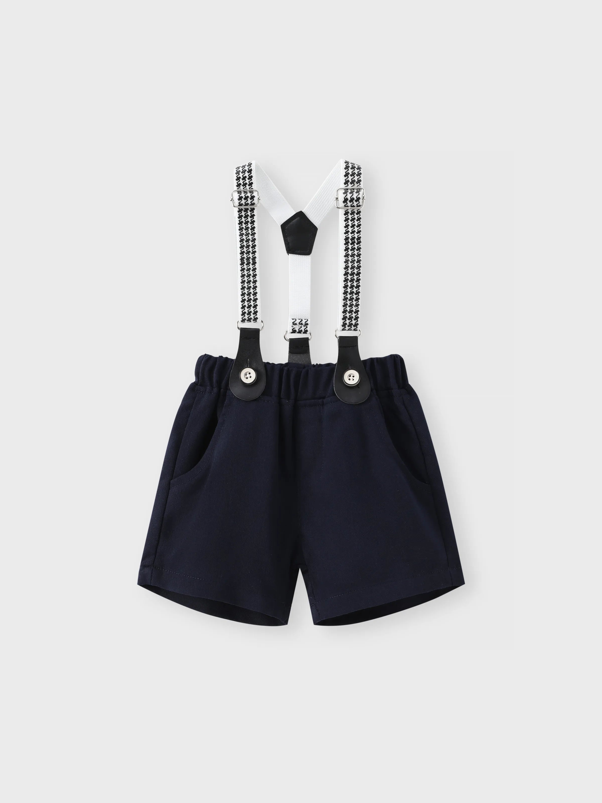 Conjunto de camisa con pajarita y pantalones cortos con tirantes para fiesta de bebé niño, azul oscuro