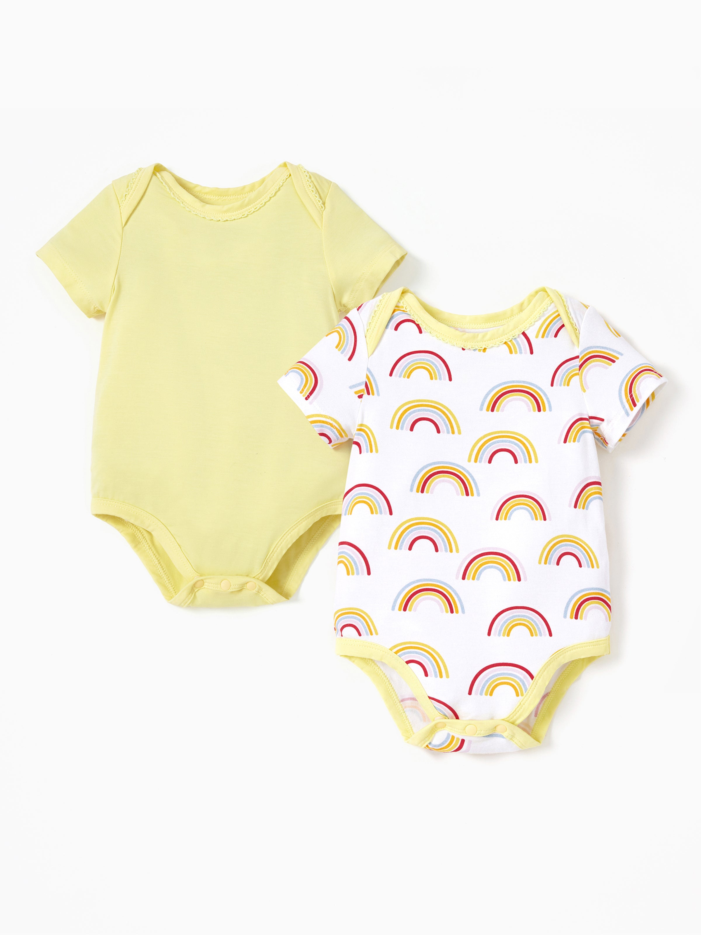 Este conjunto incluye un romper amarillo sólido y un romper amarillo impreso, ambos con mangas cortas, cuello redondo, ajuste moderado y longitud regular para un estilo básico y versátil.