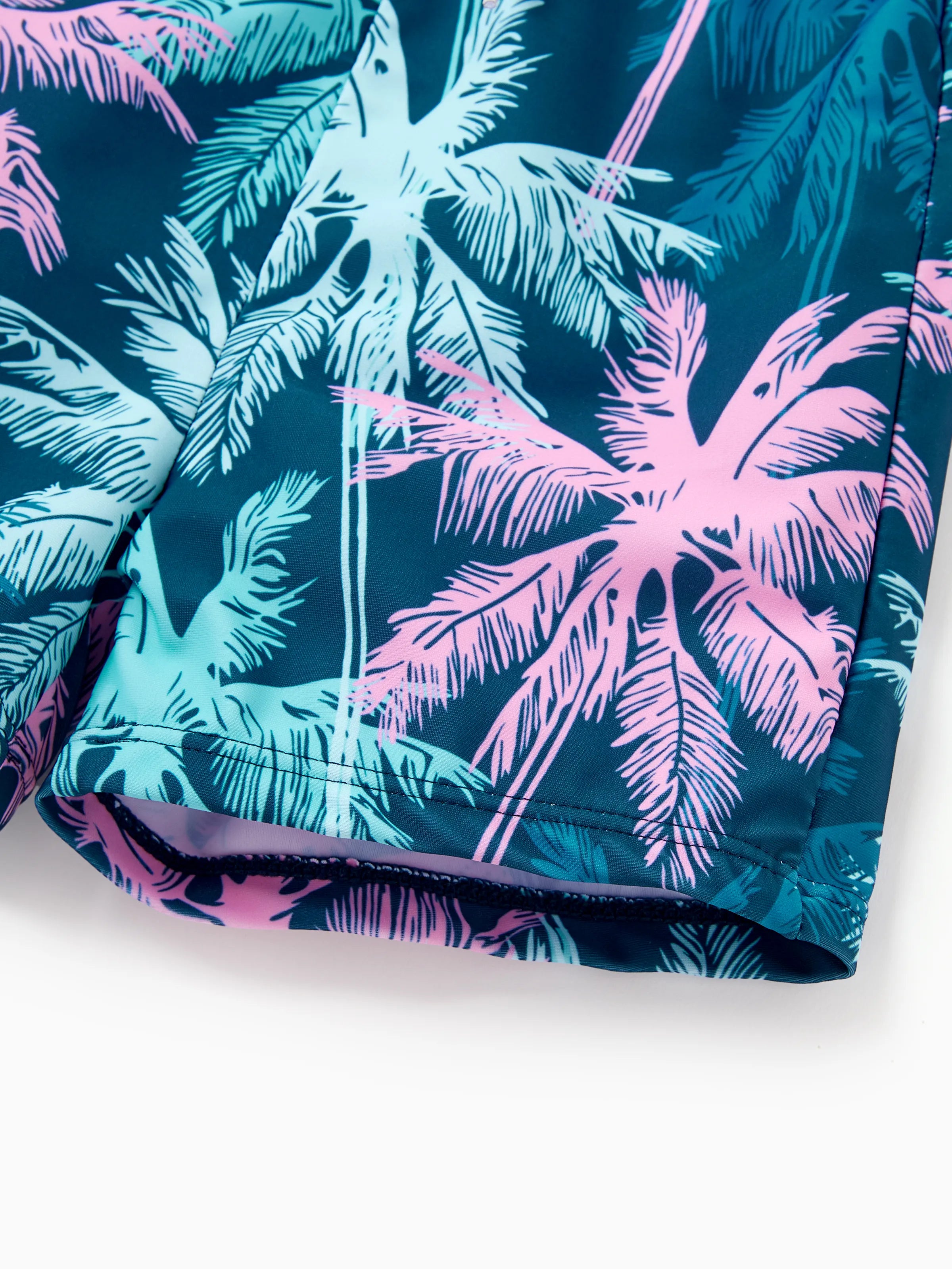 Daddy & Son Swimsuits Tropical Palm Tree Print,Daddy and Son Swim Trunks Set, Beach Vacation Swimwear Turquoise