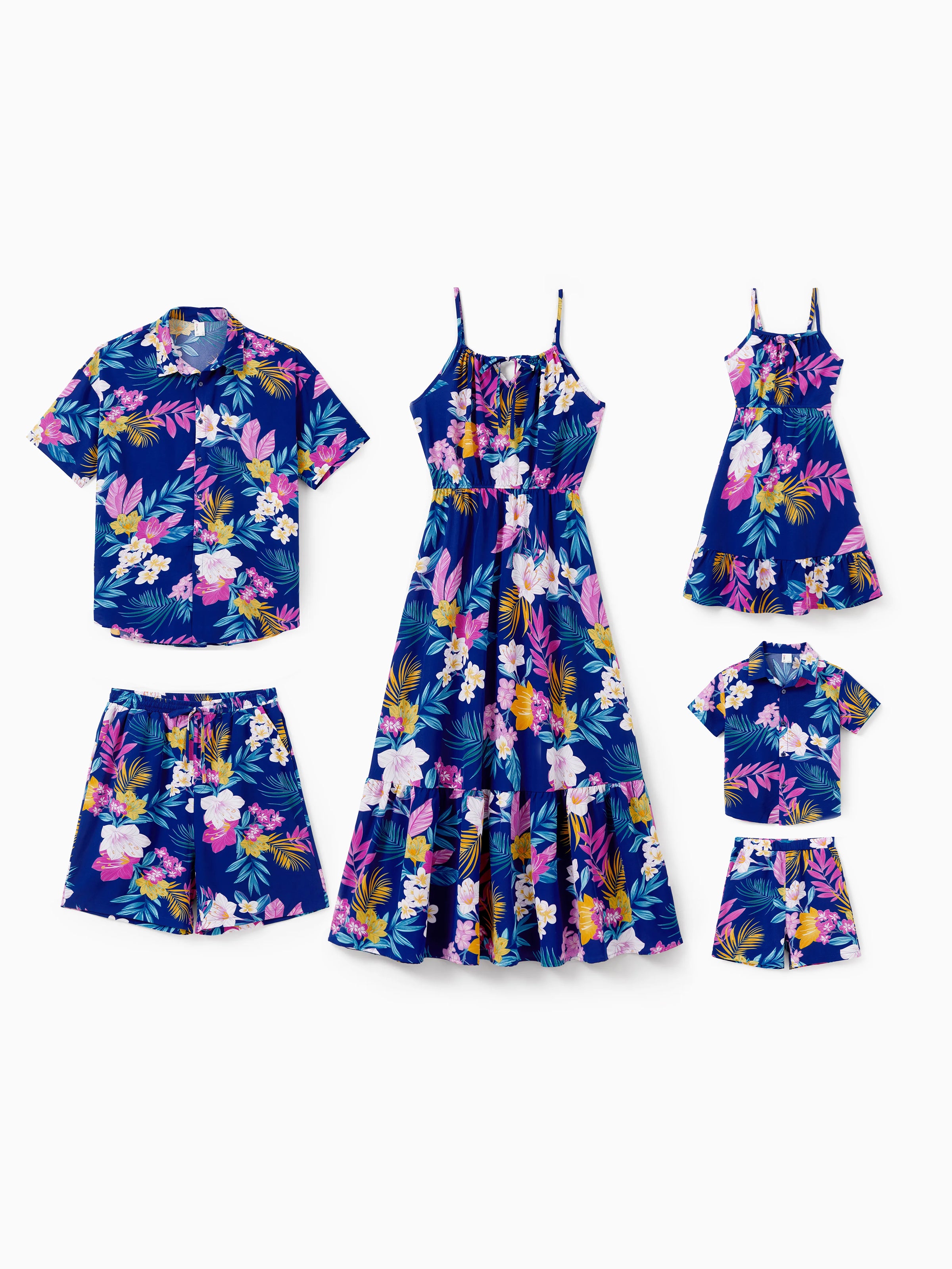 Diseñado para vacaciones en la playa, fotos familiares, vacaciones de verano o escapadas tropicales, este conjunto coordinado incluye piezas para mamá, papá, niñas y niños, todas en un audaz estampado floral hawaiano sobre un rico fondo azul marino.