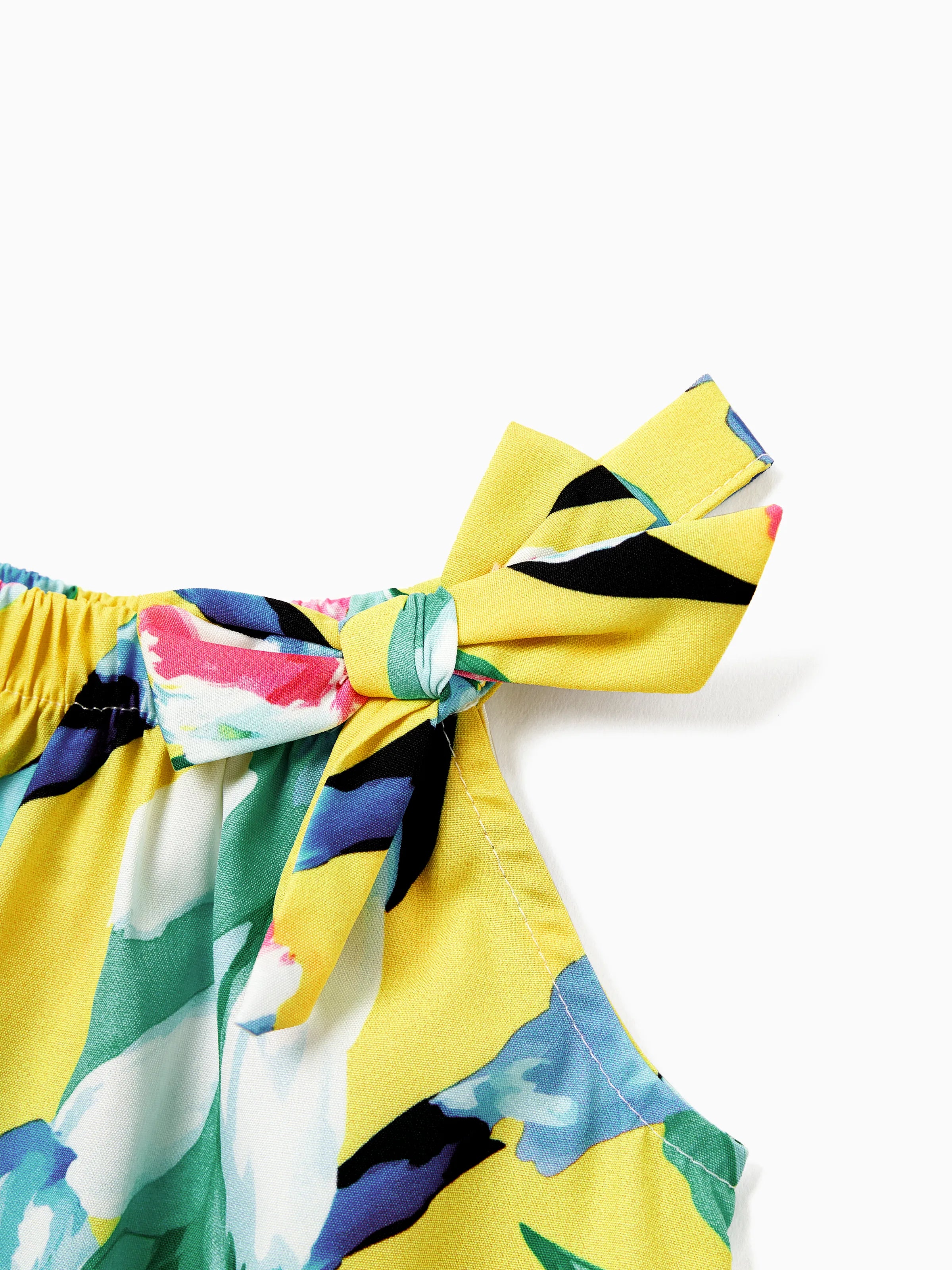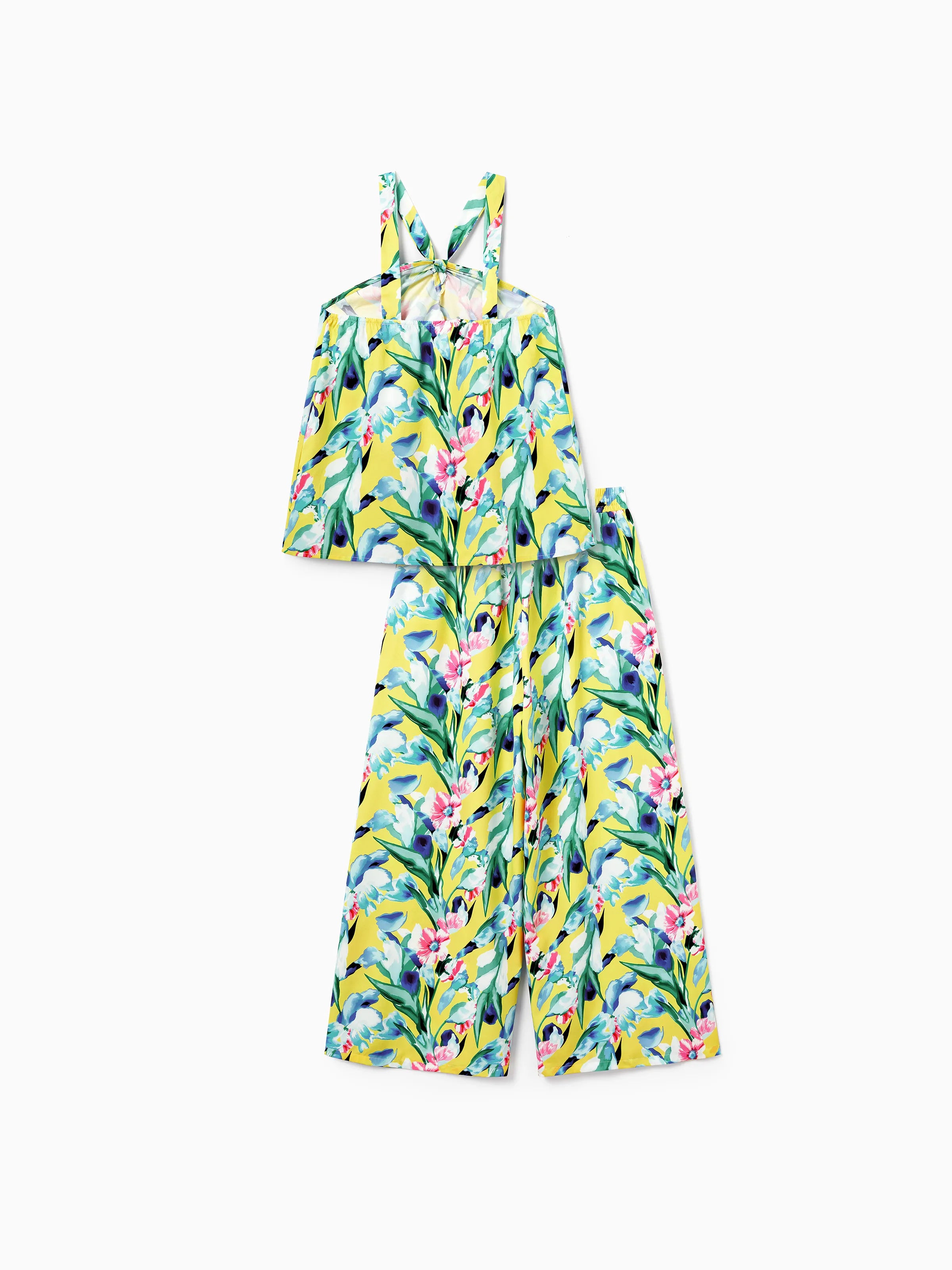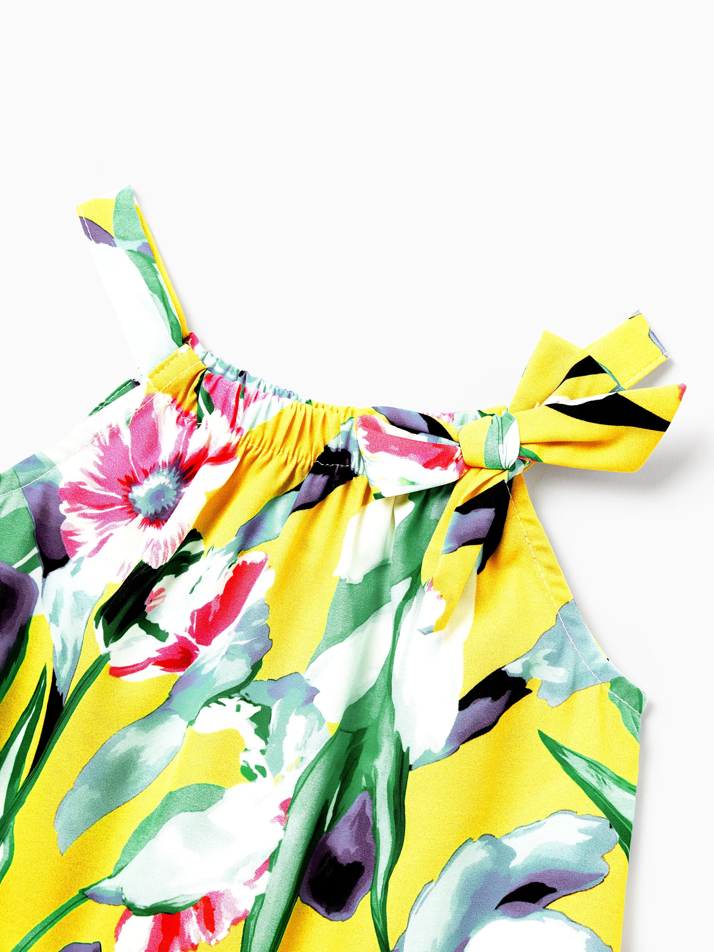 Mommy and Me Casual Outfits Floral Print Camisole Top and Wide-leg Pants Set for Mom Strappy Dress for girl, Bodysuit for Baby Girl Yellow
