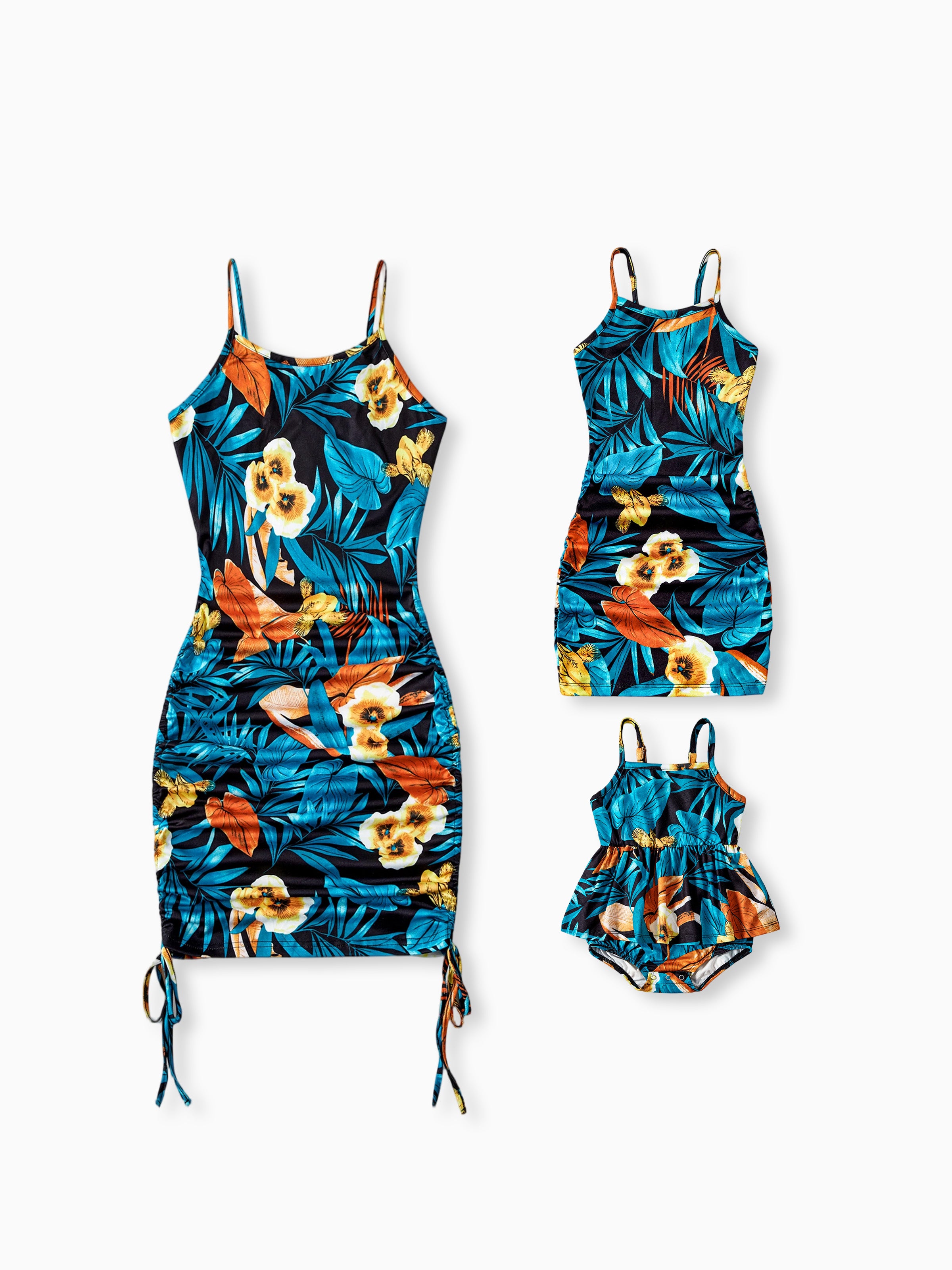 Mommy & me Floral Ruched Drawstring Side Strap Dress Sets Black