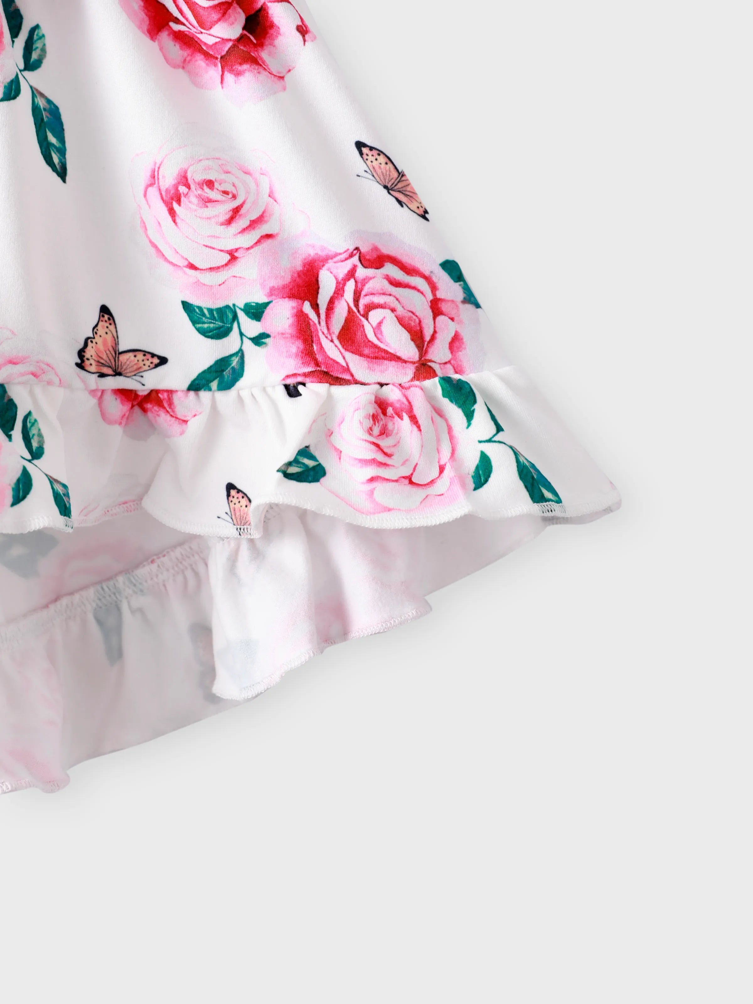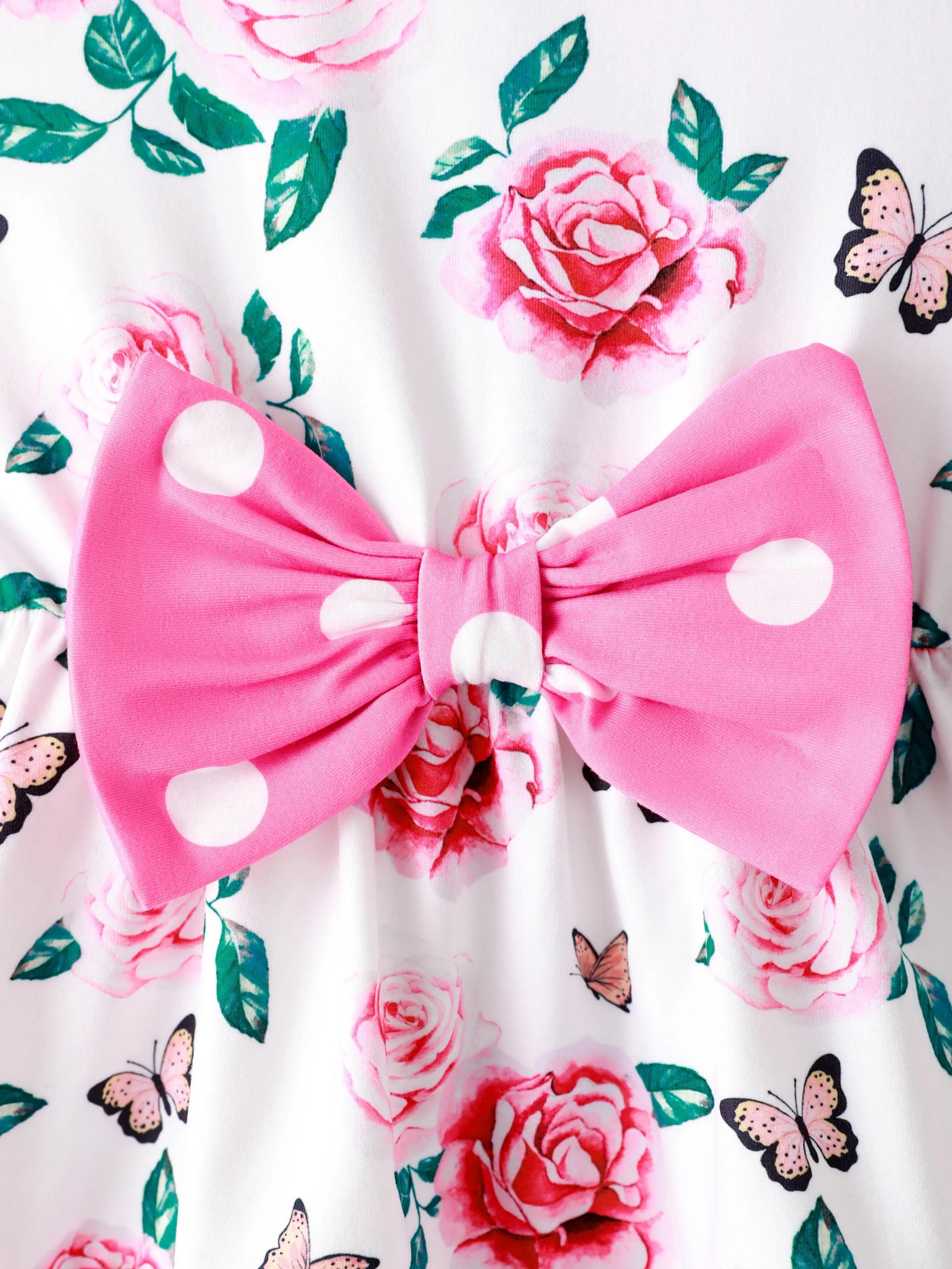 Un ensemble 2 pièces doux et hyper tactile pour petite fille, imprimé floral, avec nœud papillon, volants, haut et bas, sans manches, et un pantalon à pois, parfait pour toutes les occasions estivales.