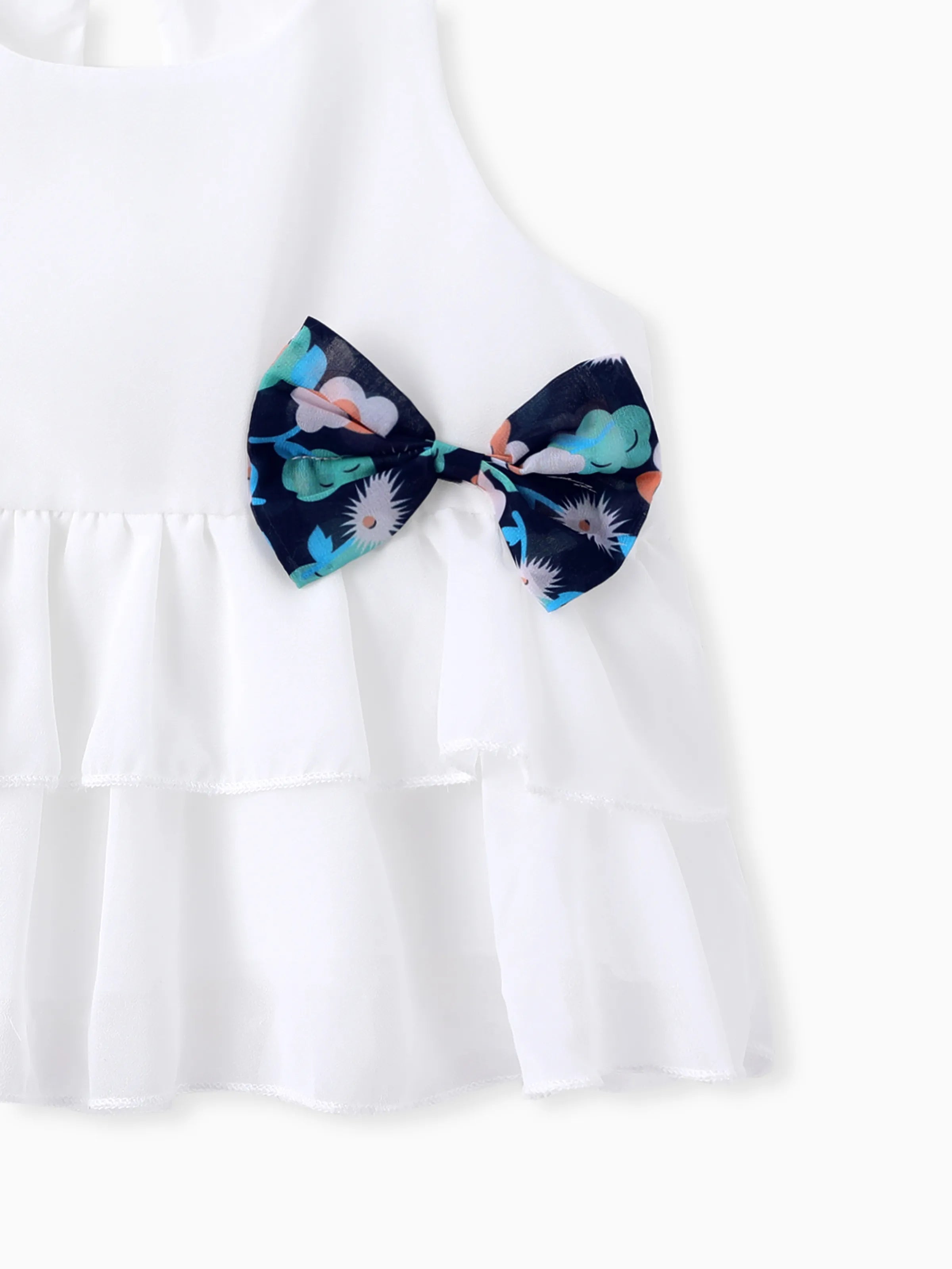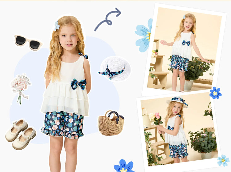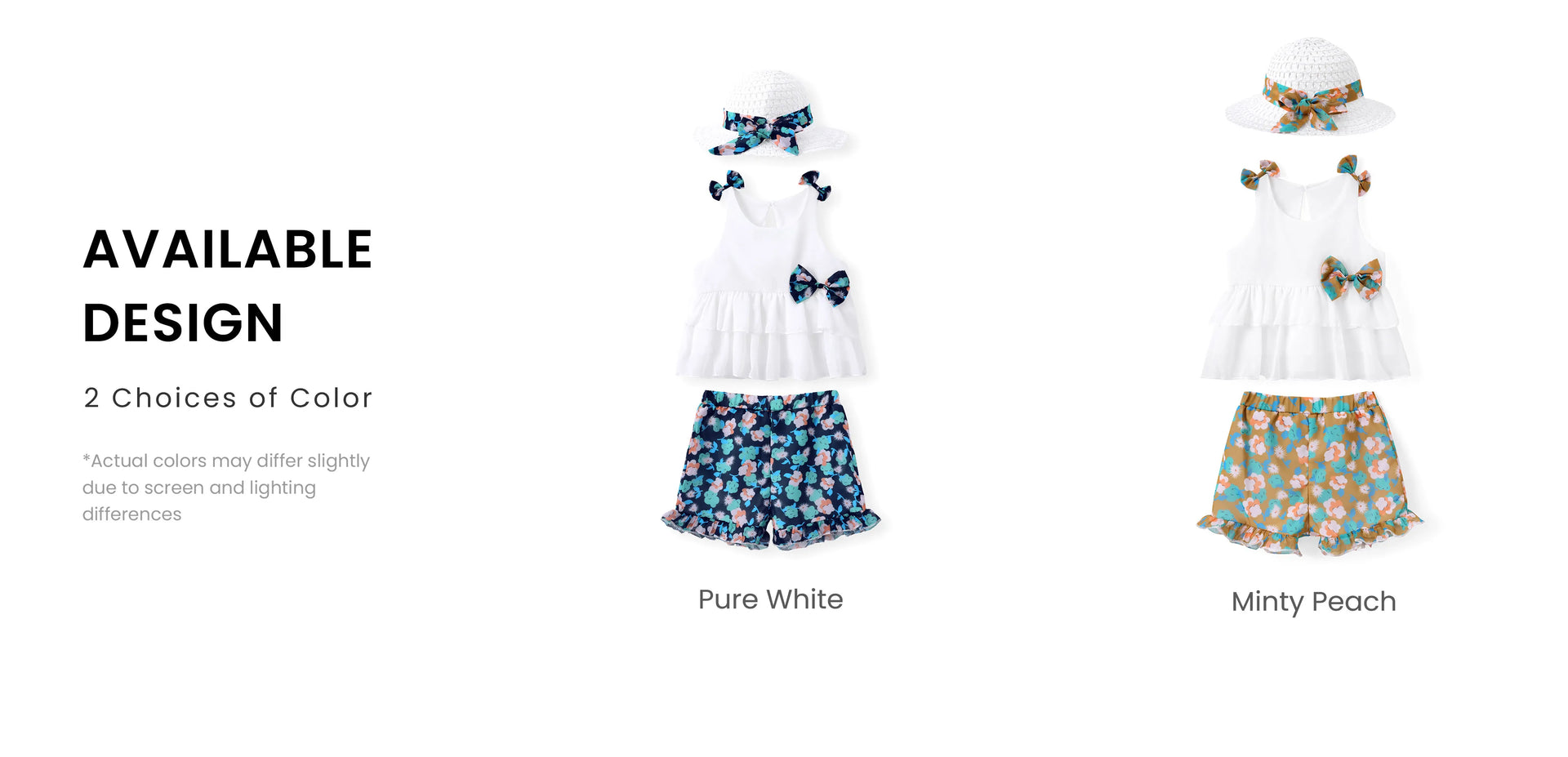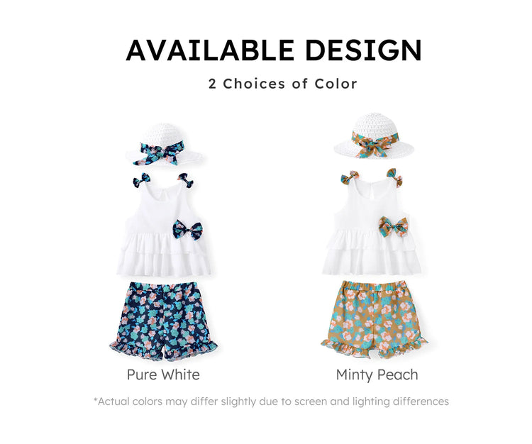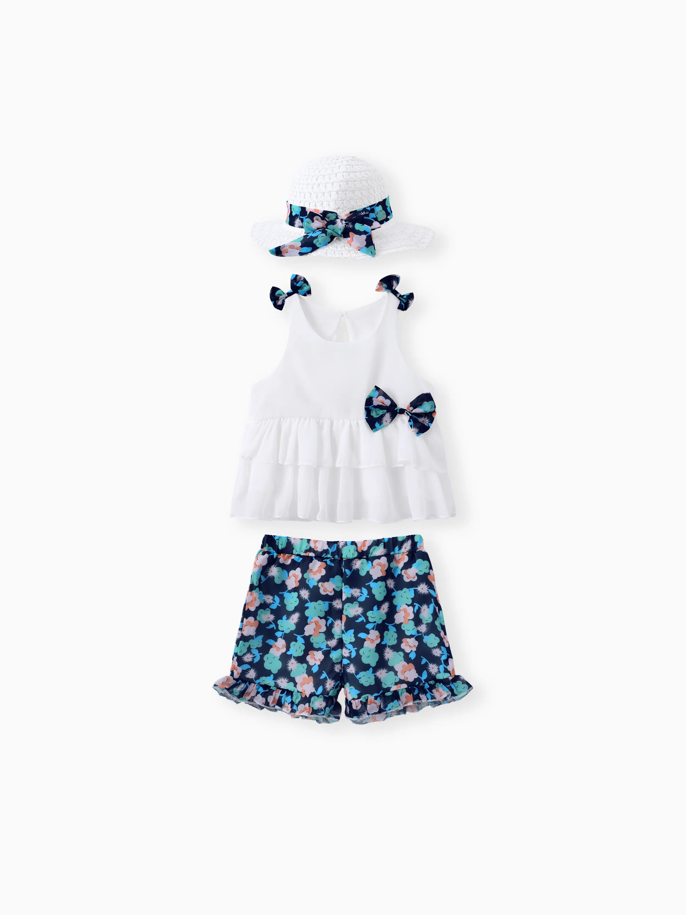 Ensemble 3 pièces pour petite fille avec chapeau décoratif à nœud, débardeur à volants superposés et short à imprimé floral, blanc