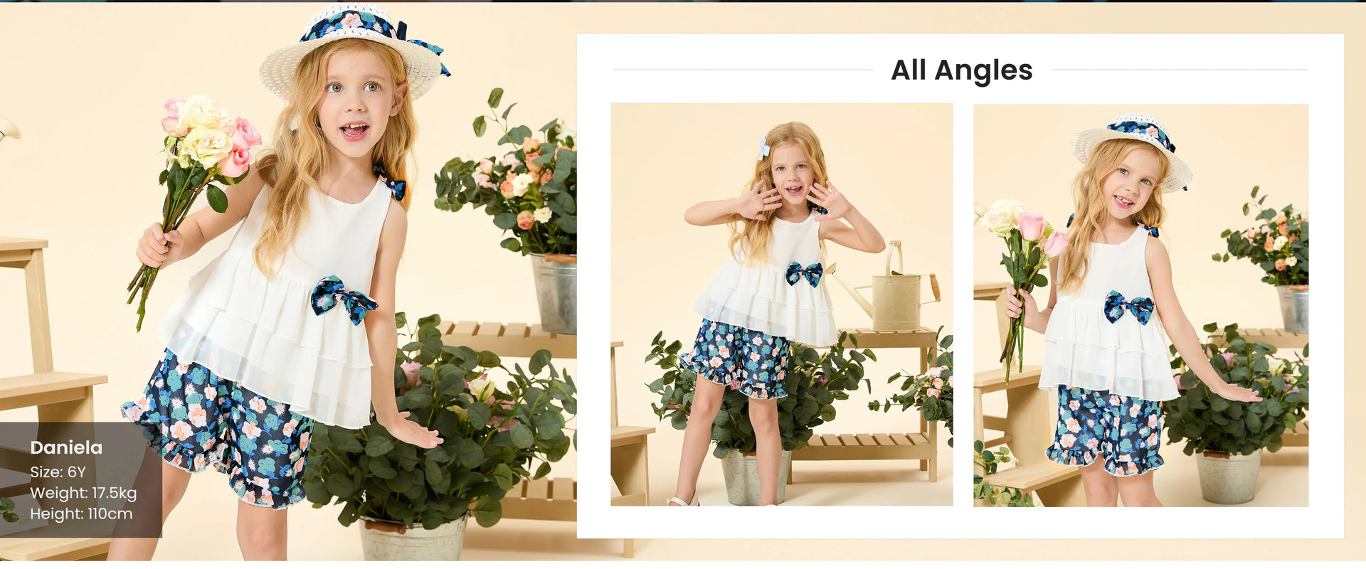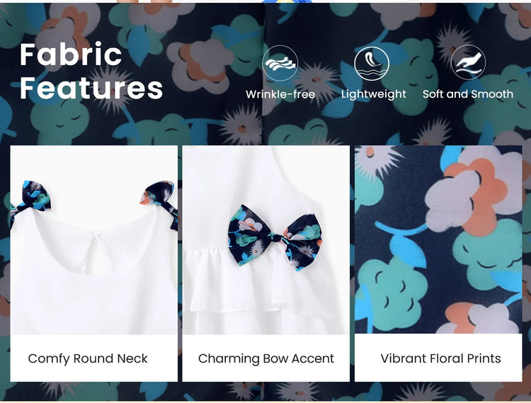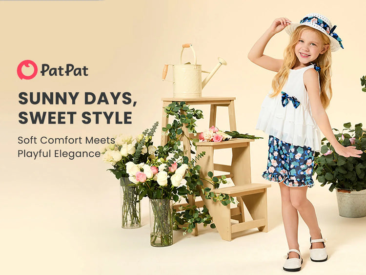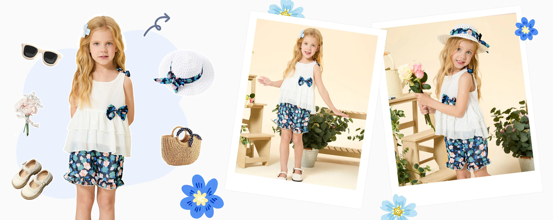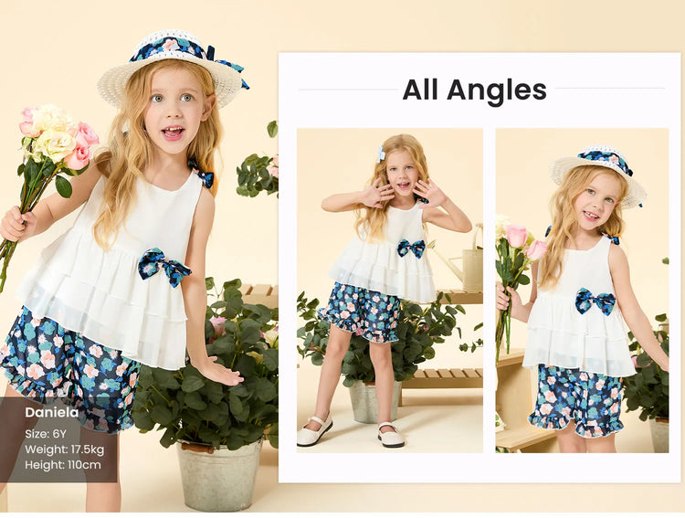 Ensemble 3 pièces pour petite fille avec chapeau décoratif à nœud, débardeur à volants superposés et short à imprimé floral, blanc