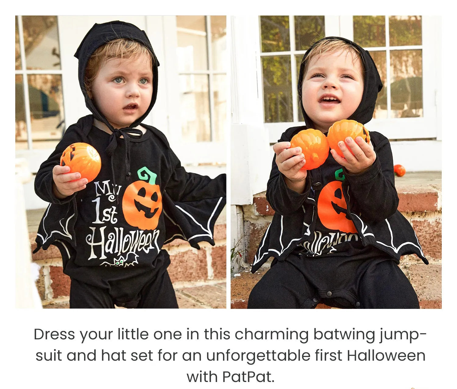 Adorable combinaison d'Halloween hyper-tactile avec chapeau 3D assorti.