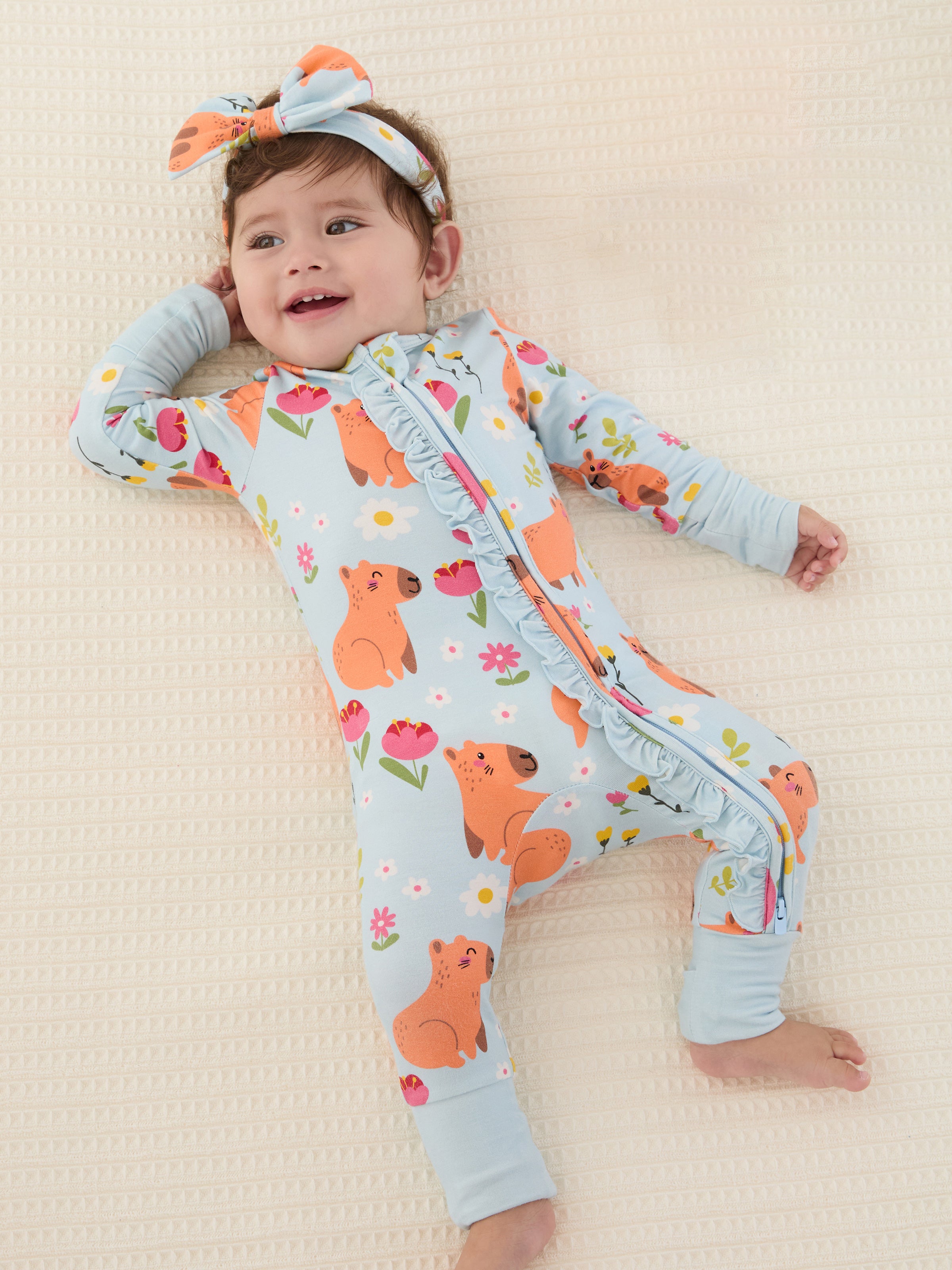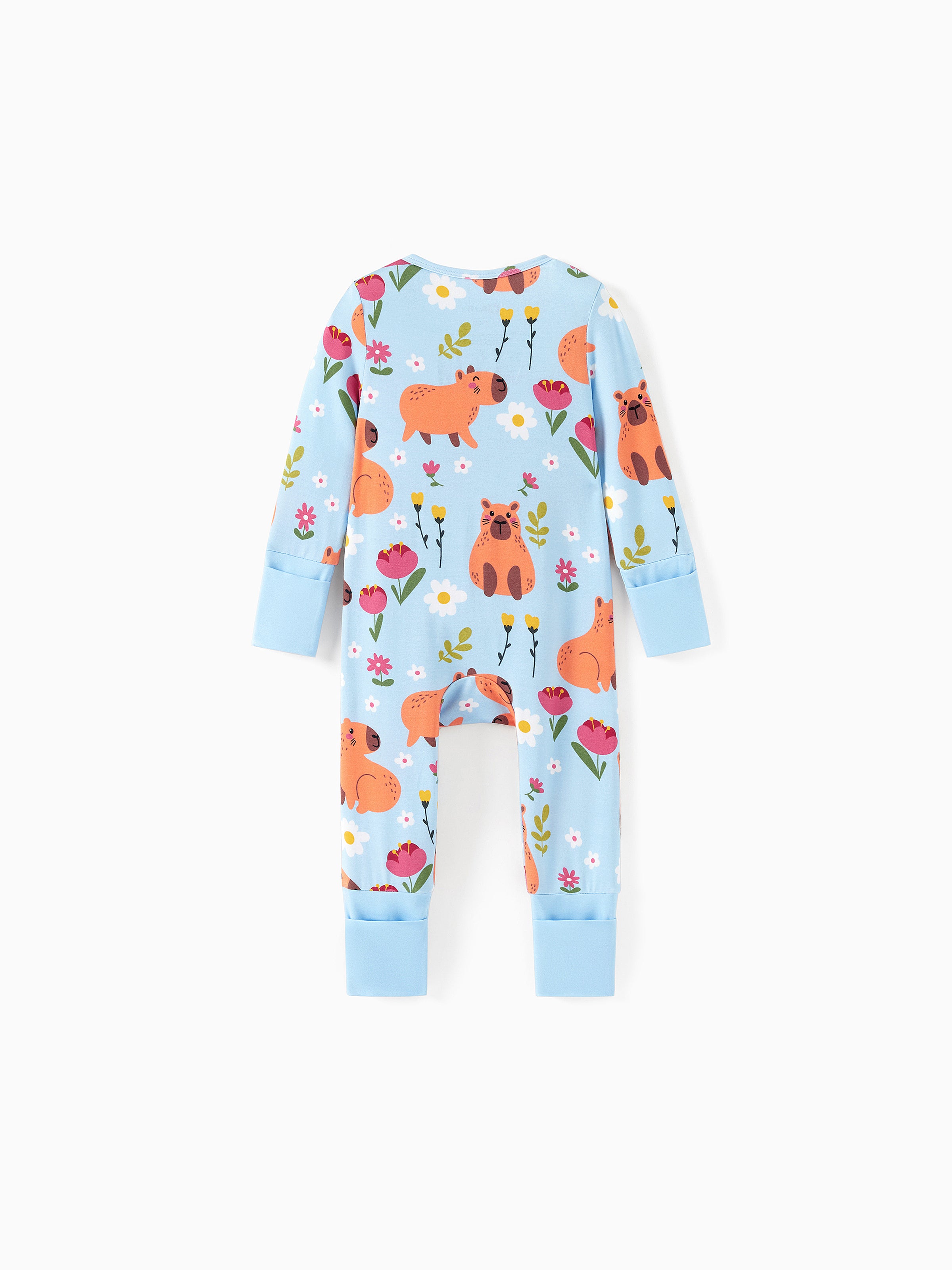 Grenouillère à manches longues et pieds, imprimée animaux, en bambou turquoise, avec fermeture éclair à double sens et bandeau.