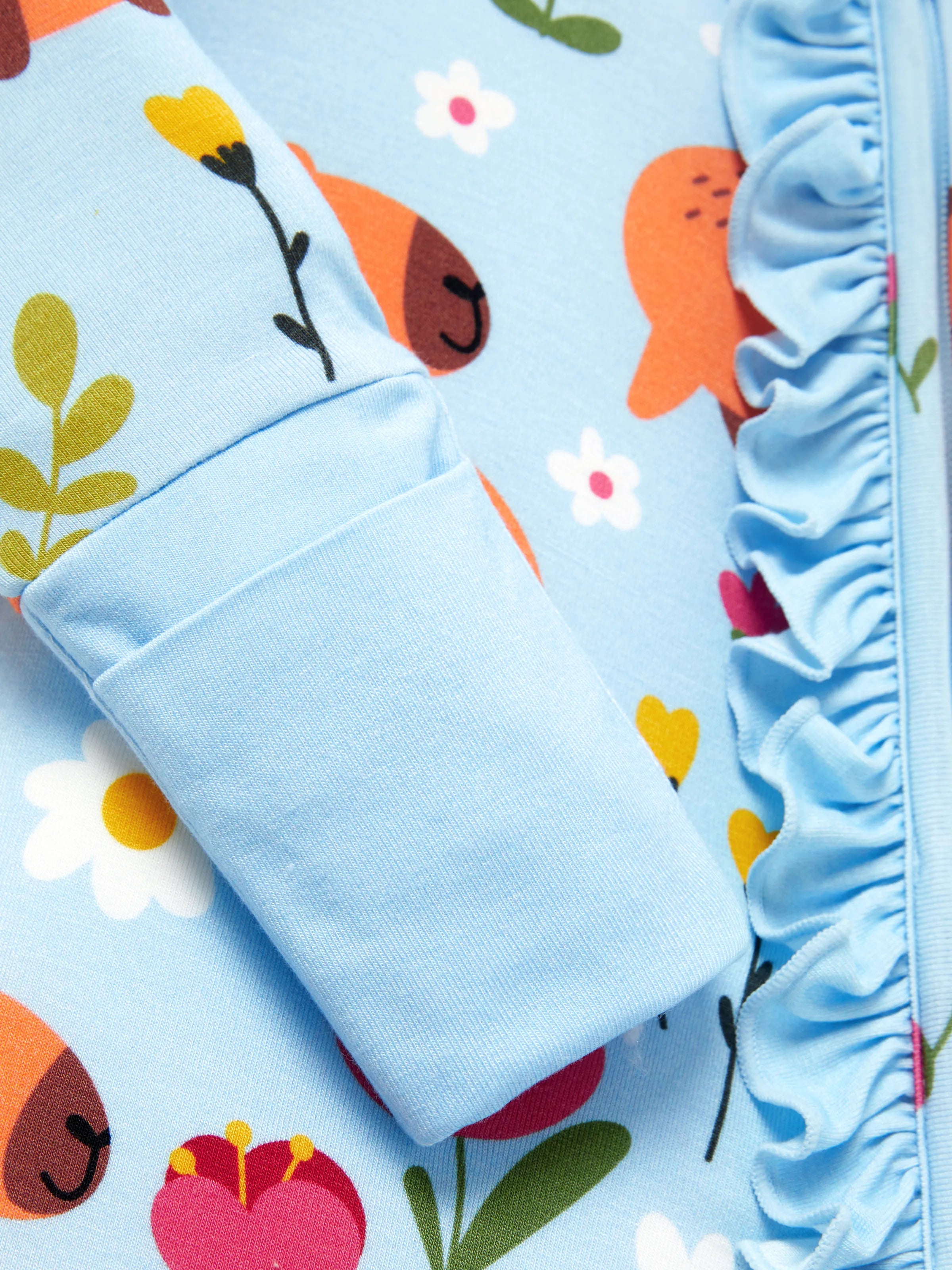 Grenouillère en bambou pour bébé garçon/fille, imprimé animal, fermeture éclair à double sens, antidérapante, manches longues, avec serre-tête, turquoise