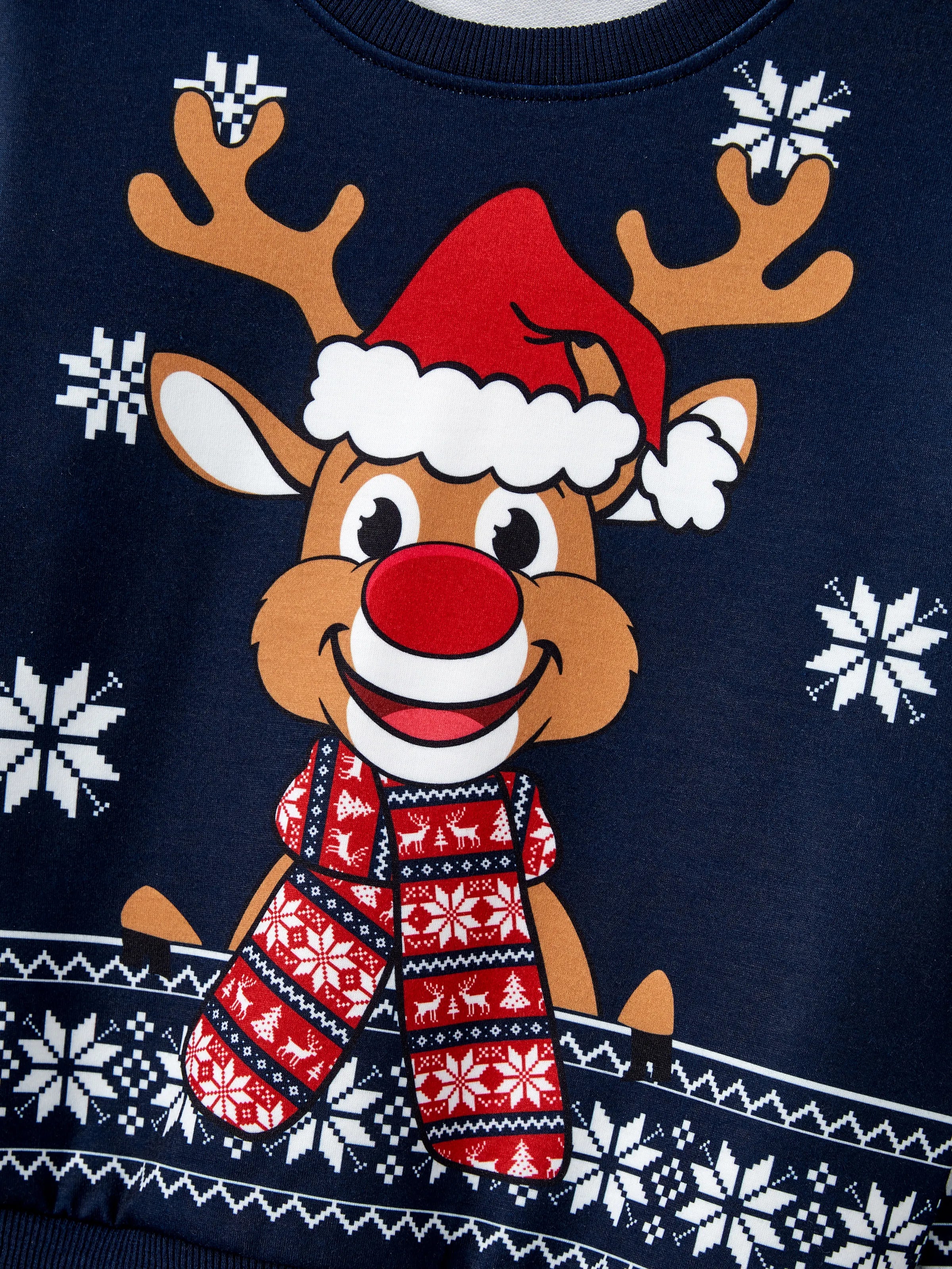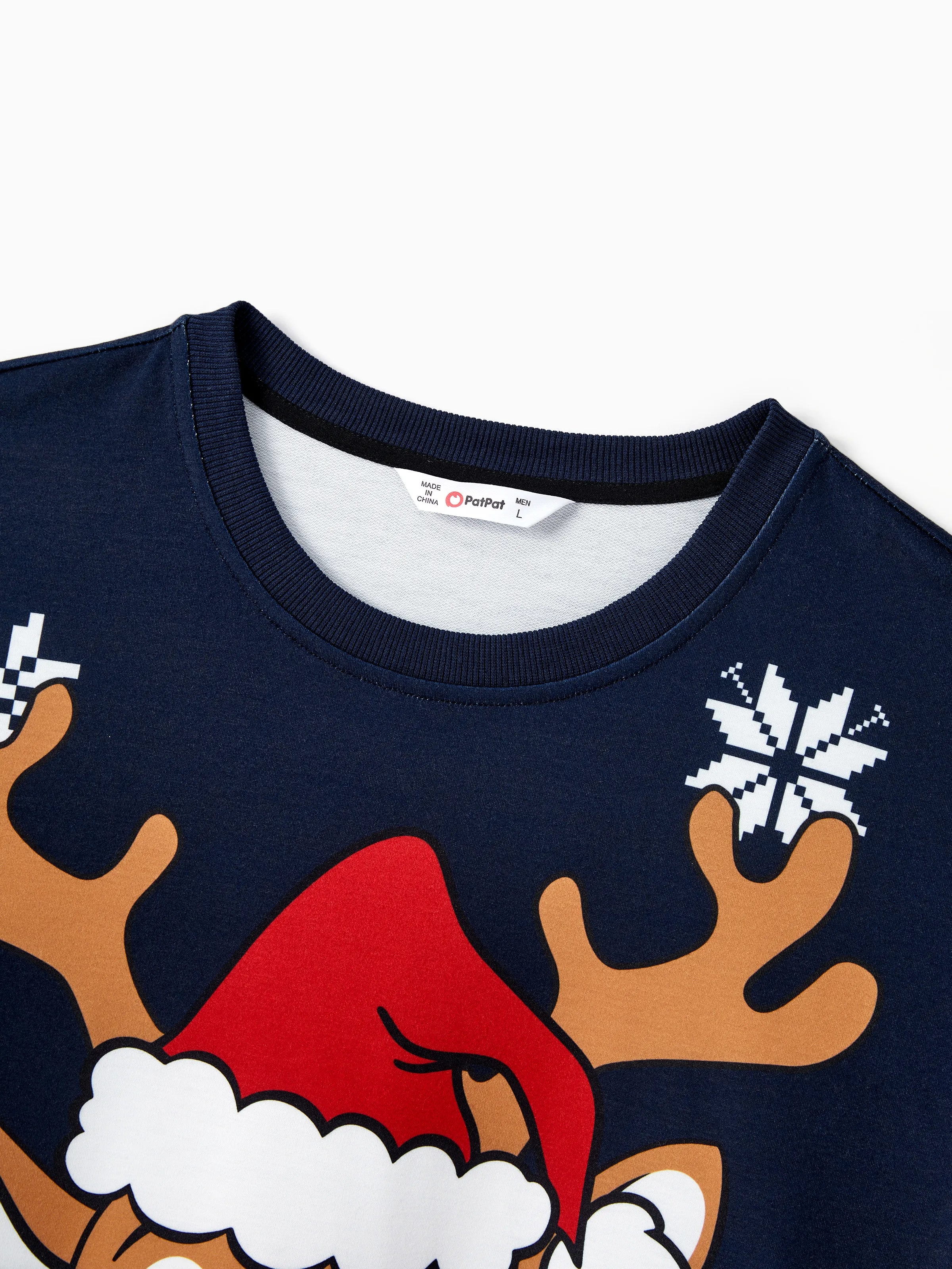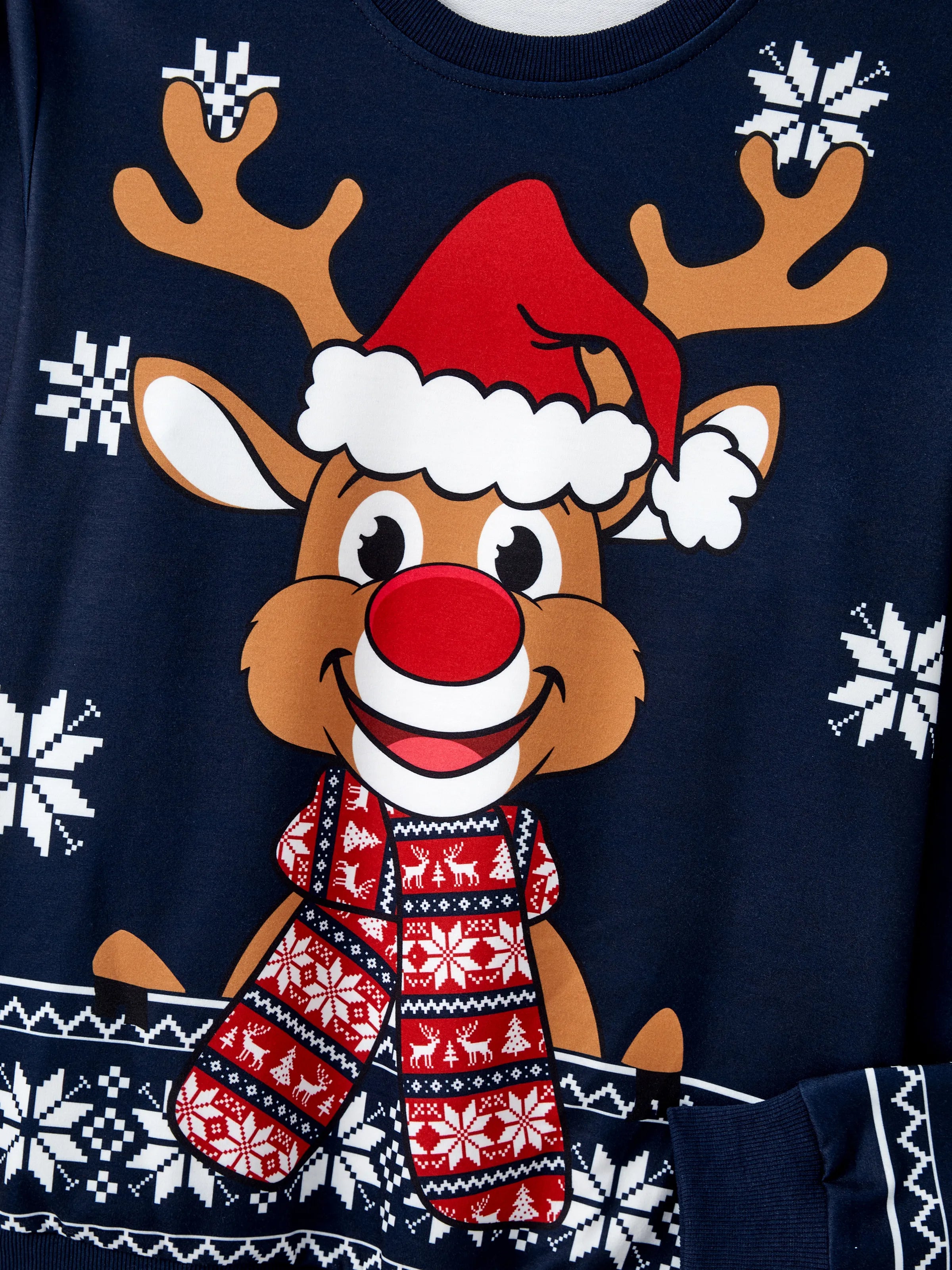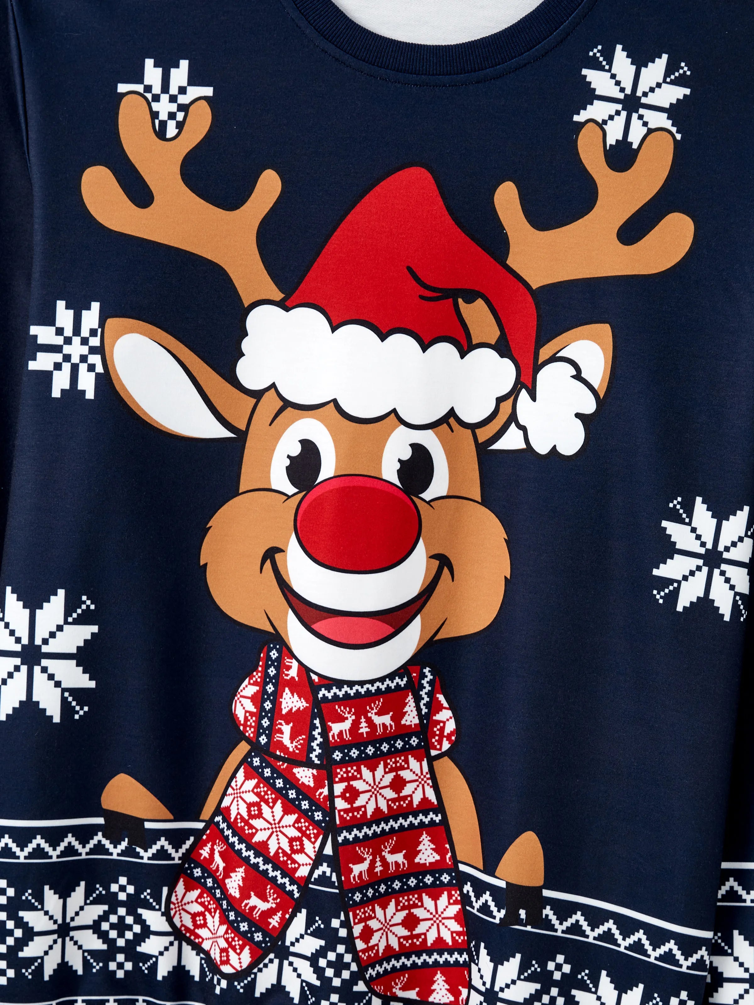 Haut à manches longues bleu foncé pour la famille, motif renne et flocon de neige