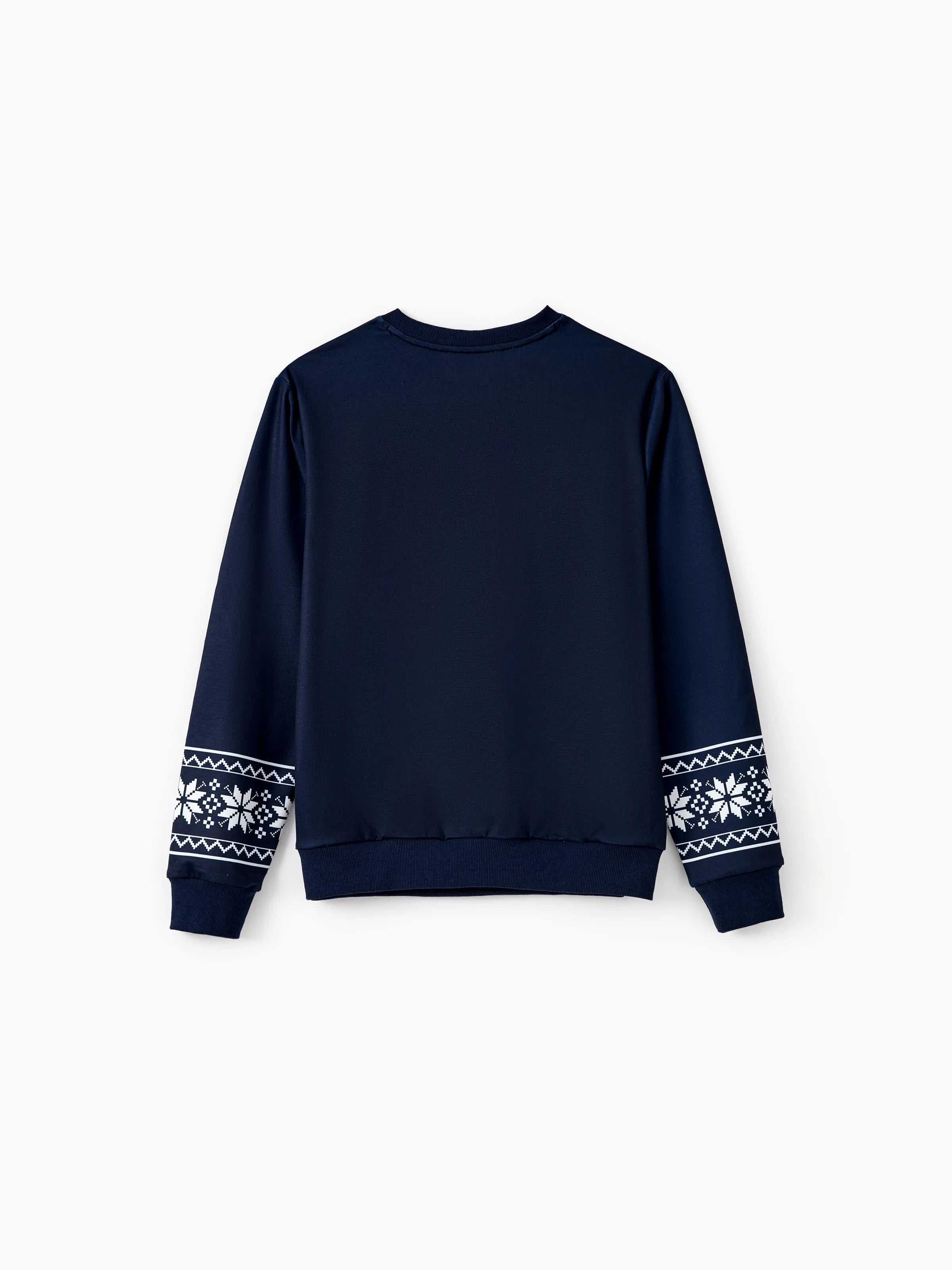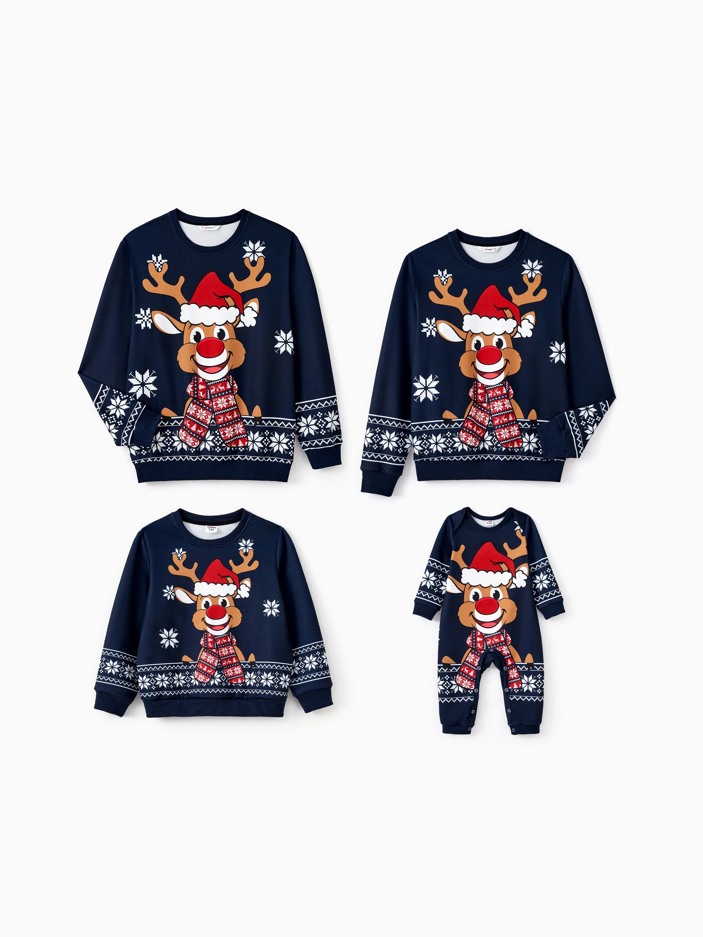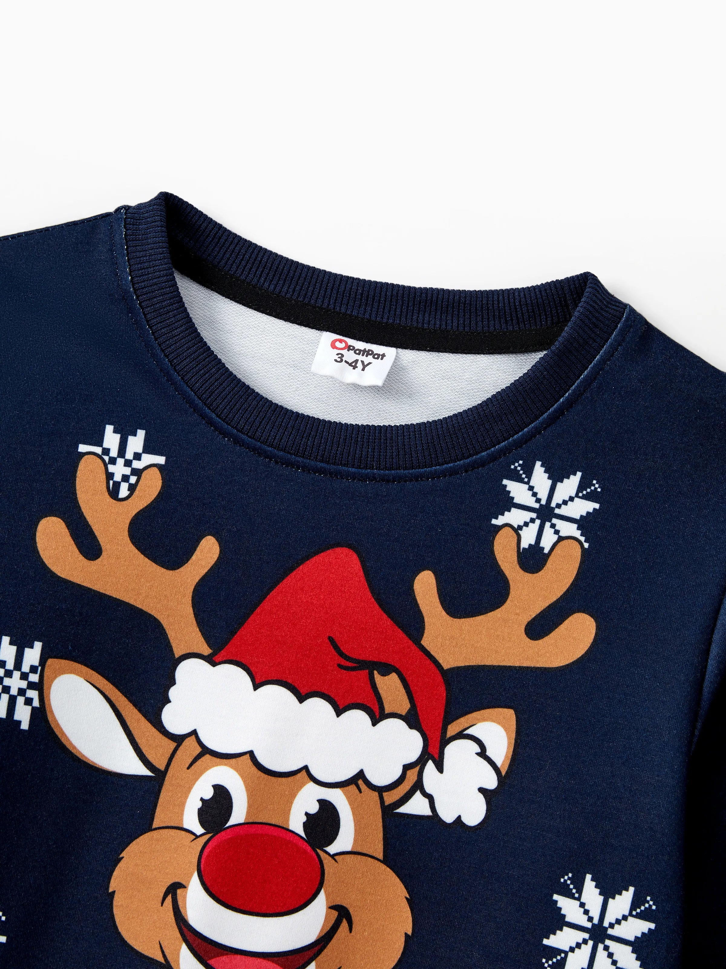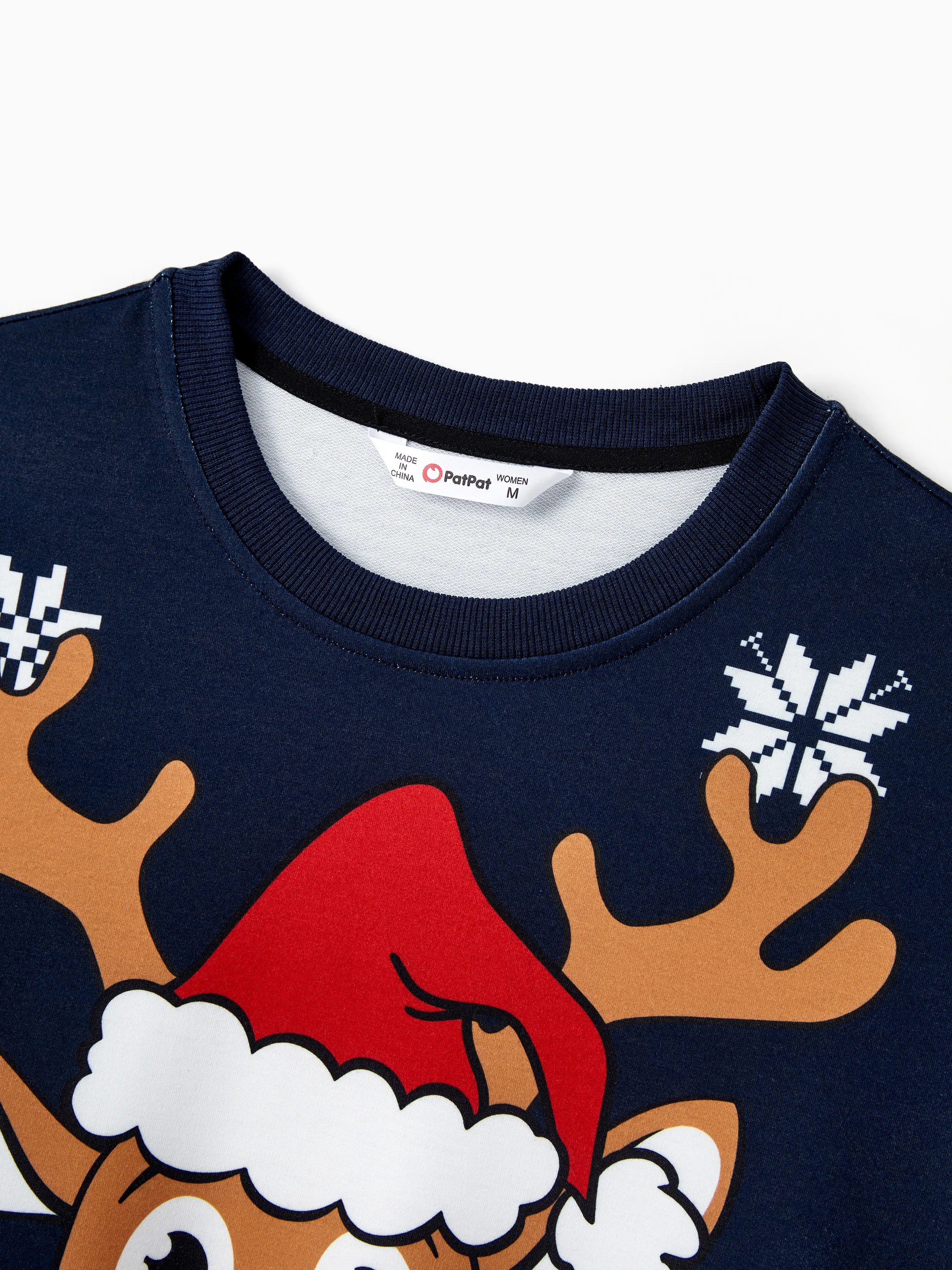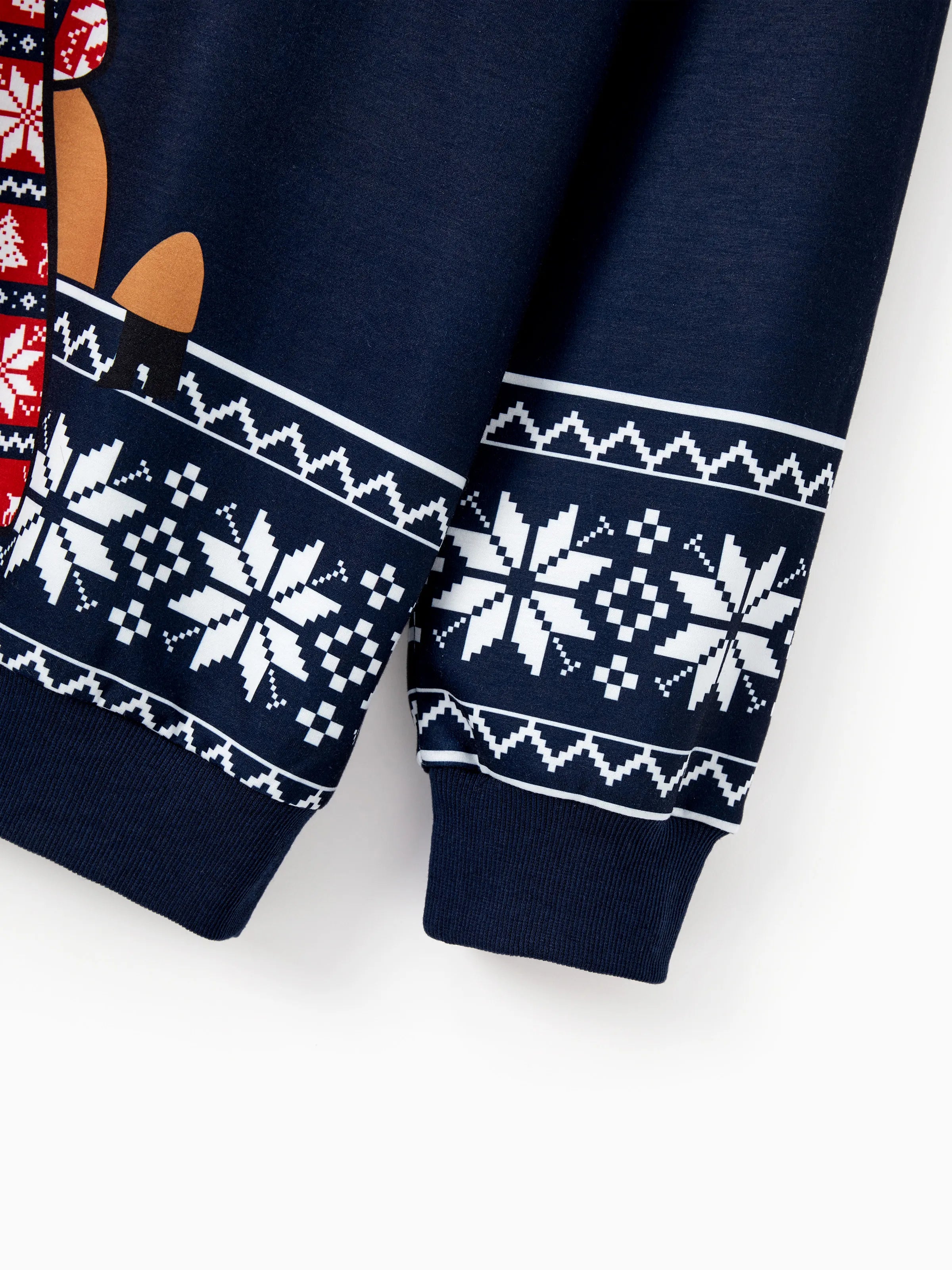 Haut à manches longues bleu foncé pour la famille, motif renne et flocon de neige