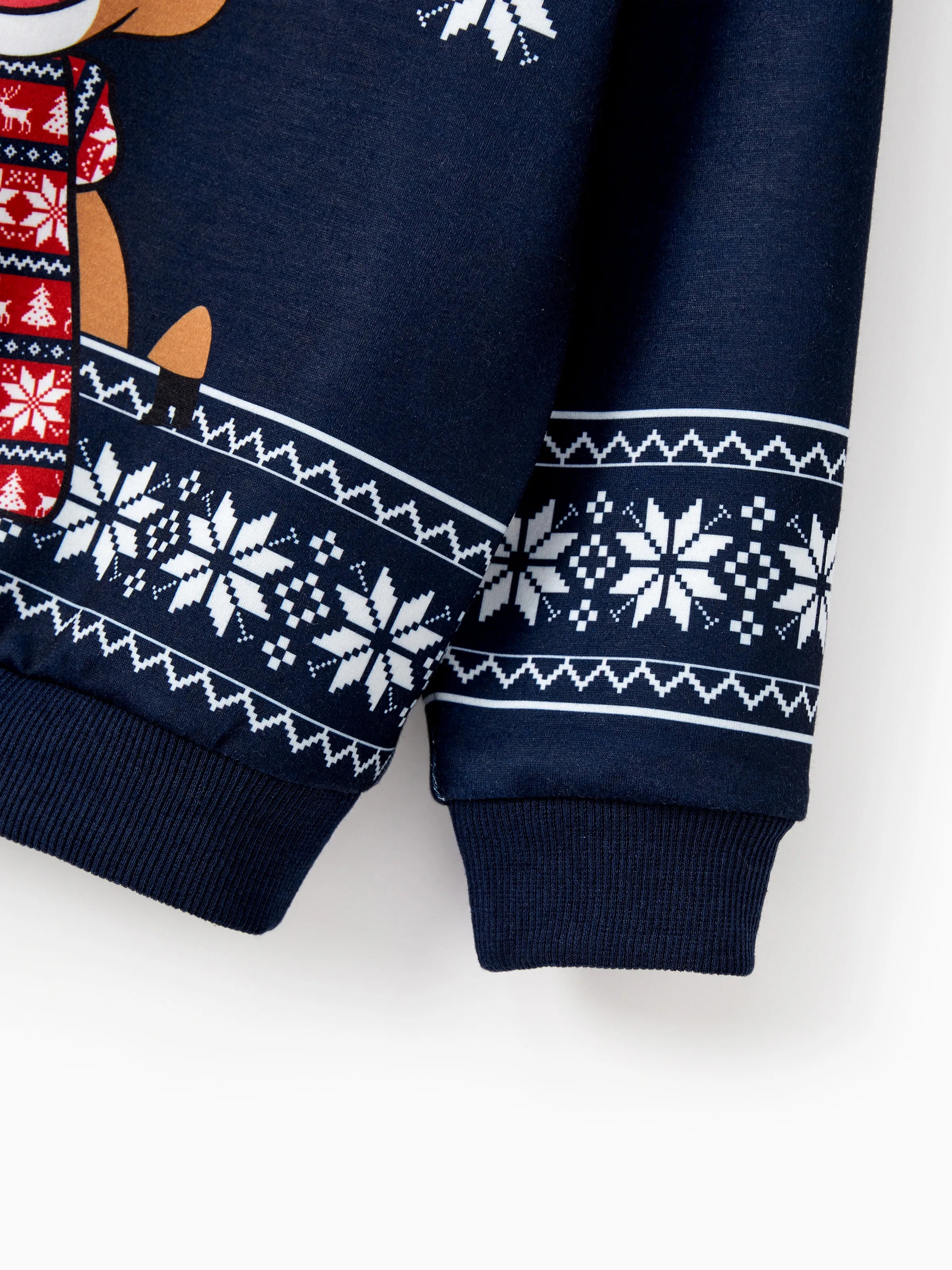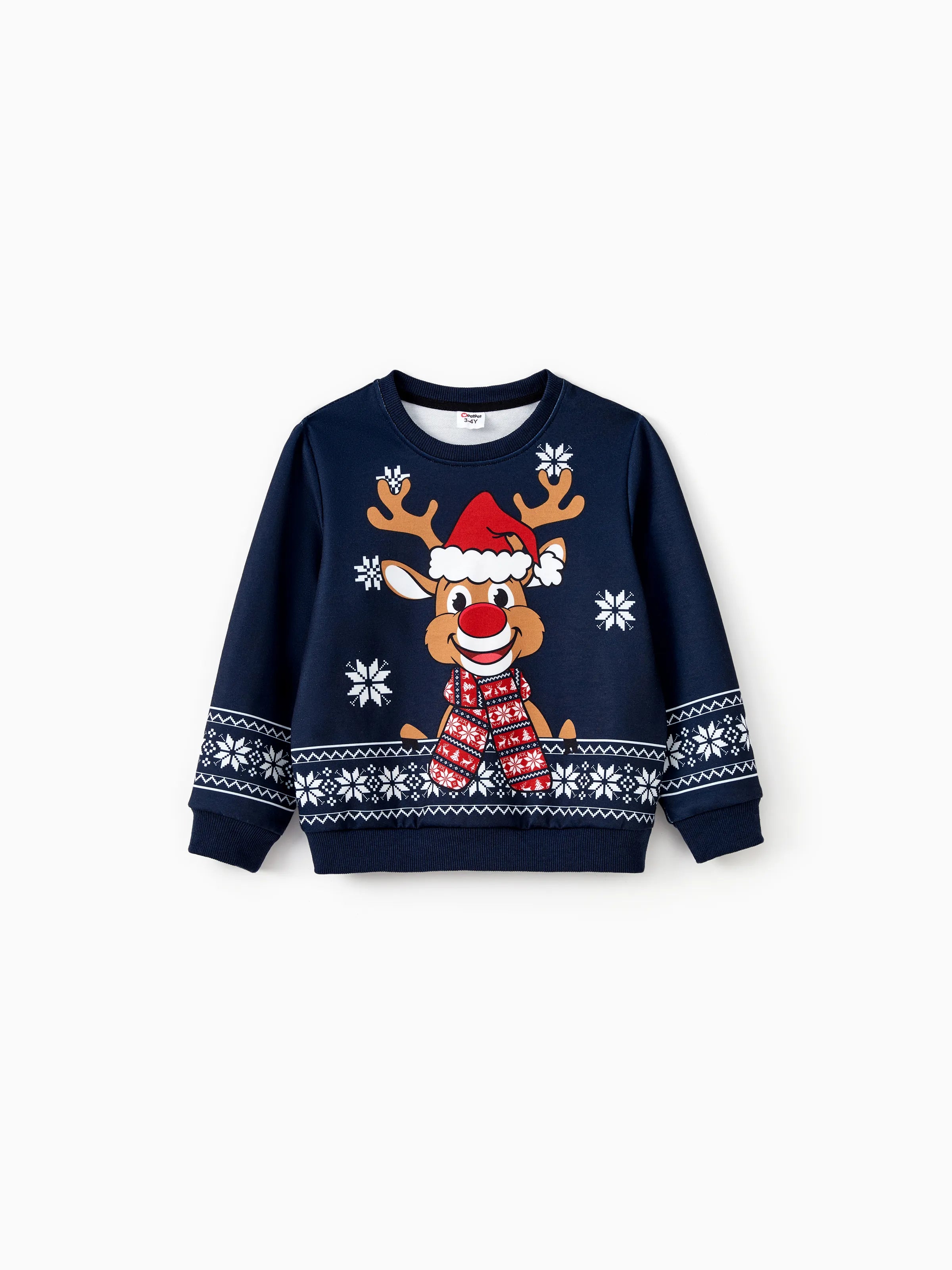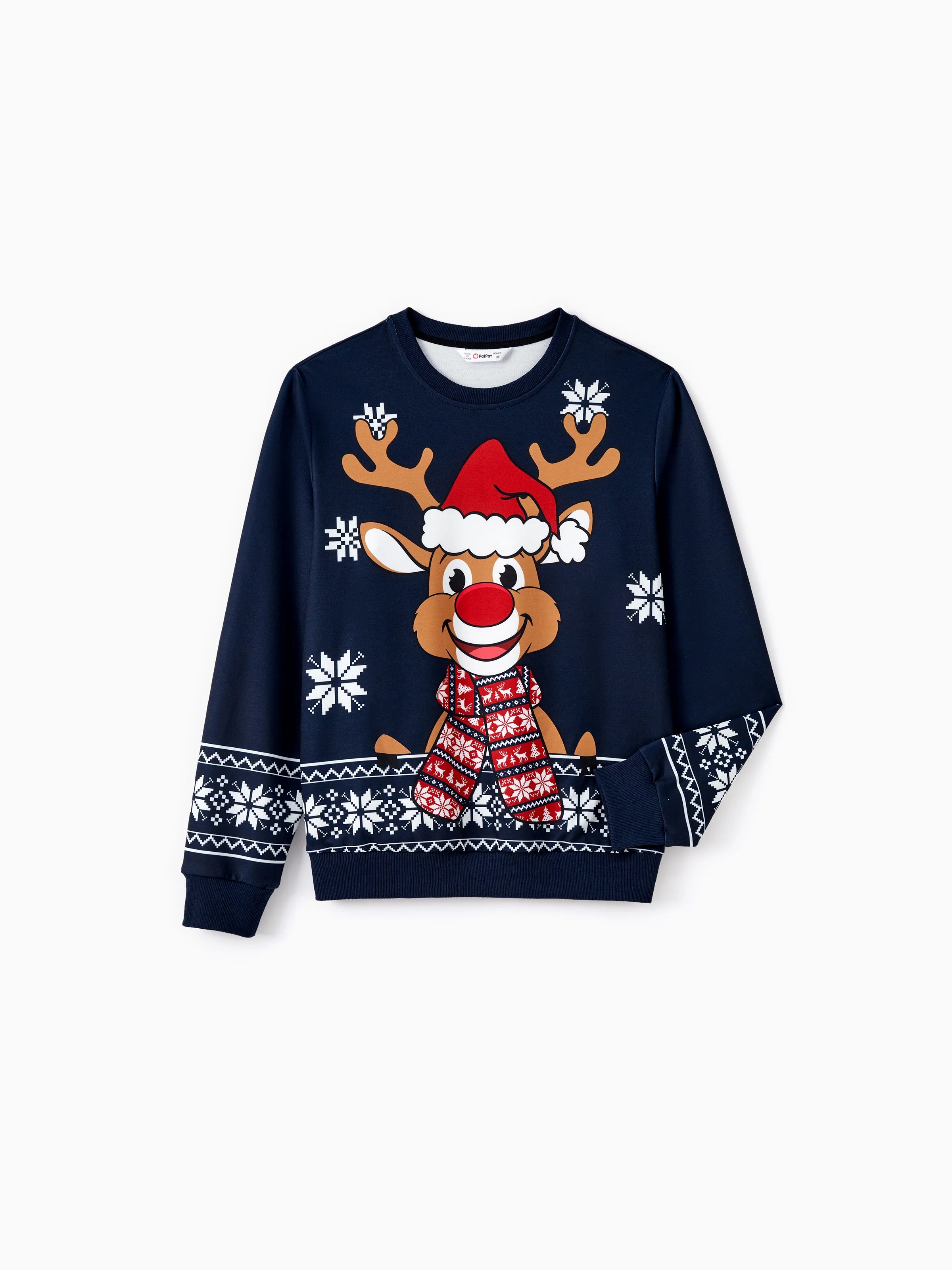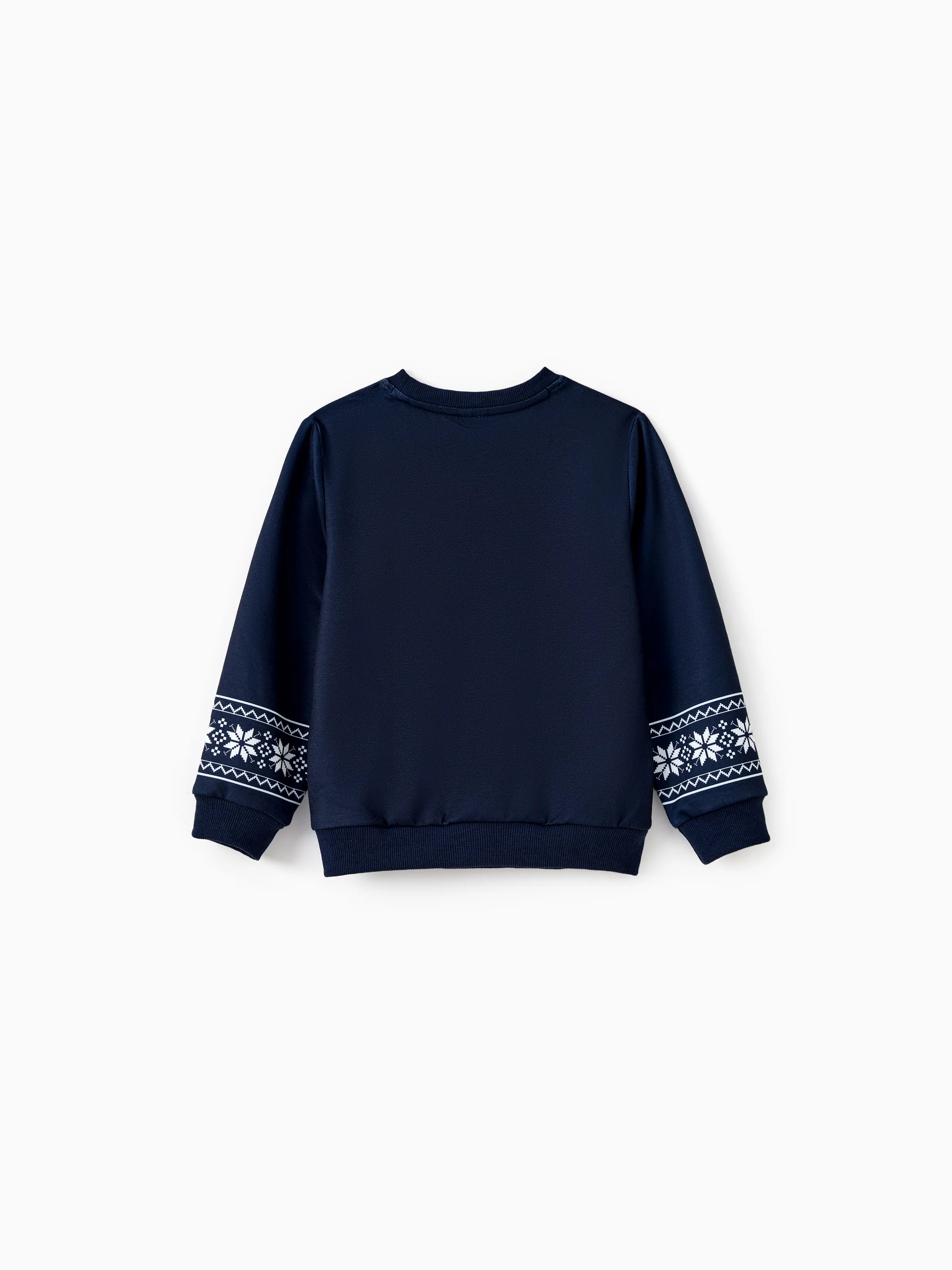 Haut à manches longues bleu foncé pour la famille, motif renne et flocon de neige