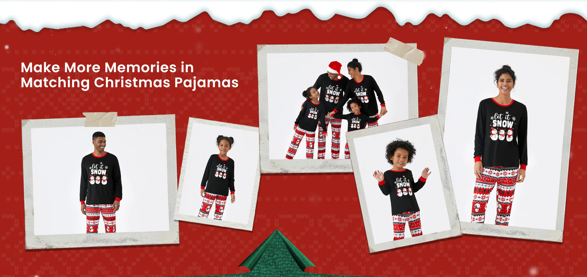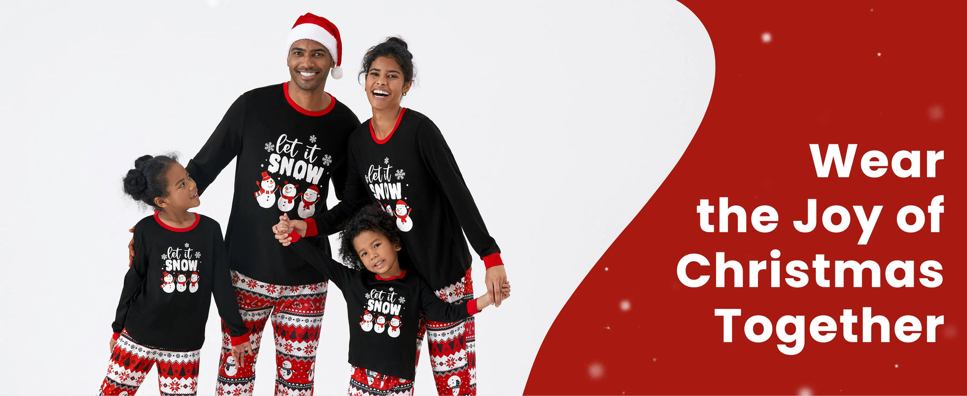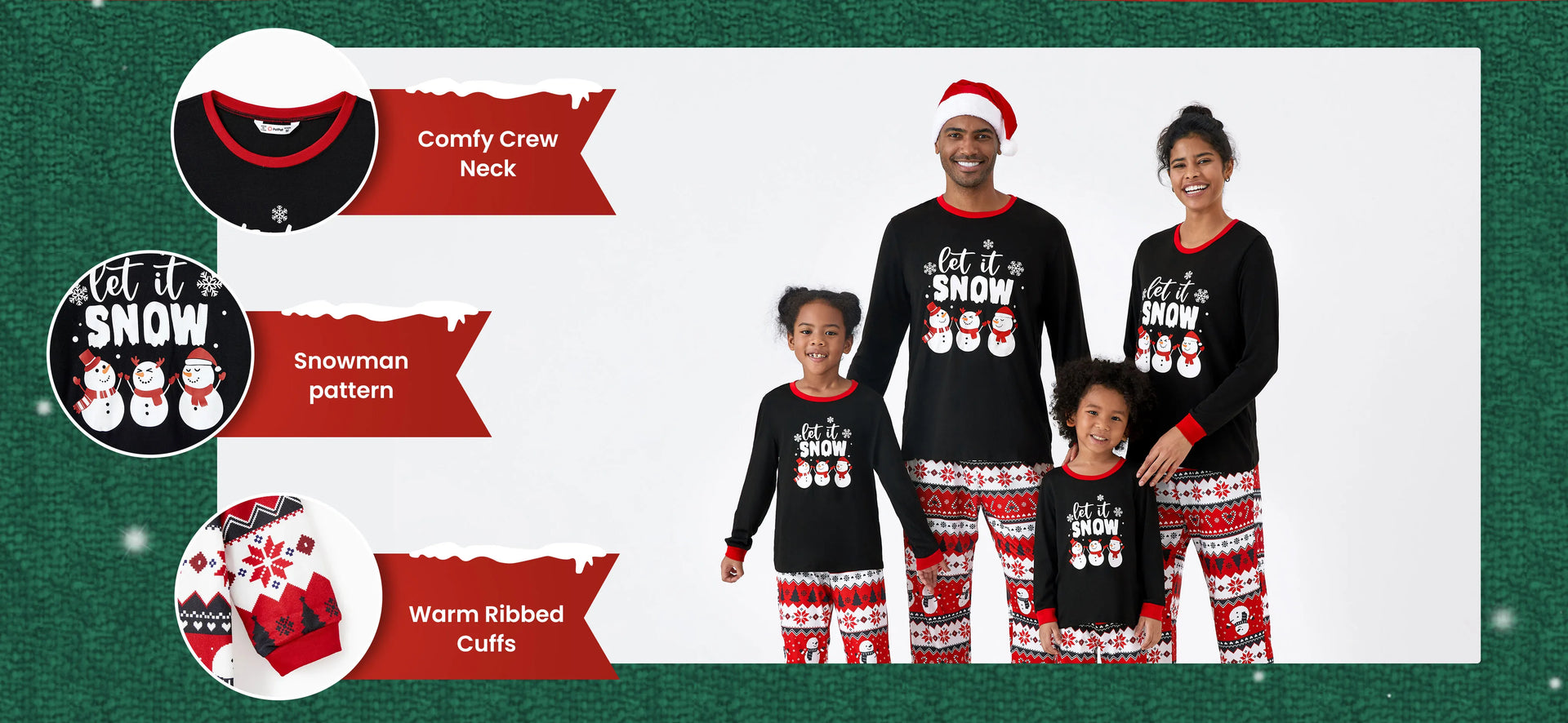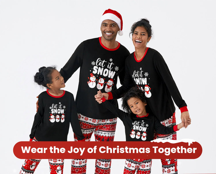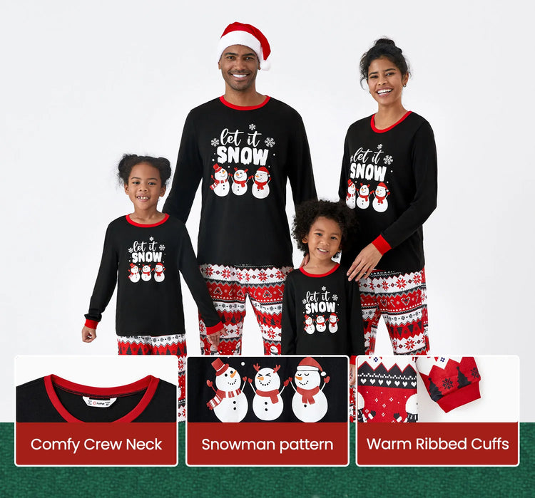 Profitez de moments en famille confortables et douillets avec nos pyjamas familiaux assortis rouges et noirs avec de jolis imprimés de flocons de neige et de bonhommes de neige.