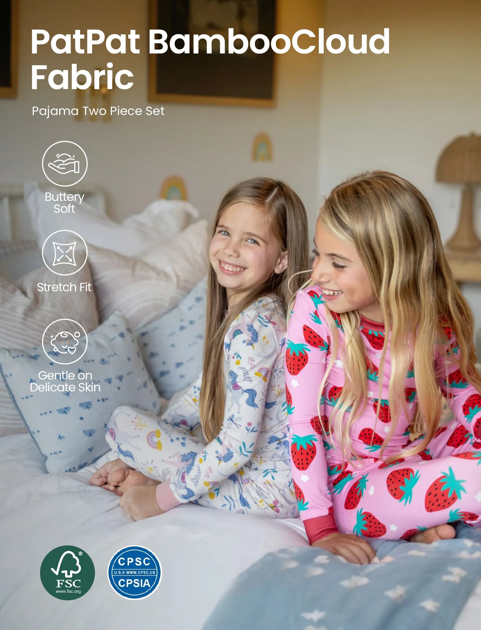 Pyjama de Noël/Halloween 2 pièces en bambou avec imprimé enfantin pour petite fille (coupe ajustée) rose