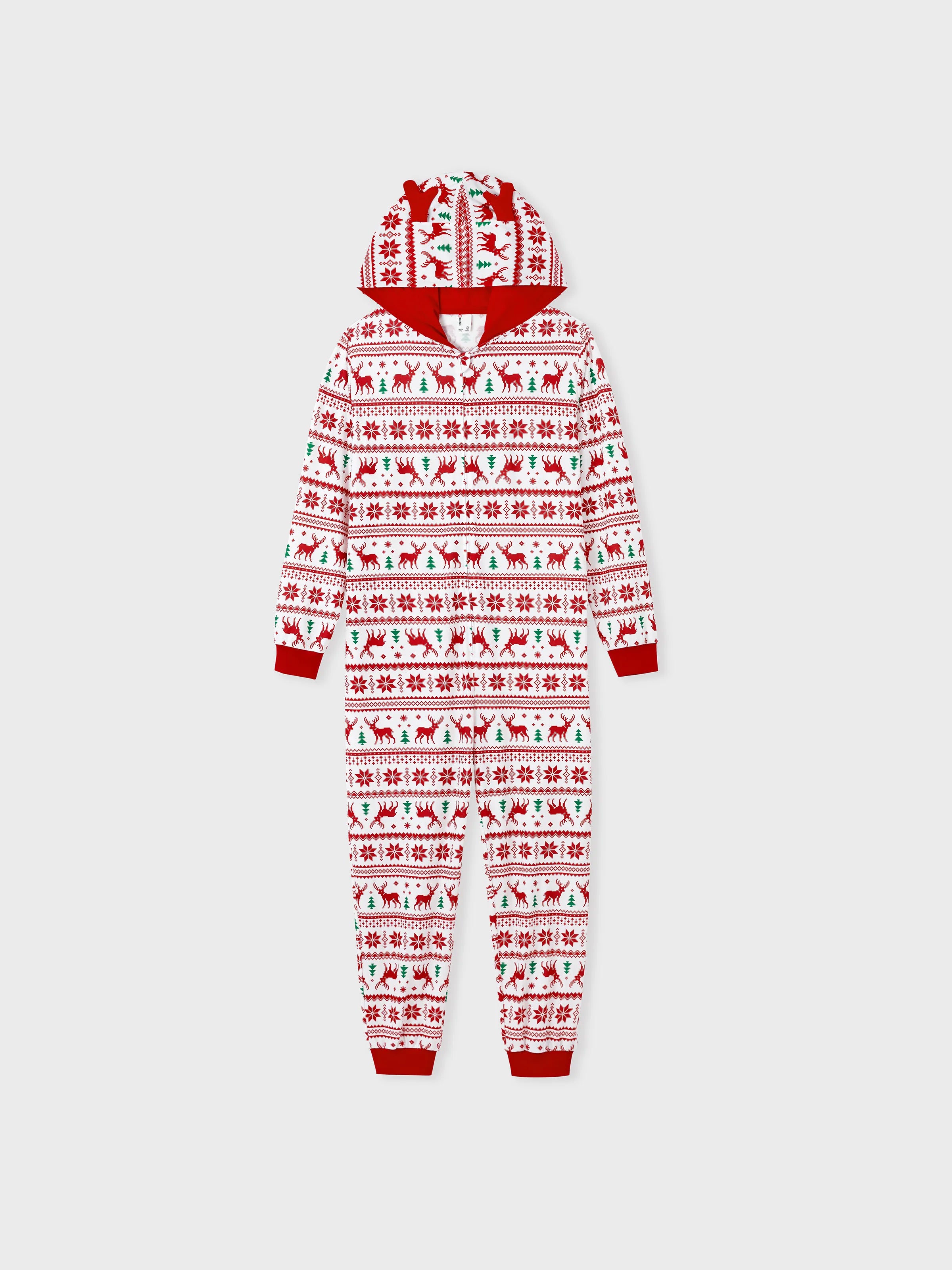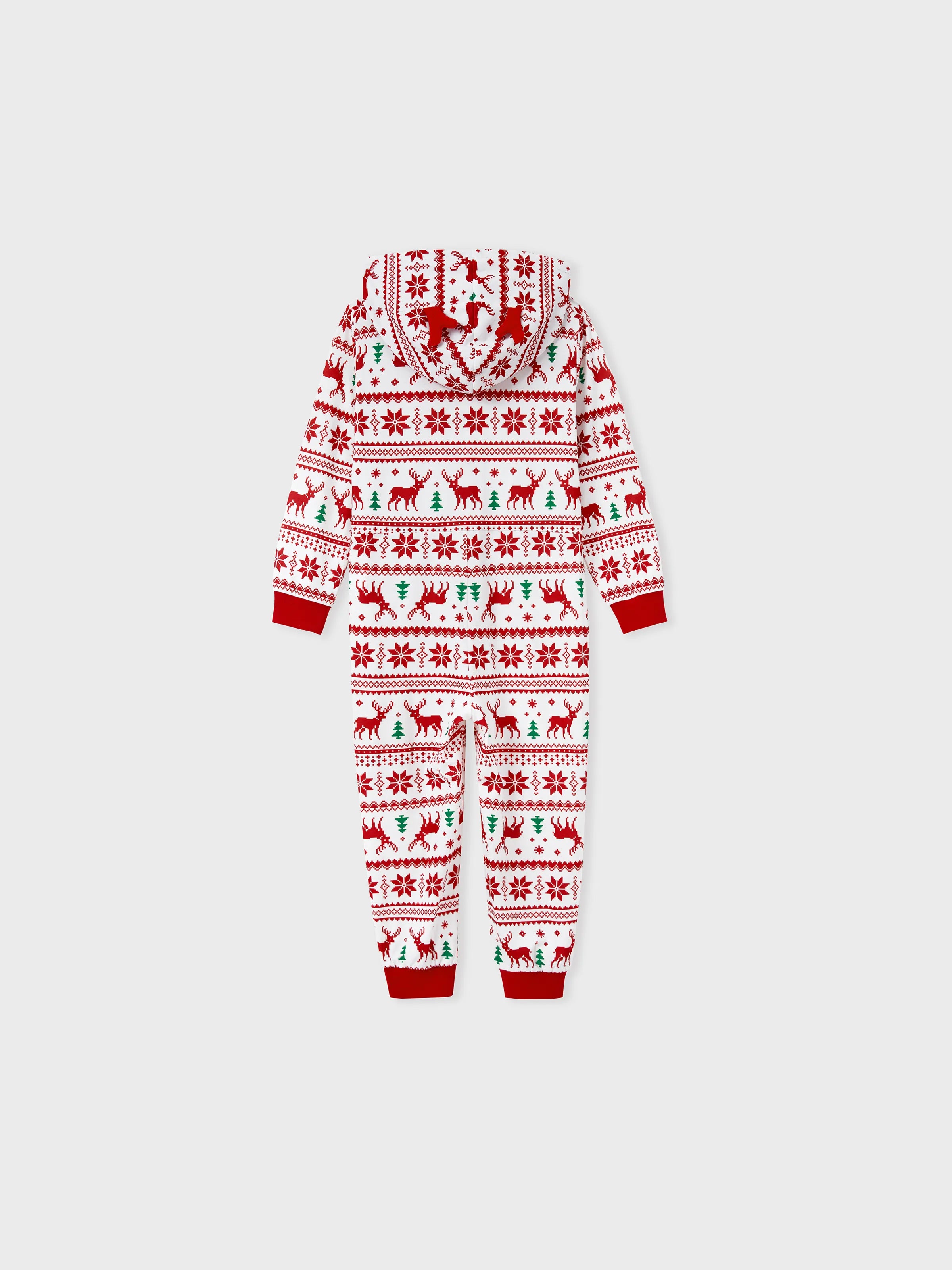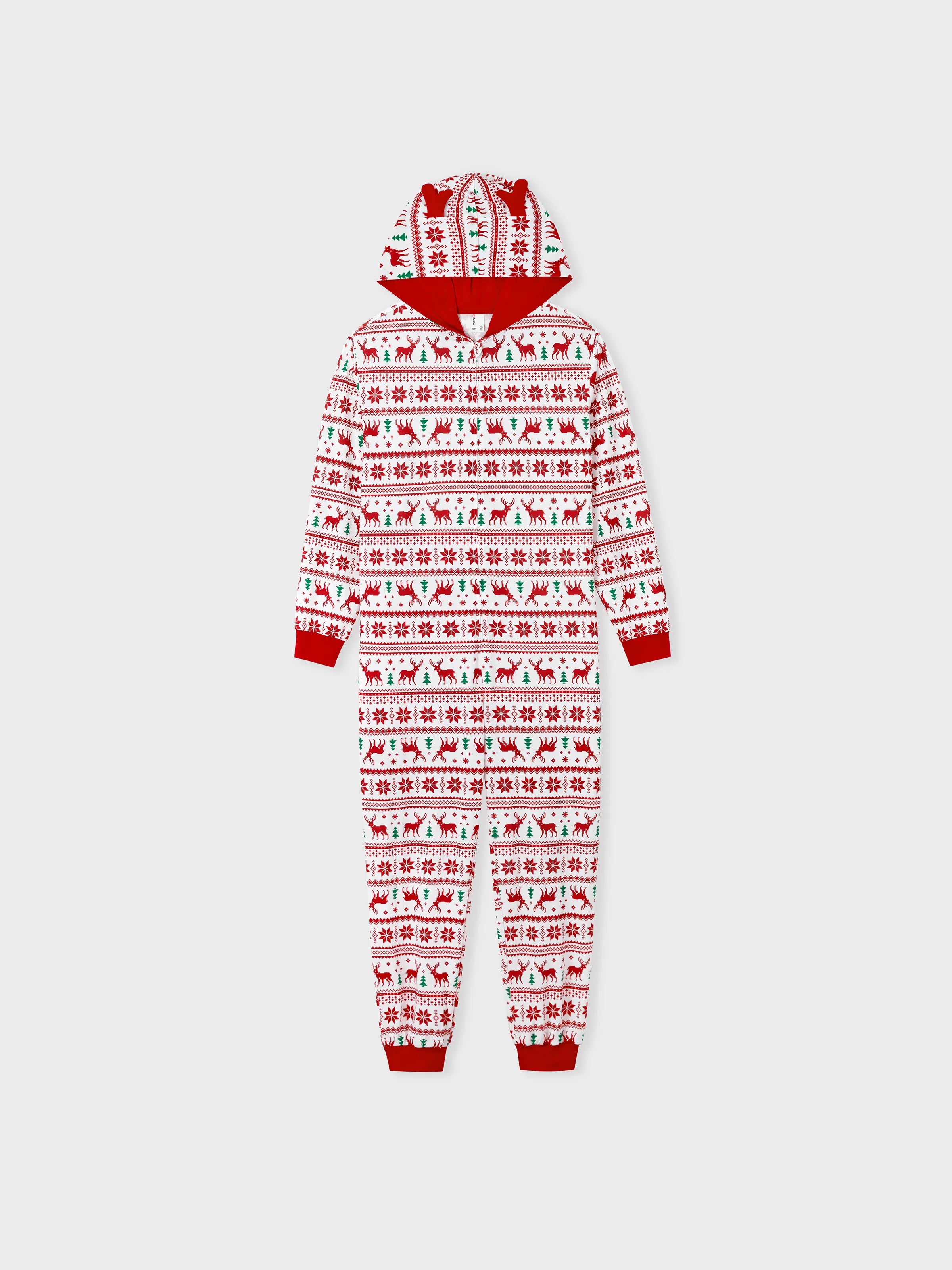 Cozy flame-resistant kids' pajamas with festive hooded reindeer design.