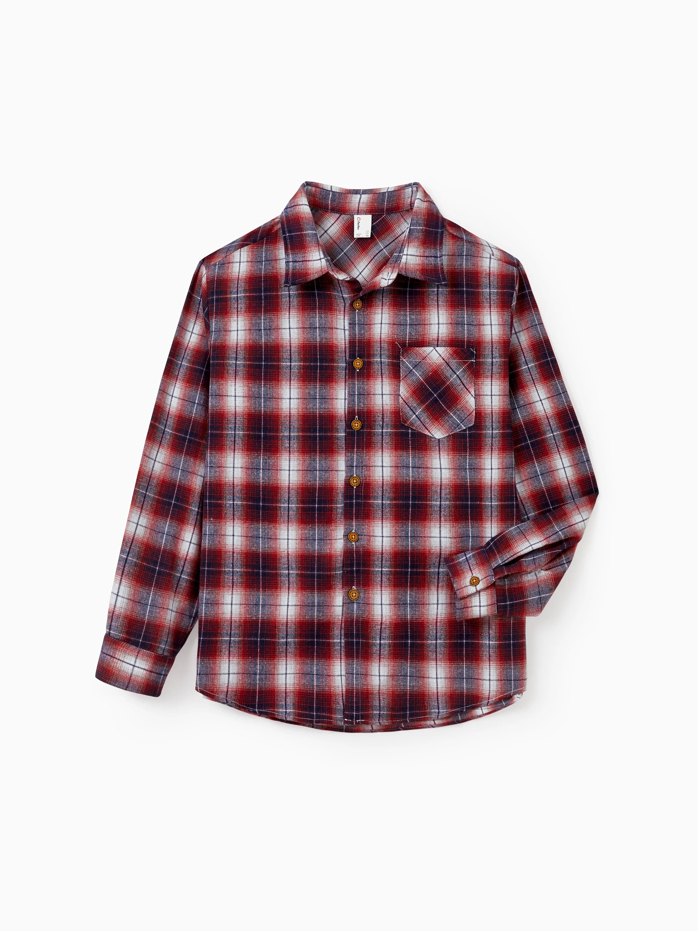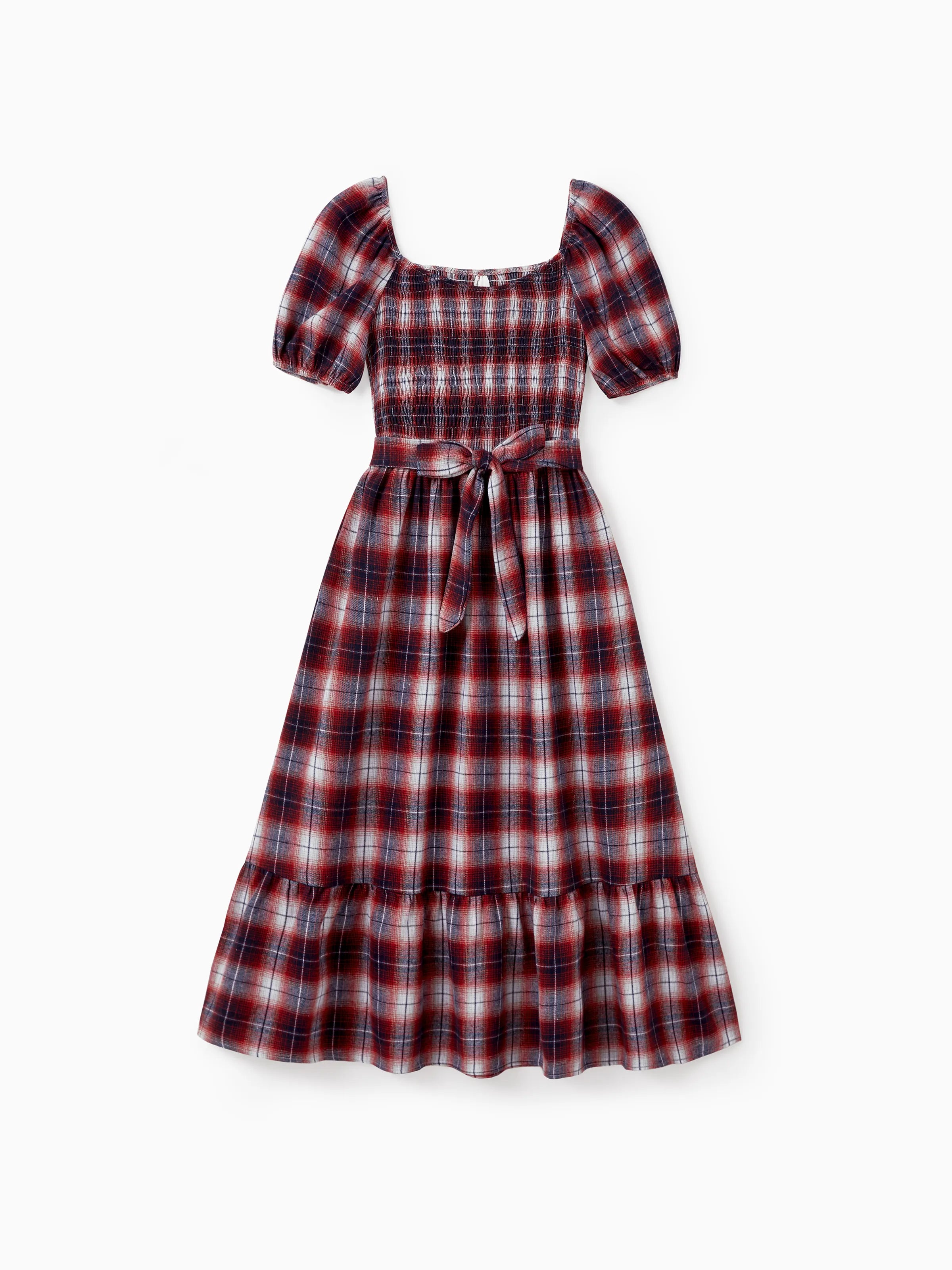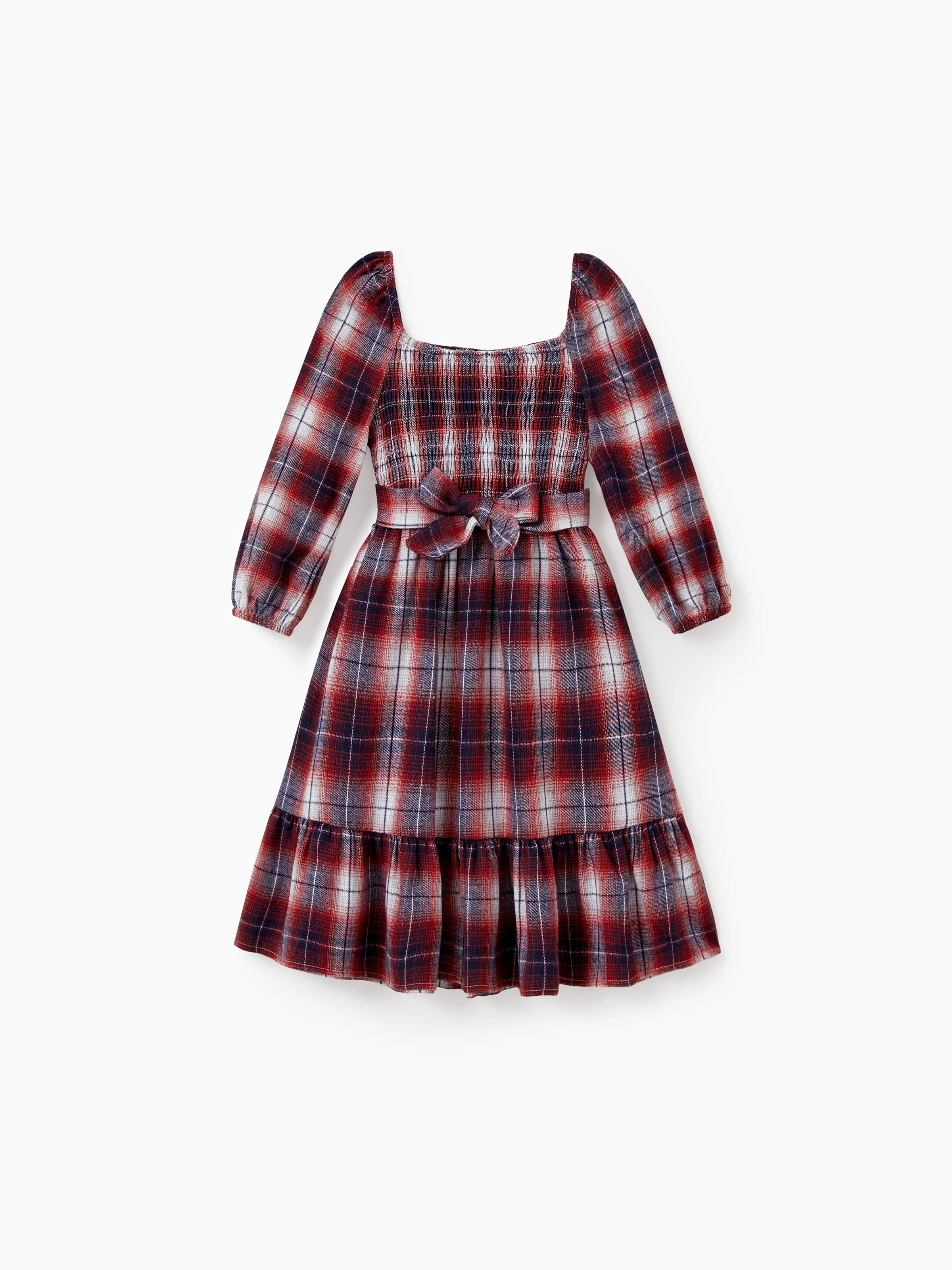 Tenues familiales assorties à carreaux de Noël : chemises à manches longues papa/fils ou robes mère/fille rouges