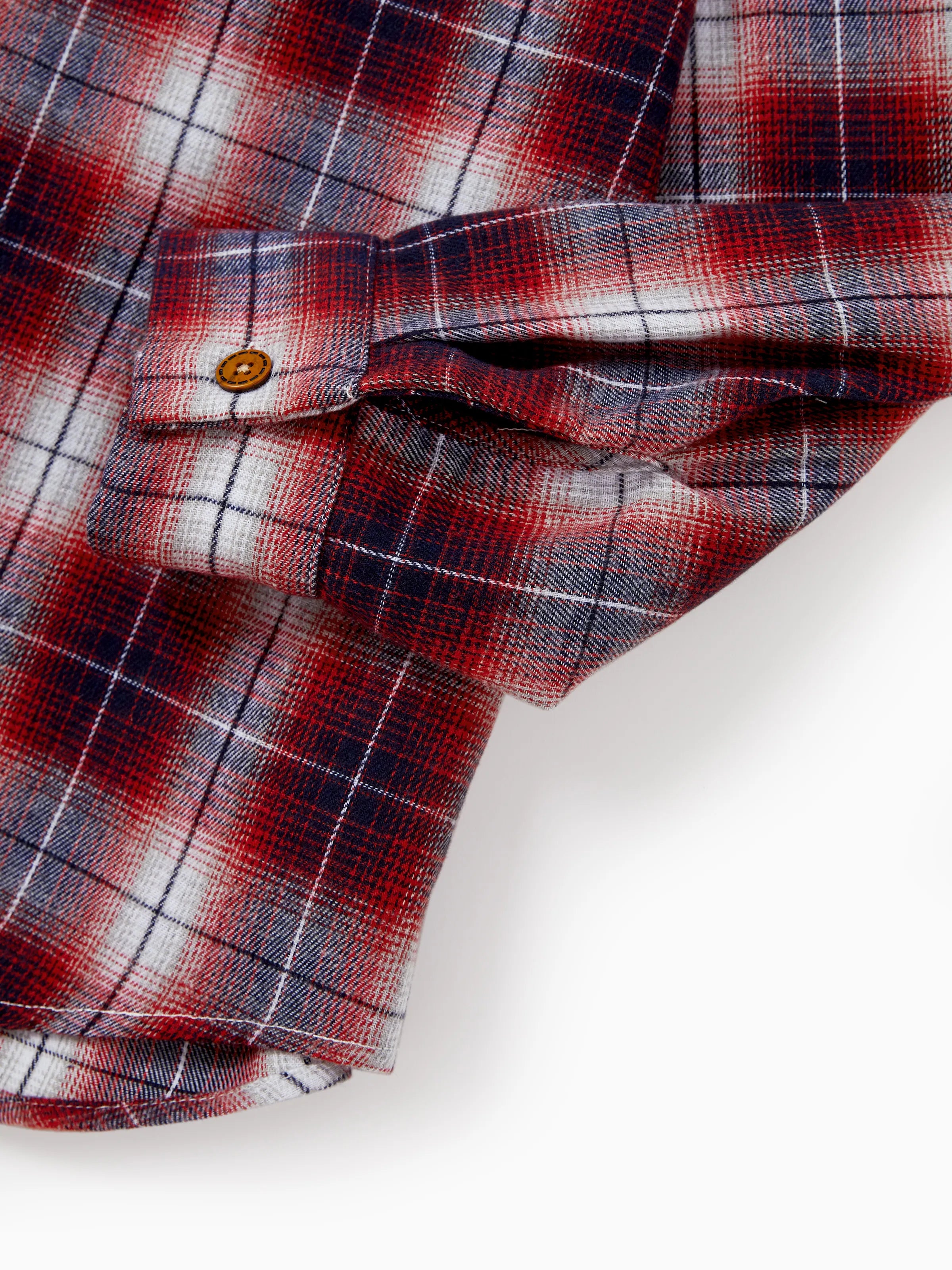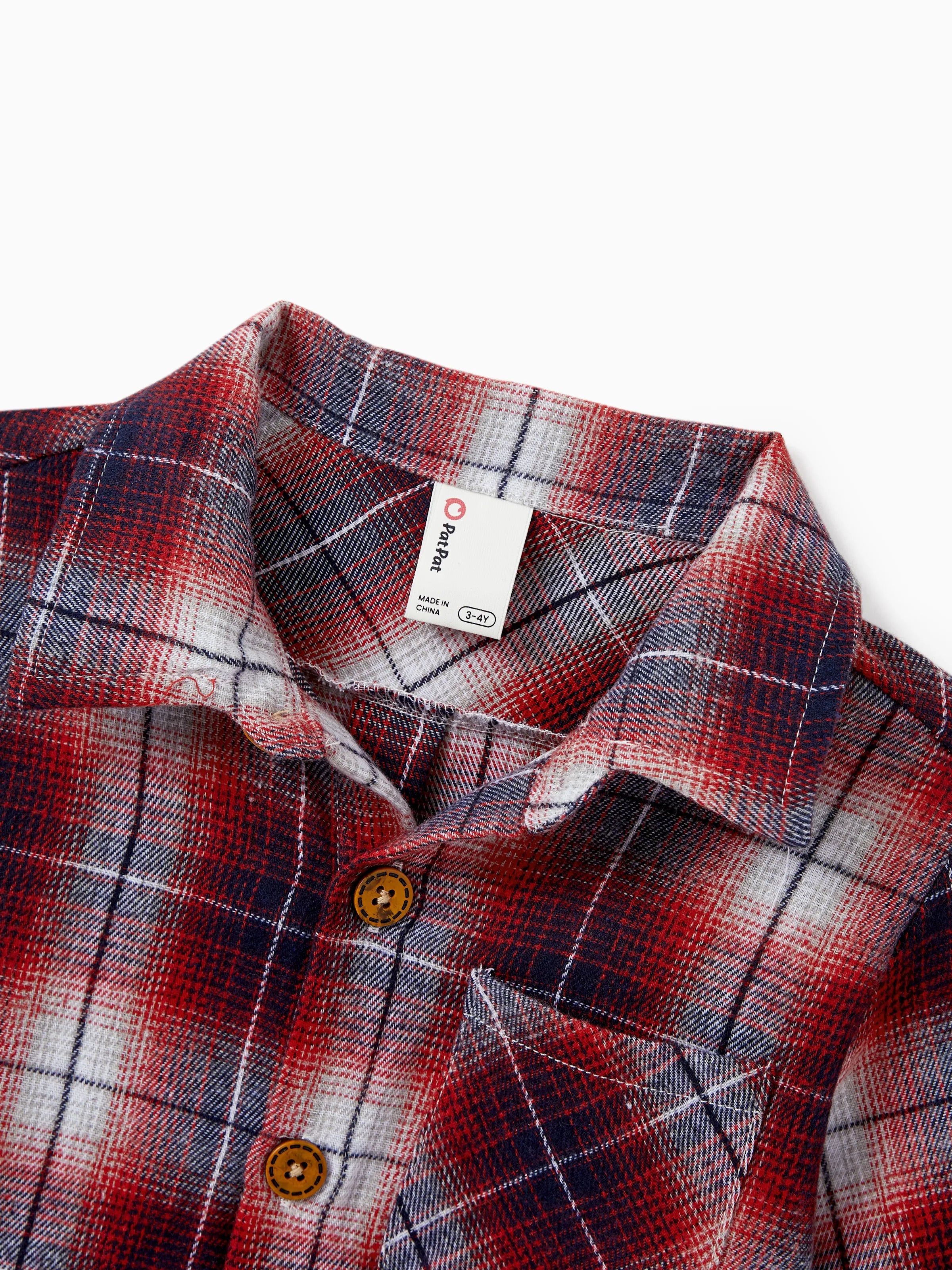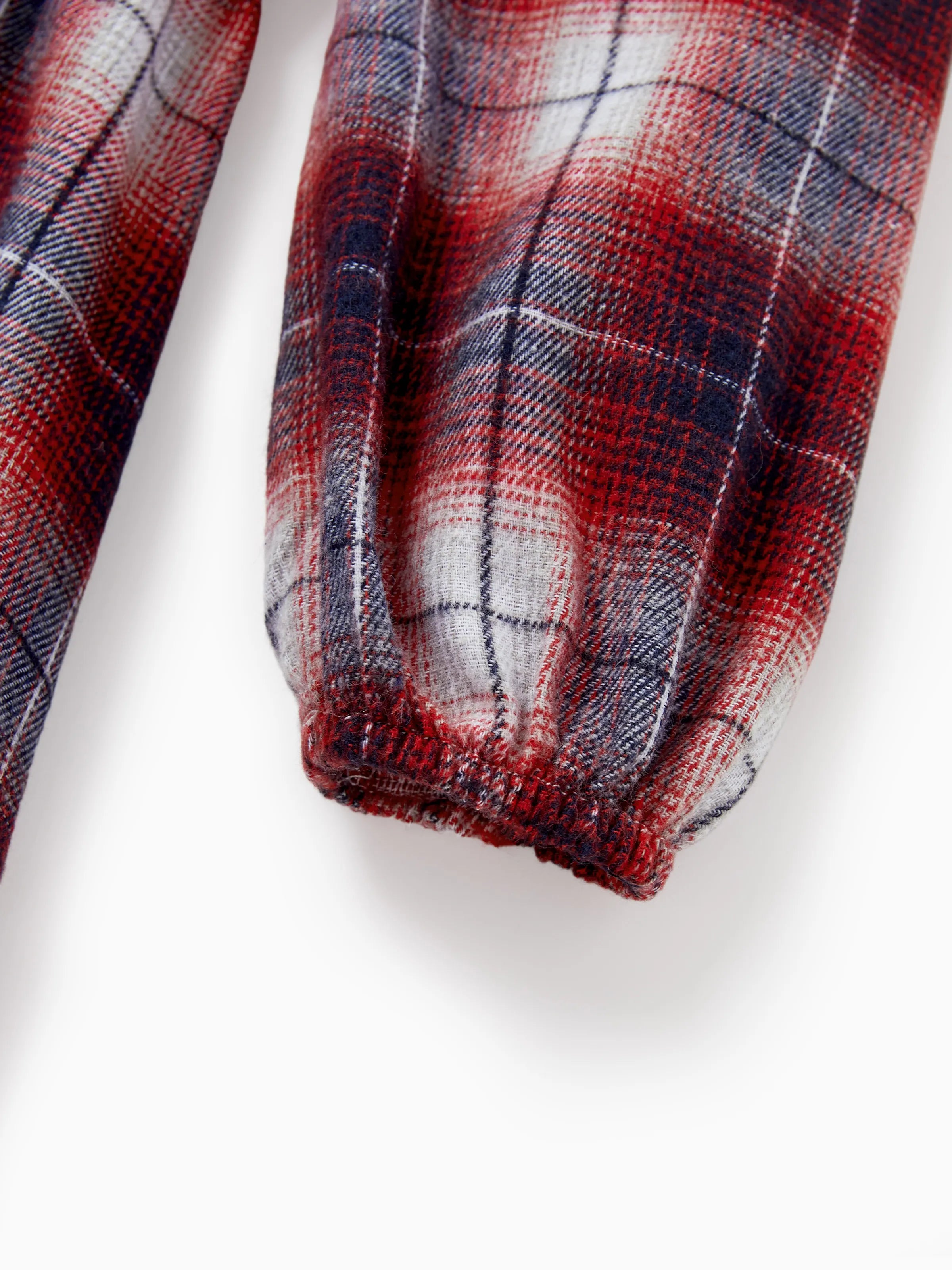 Tenues familiales assorties à carreaux de Noël : chemises à manches longues papa/fils ou robes mère/fille rouges