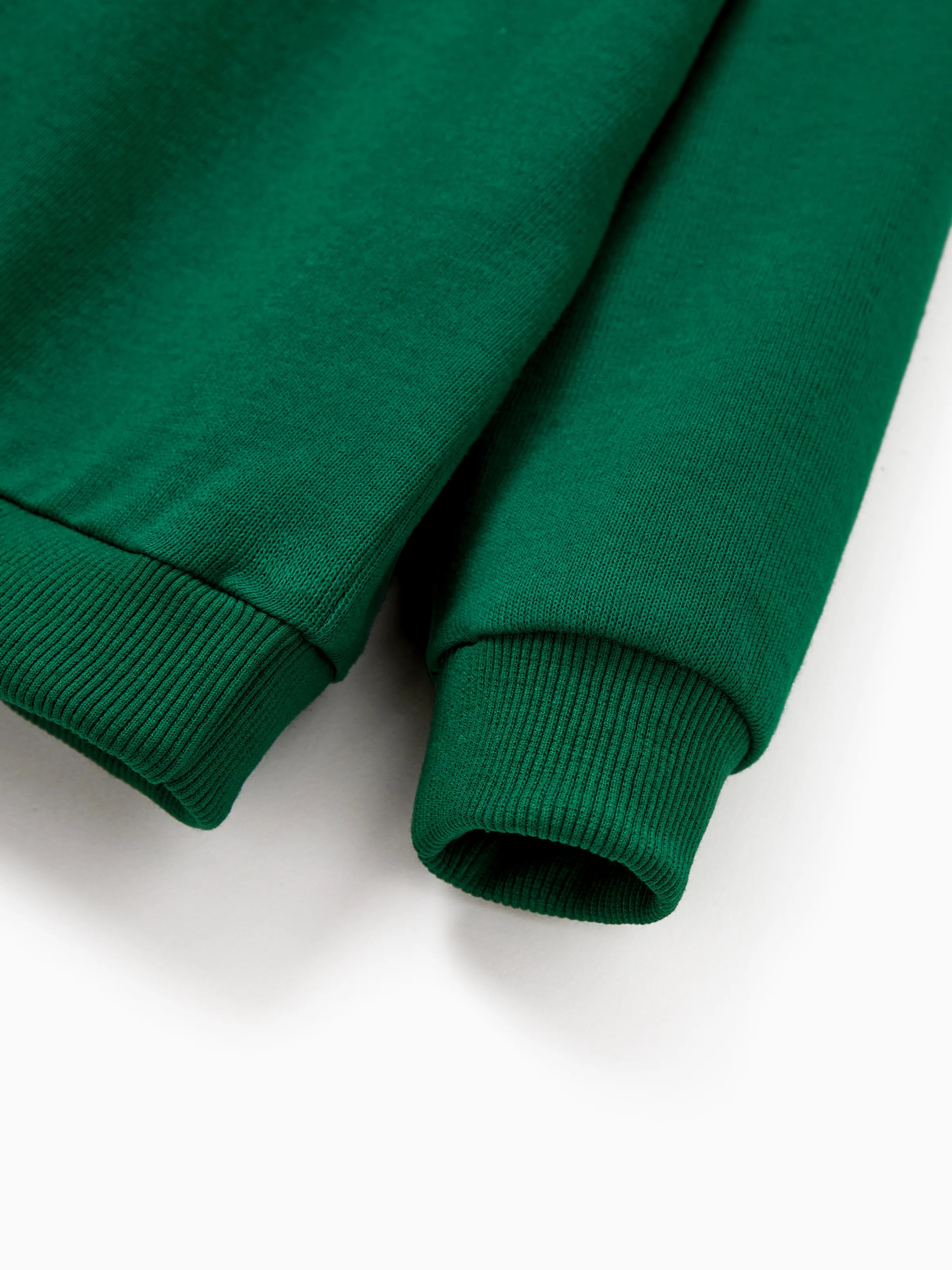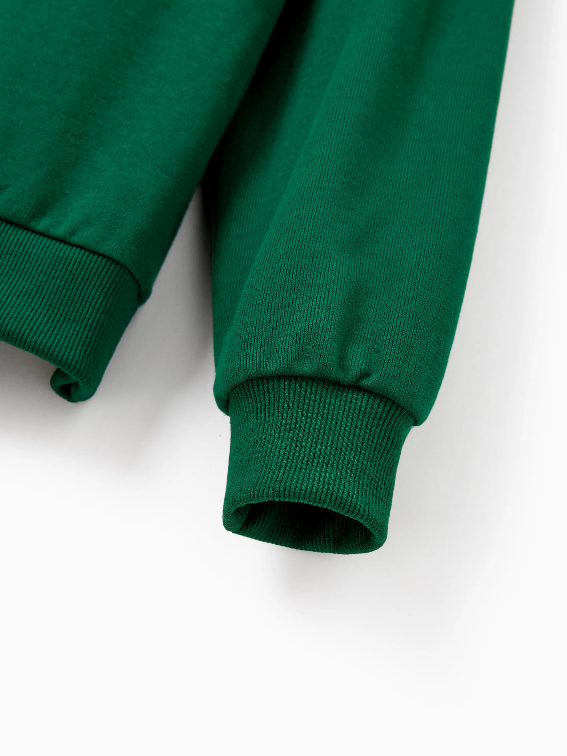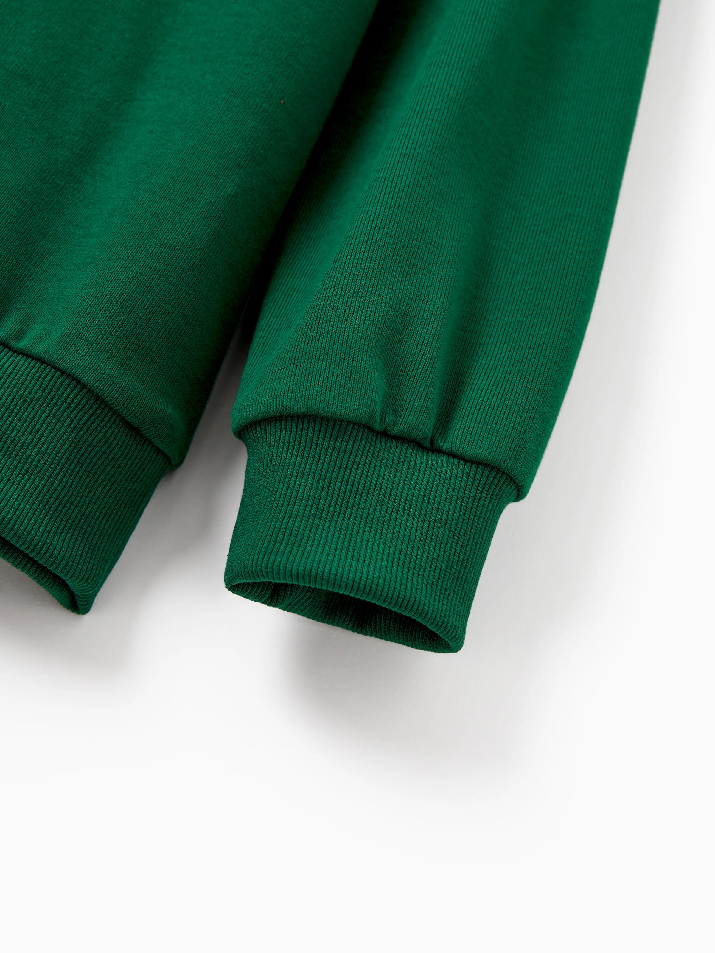 Tenues familiales élégantes et assorties dans de riches teintes vertes pour l'automne et l'hiver, ajoutant charme et coordination aux sorties en famille.