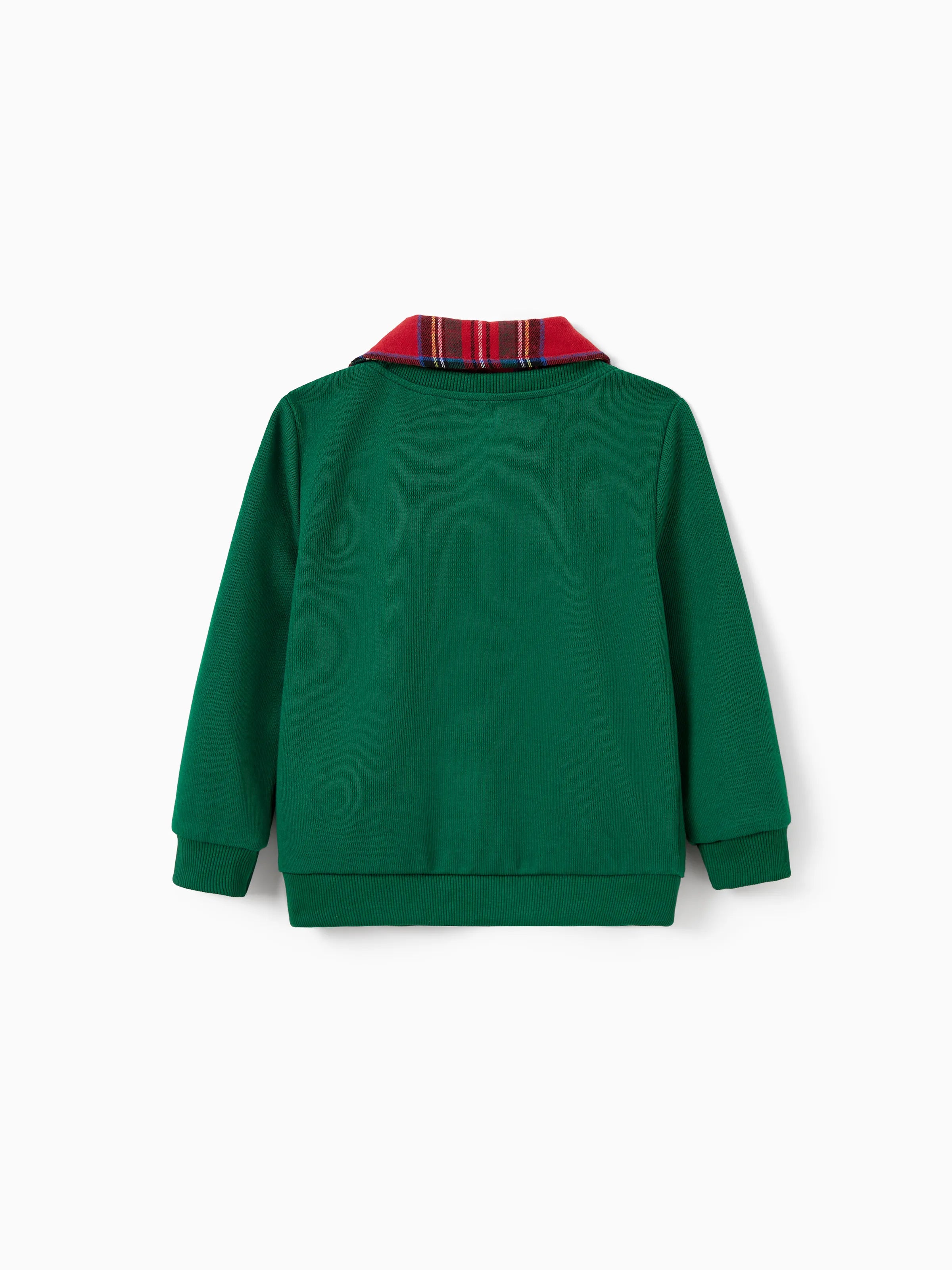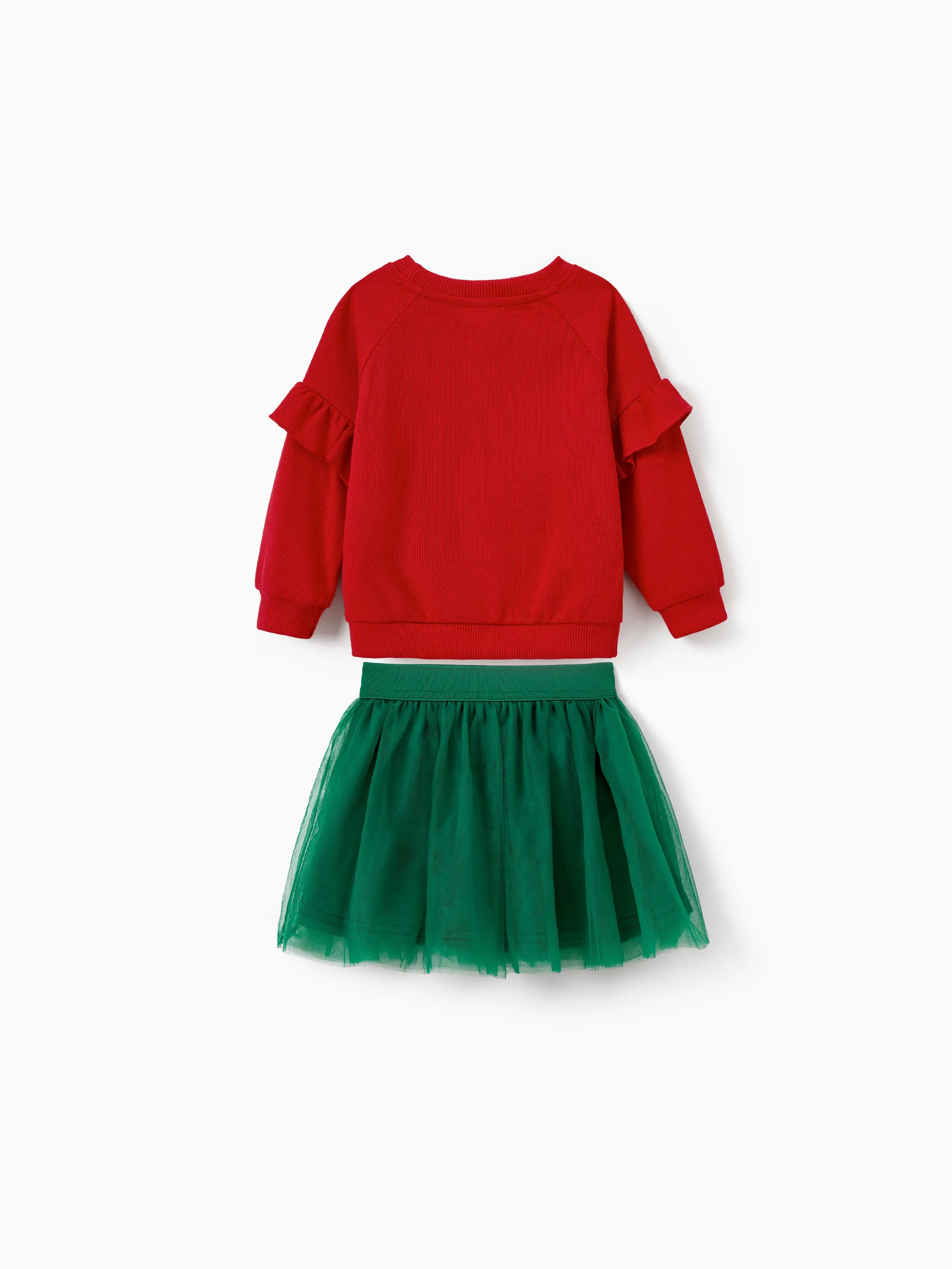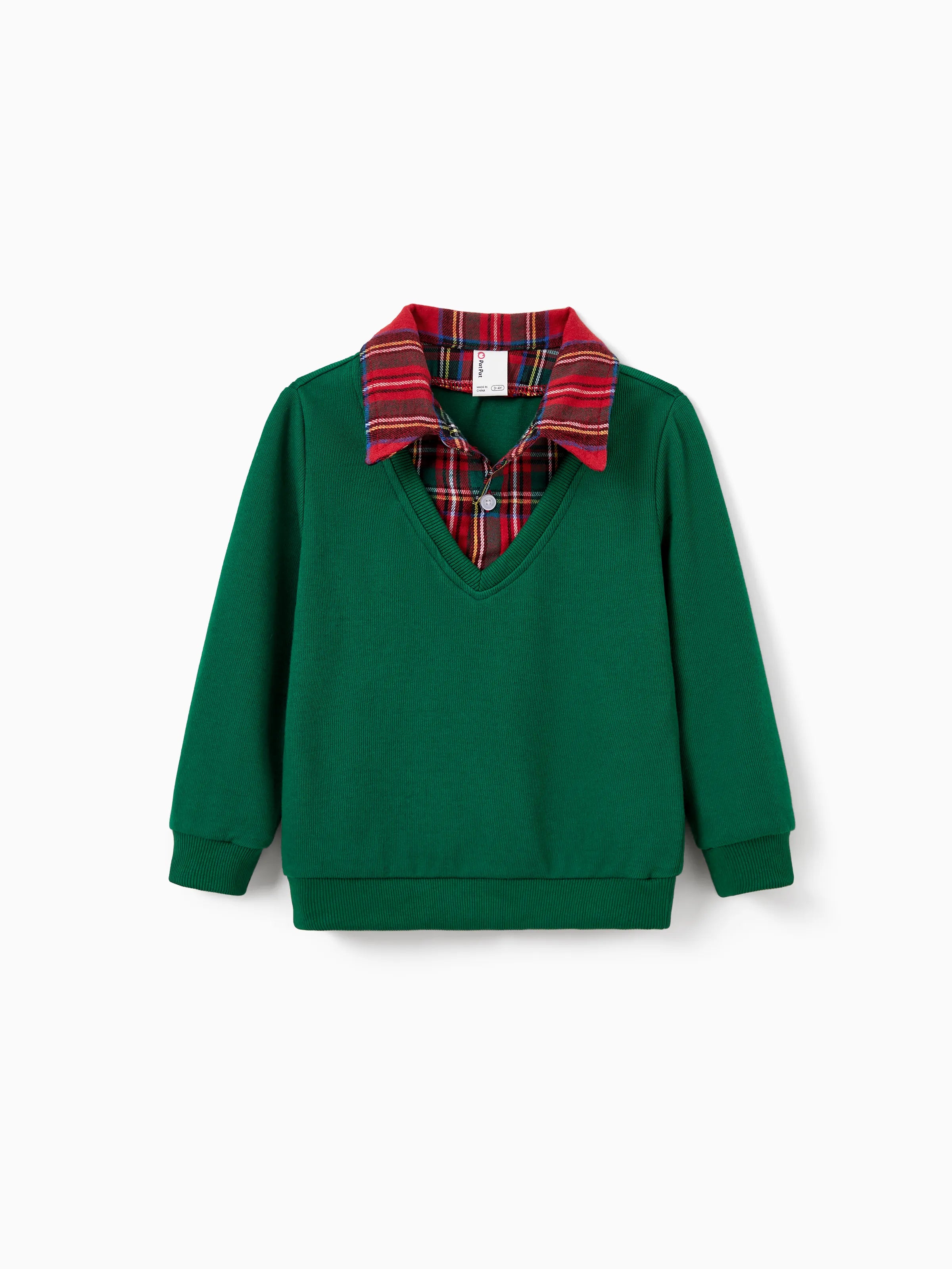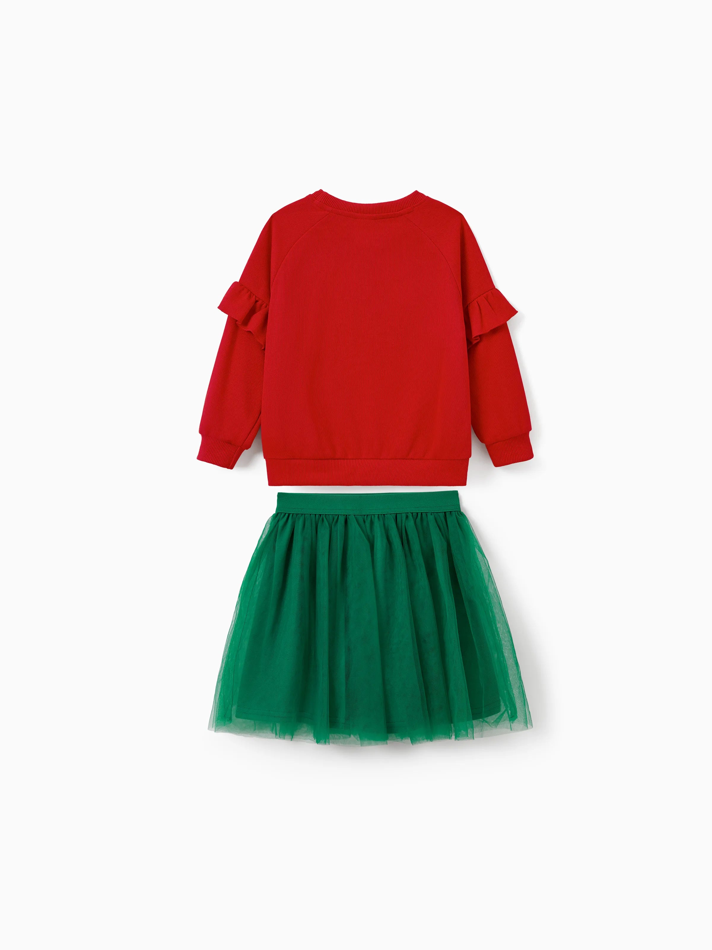 Magie du jumelage : un look familial assorti avec deux styles : les adultes/garçons en sweat-shirt à col écossais vert (classique et preppy), les filles en ensemble haut imprimé sapin de Noël rouge et jupe en tulle (adorable et festif). Parfait pour les photos de vacances !
