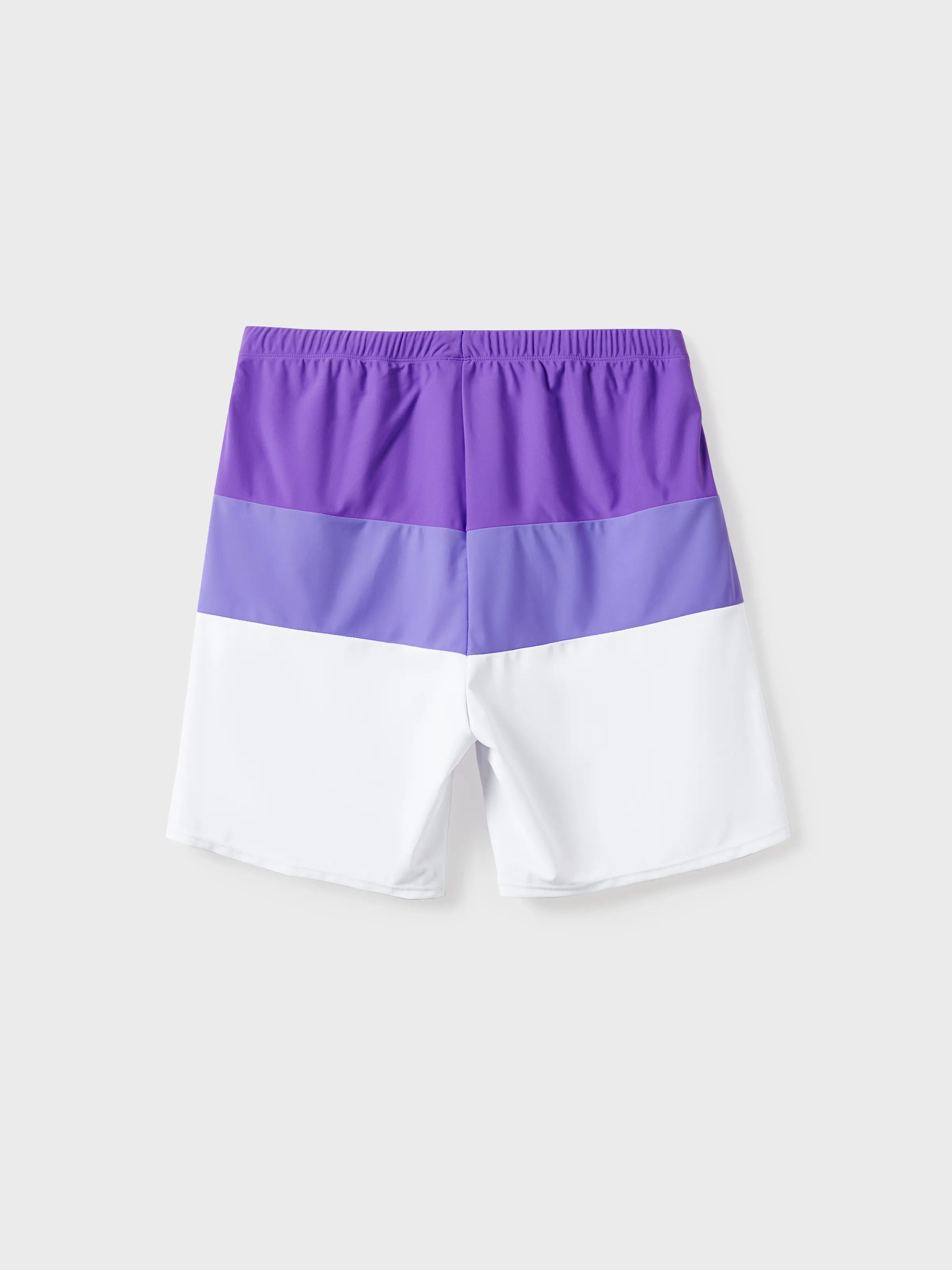 Embrace your casual vacation side with this purple and light lavender family swimsuit set, featuring a bow tie at the waist, tank strap design for girl and an adjustable waist cord for dad/boy. Perfect for tropical vacations.