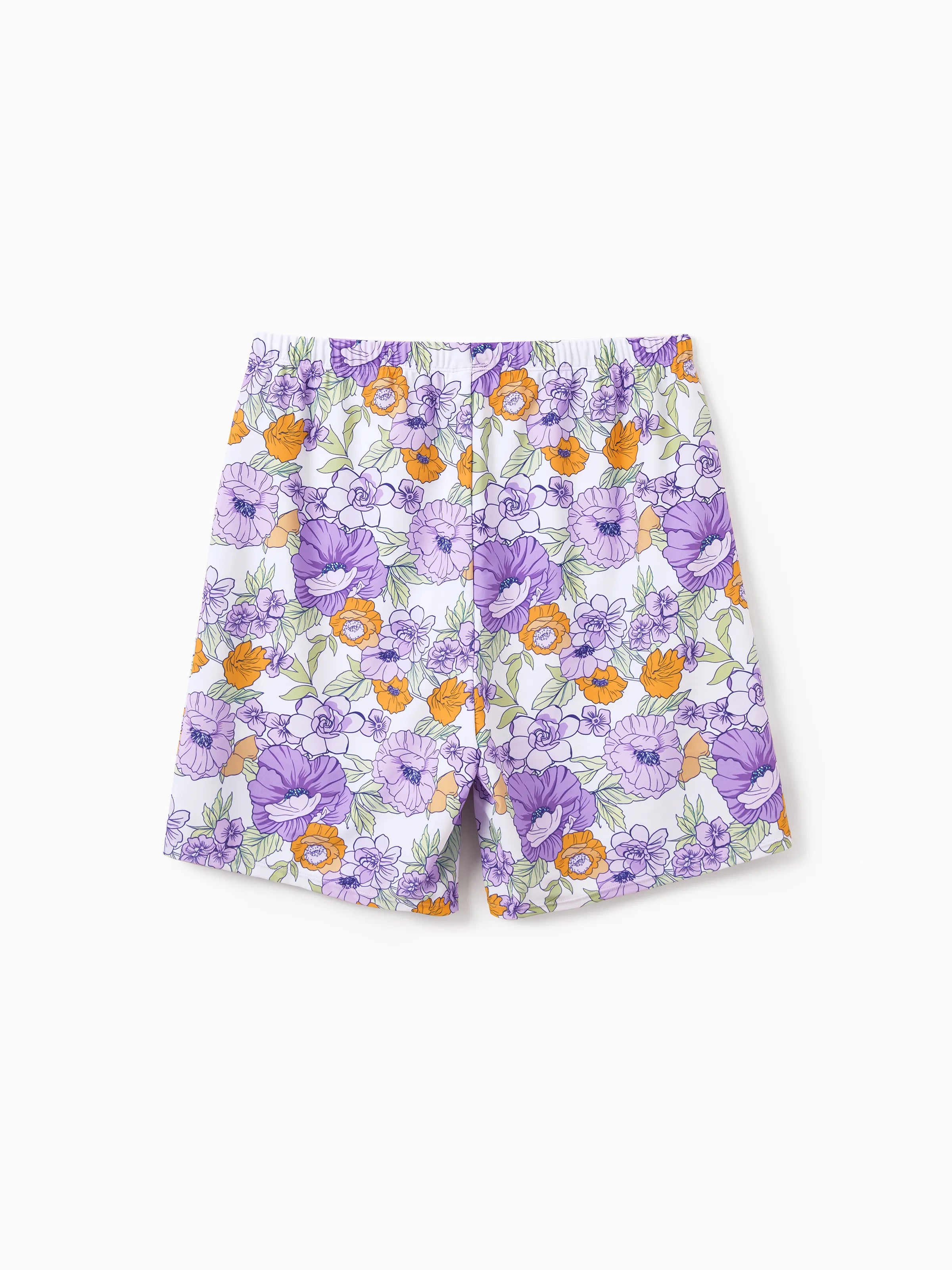 Stylish purple floral matching swimwear perfect for family beach vacations.