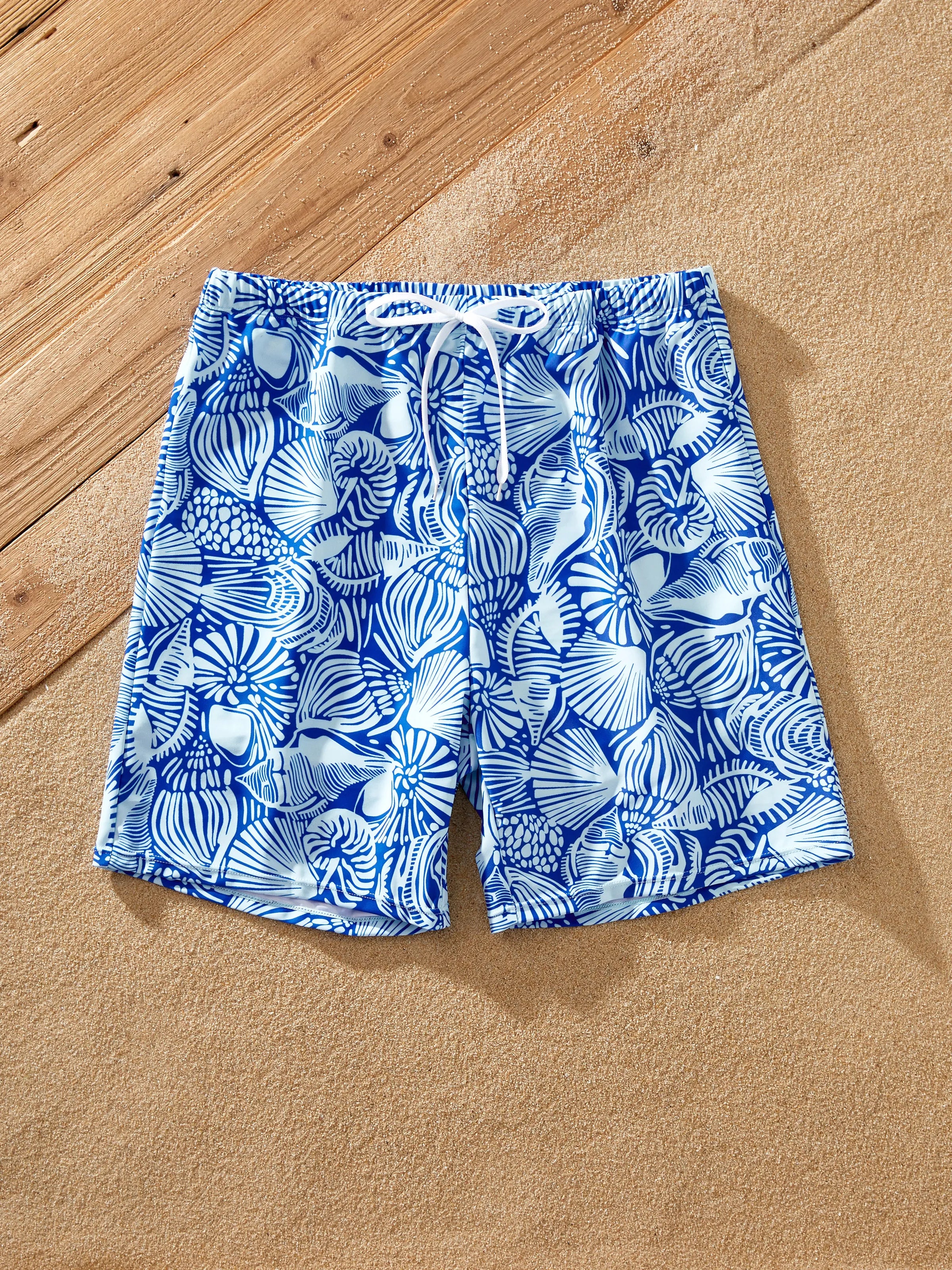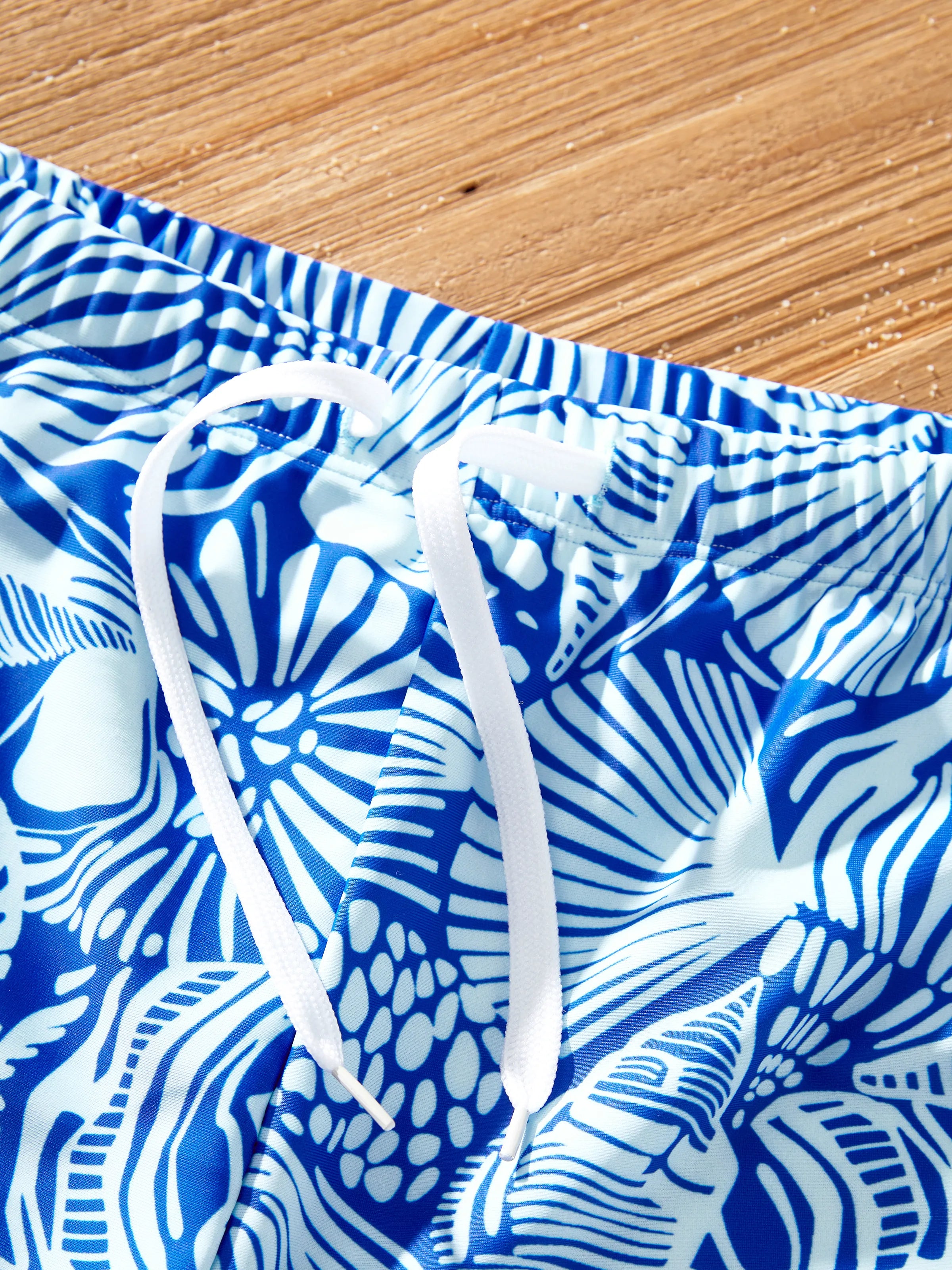 Daddy & Daughter Shell Print Swimwear Floral two-piece Bikini & Swim Shorts Set for Mom, Dad, & Kids, Perfect for Beach Days & Pool Parties Blue