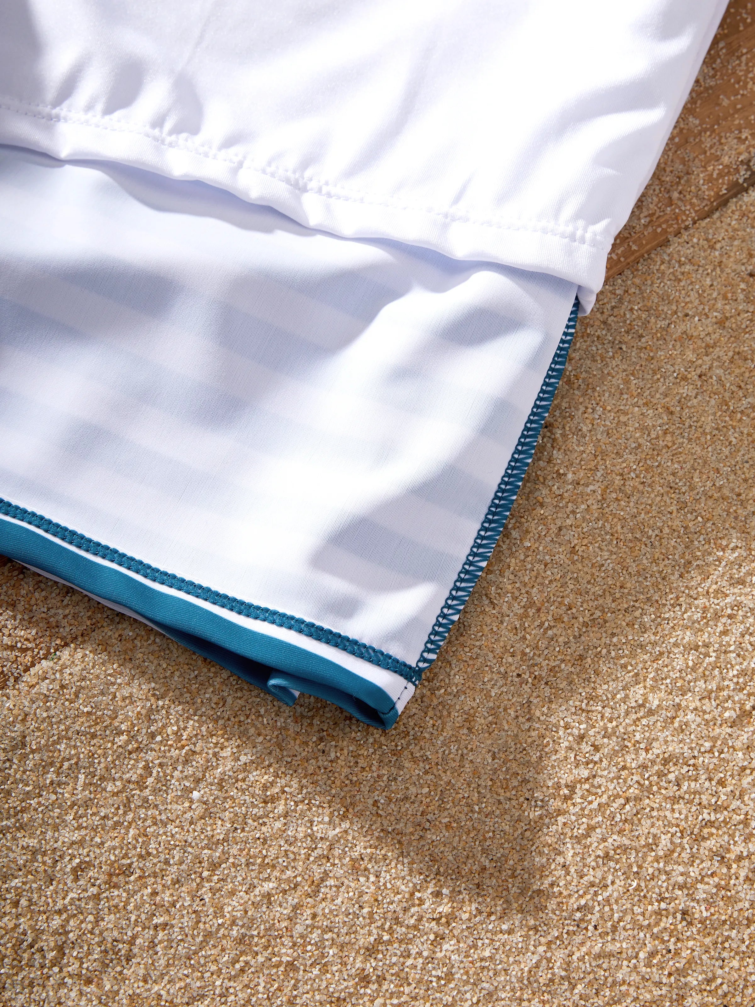• Men’s Swim Trunks: Quick-drying, lightweight fabric with an adjustable drawstring waist and side pockets, adorned with bold teal and white horizontal stripes.
