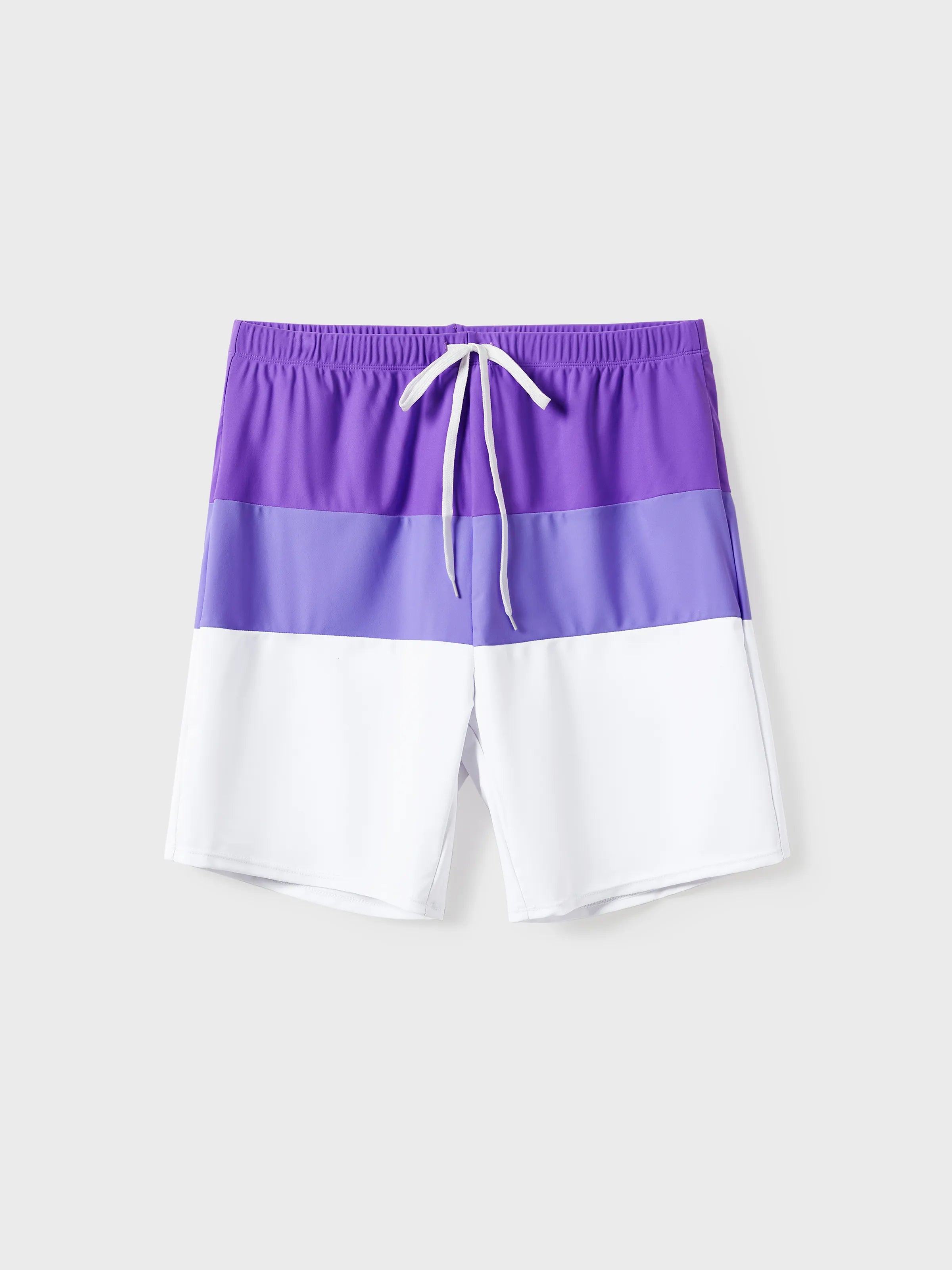 Embrace your casual vacation side with this purple and light lavender family swimsuit set, featuring a bow tie at the waist, an adjustable waist cord for dad/boy. Perfect for tropical vacations.
