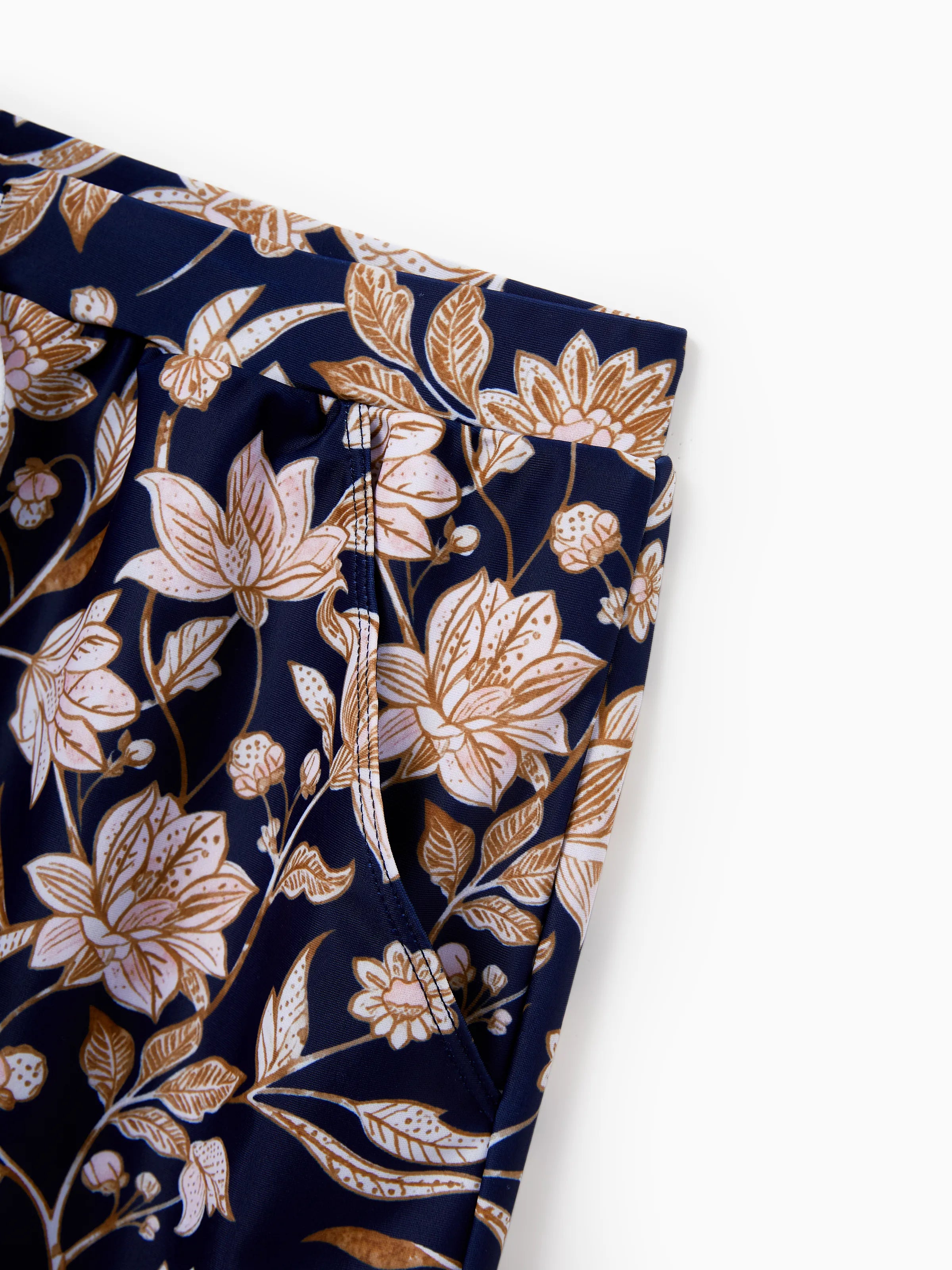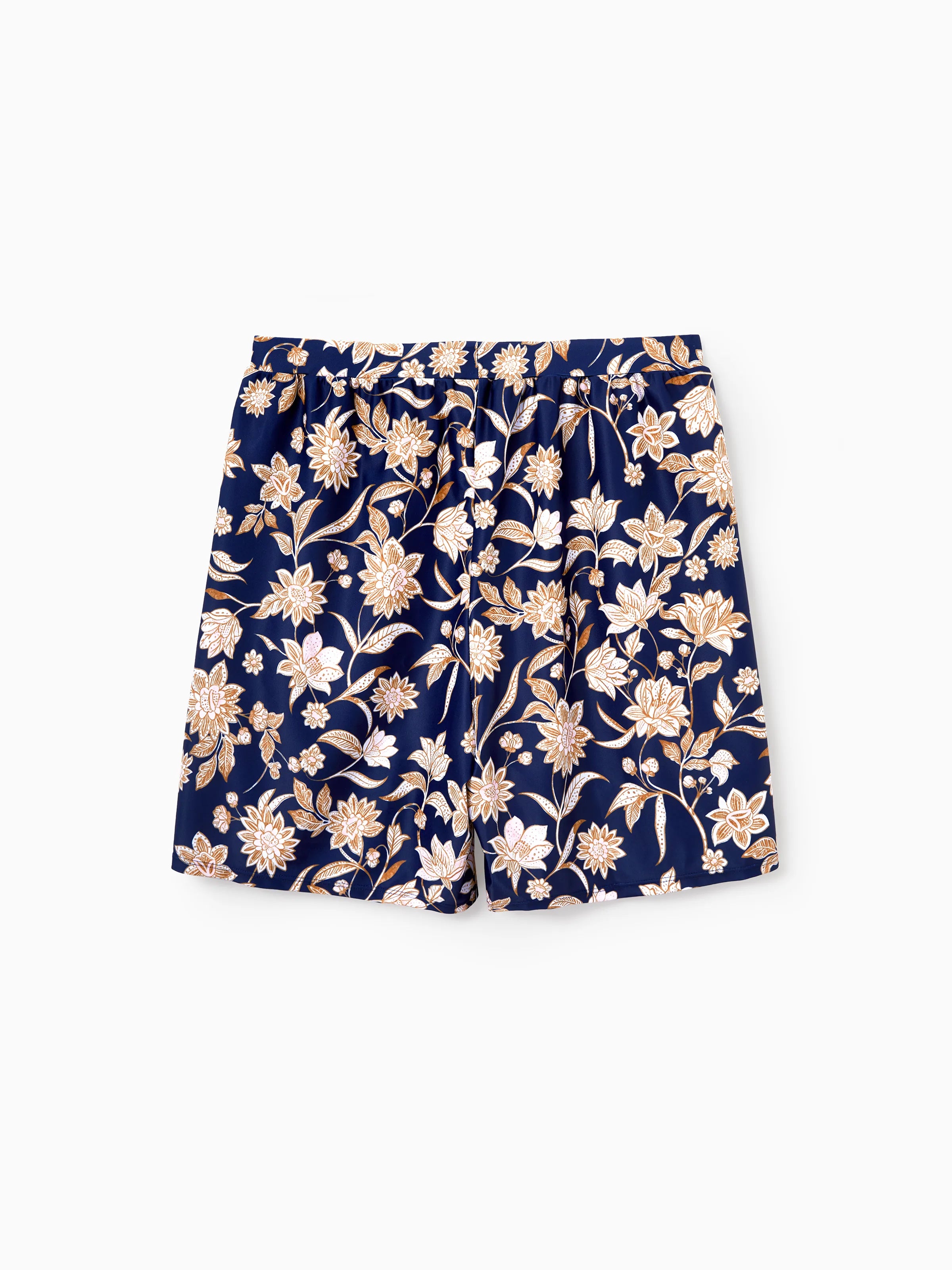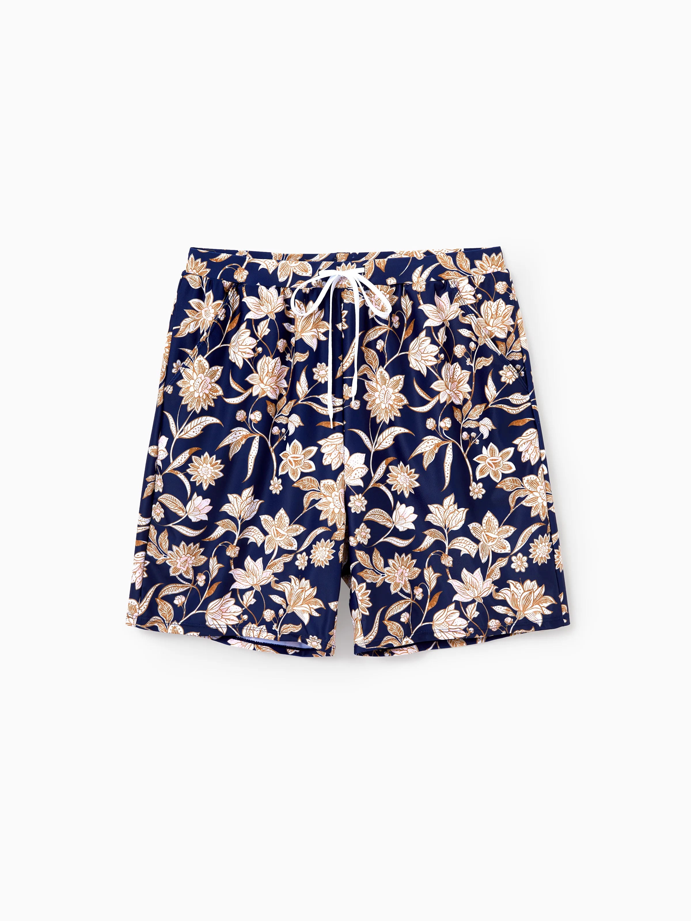Daddy & Son Floral Print Swimsuits 2-in-1 One-Piece Swimsuit & Swim Trunks Deep Blue