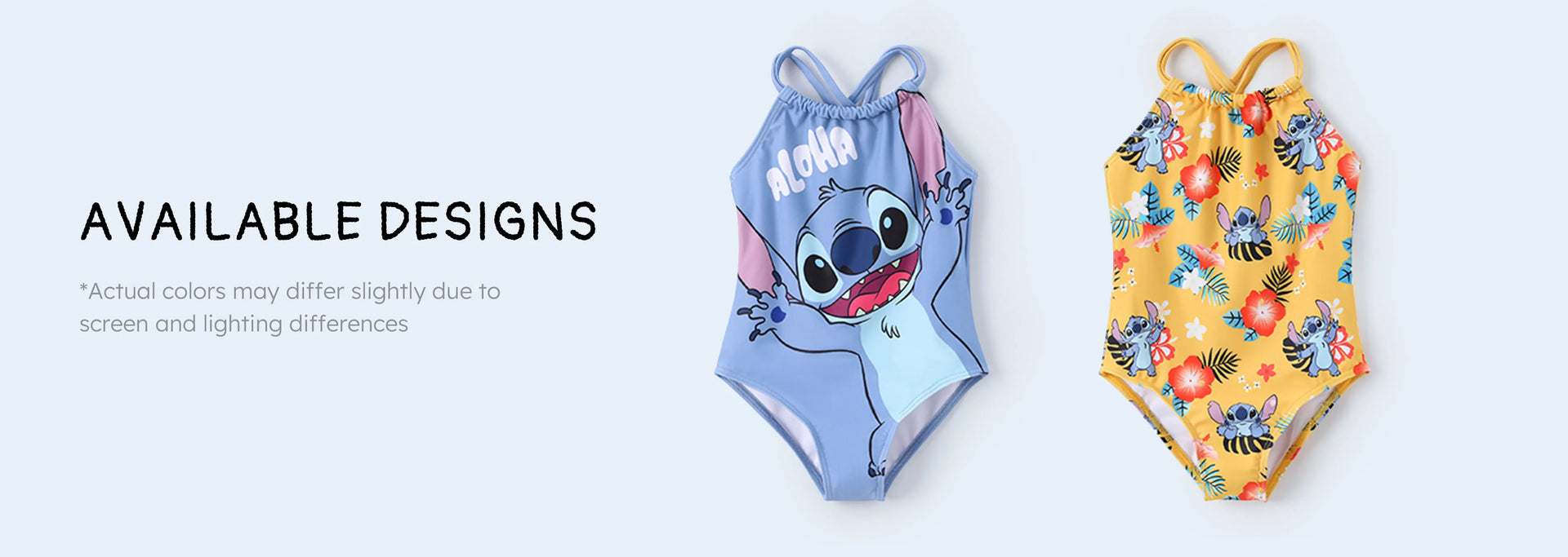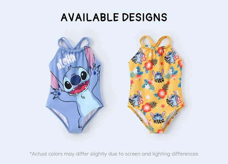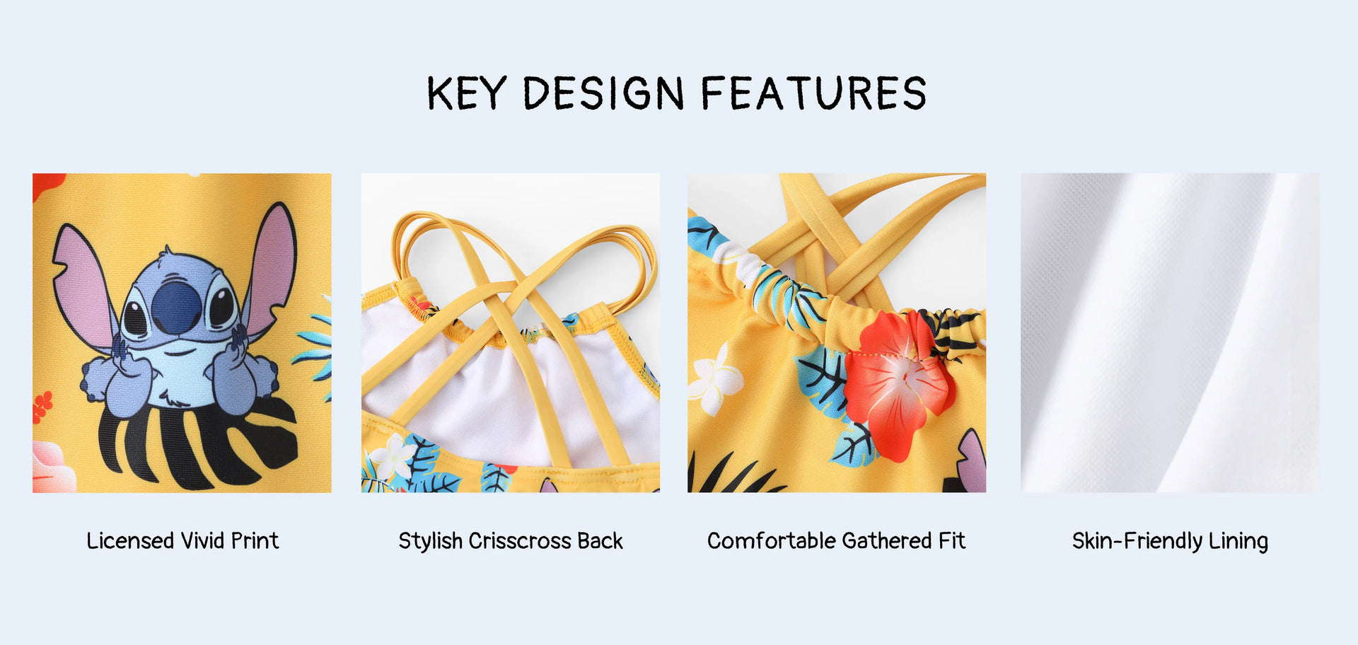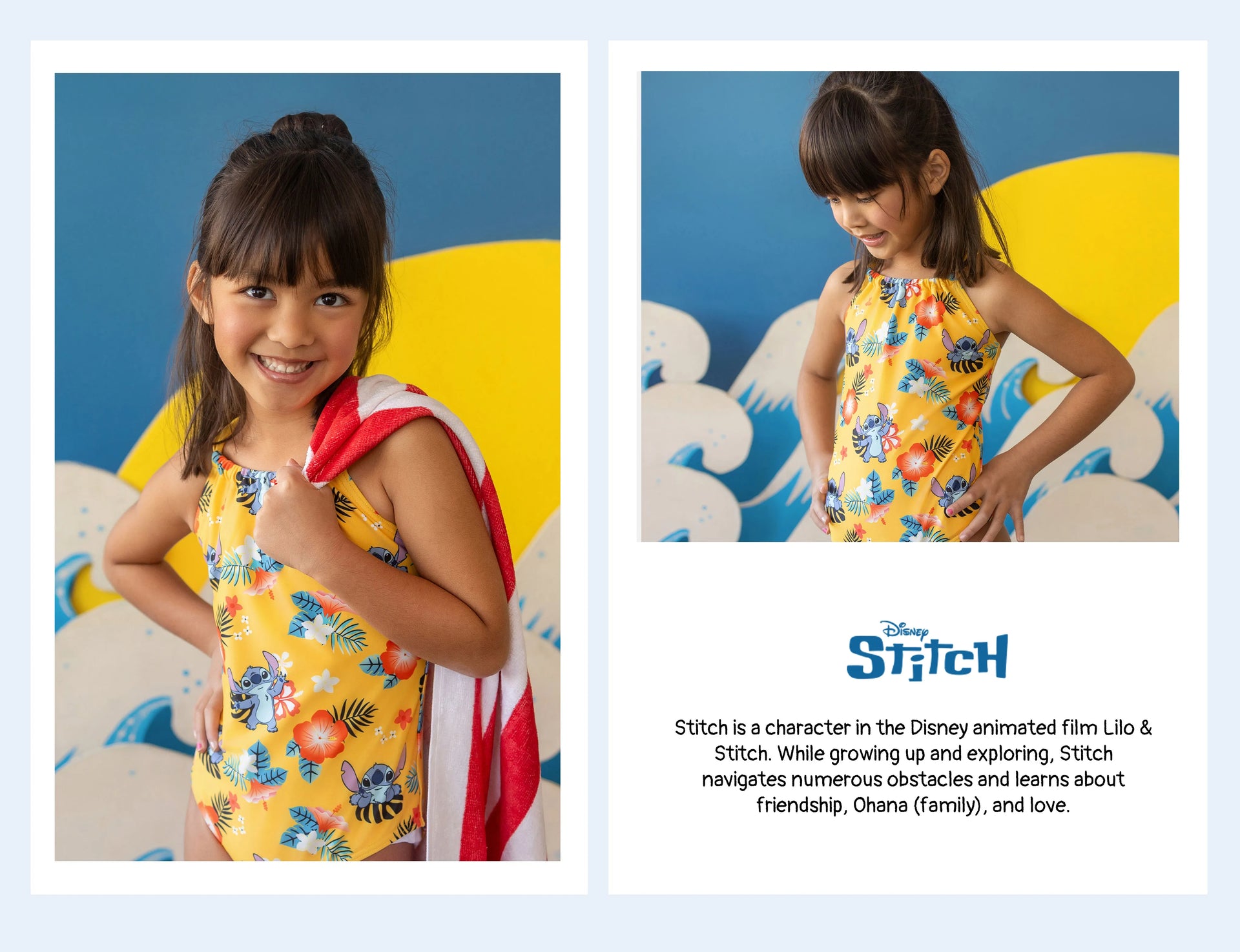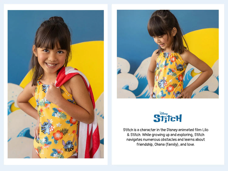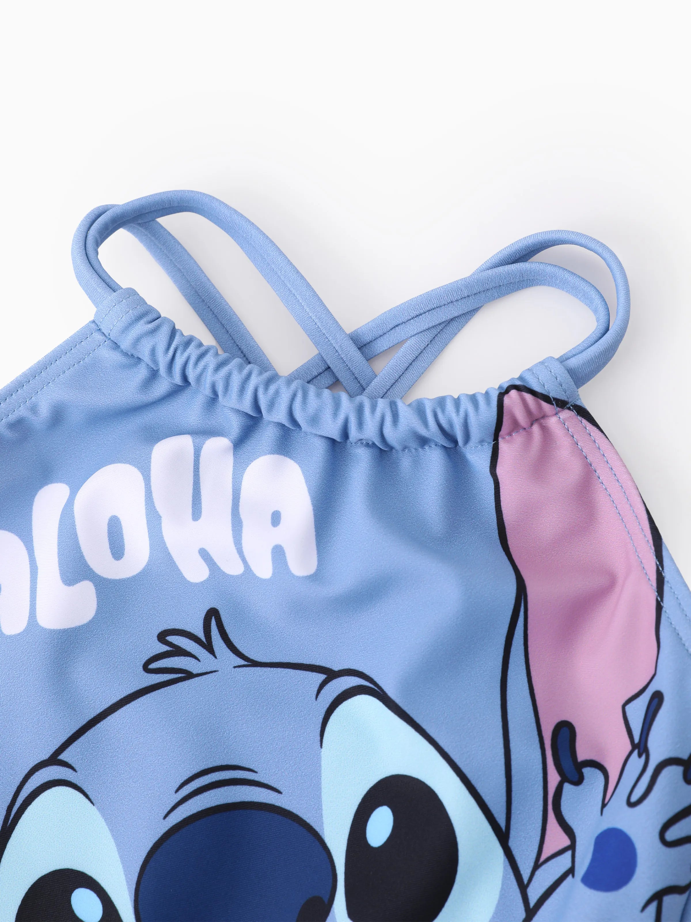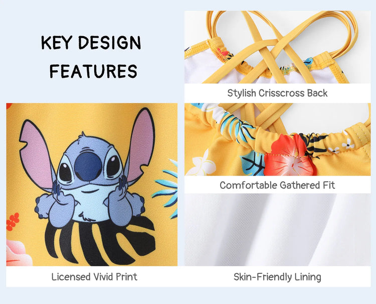 Maillot de bain fille Disney Stitch, ludique et tendance, à épaules dénudées, en tissu résistant au soleil et à séchage rapide. Son design dos nu élégant, avec ses motifs amusants et ses imprimés végétaux, sublimera votre style.