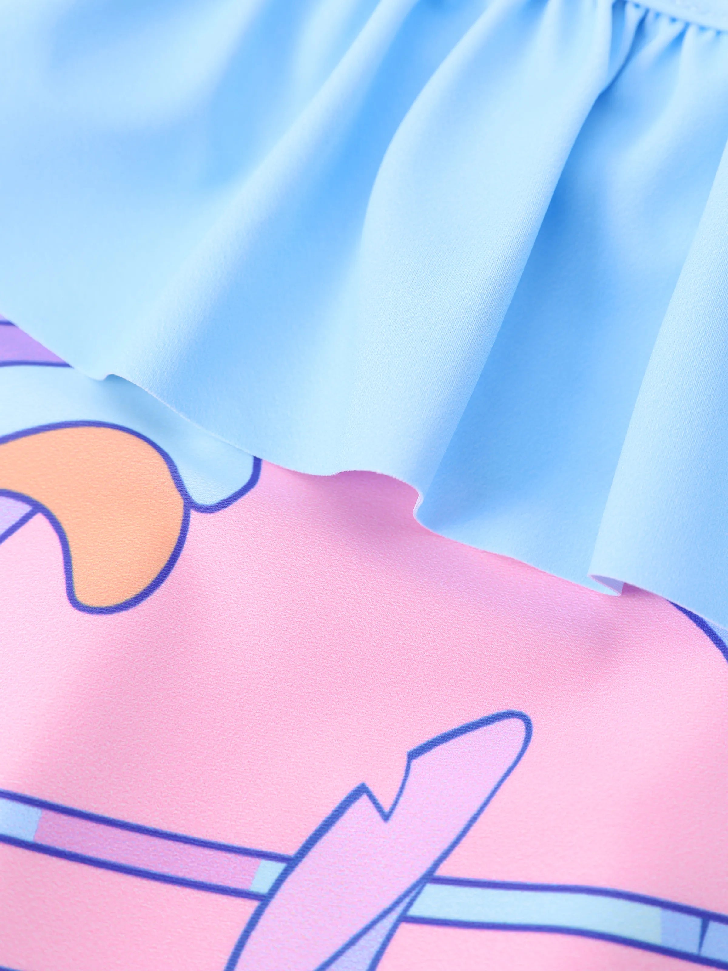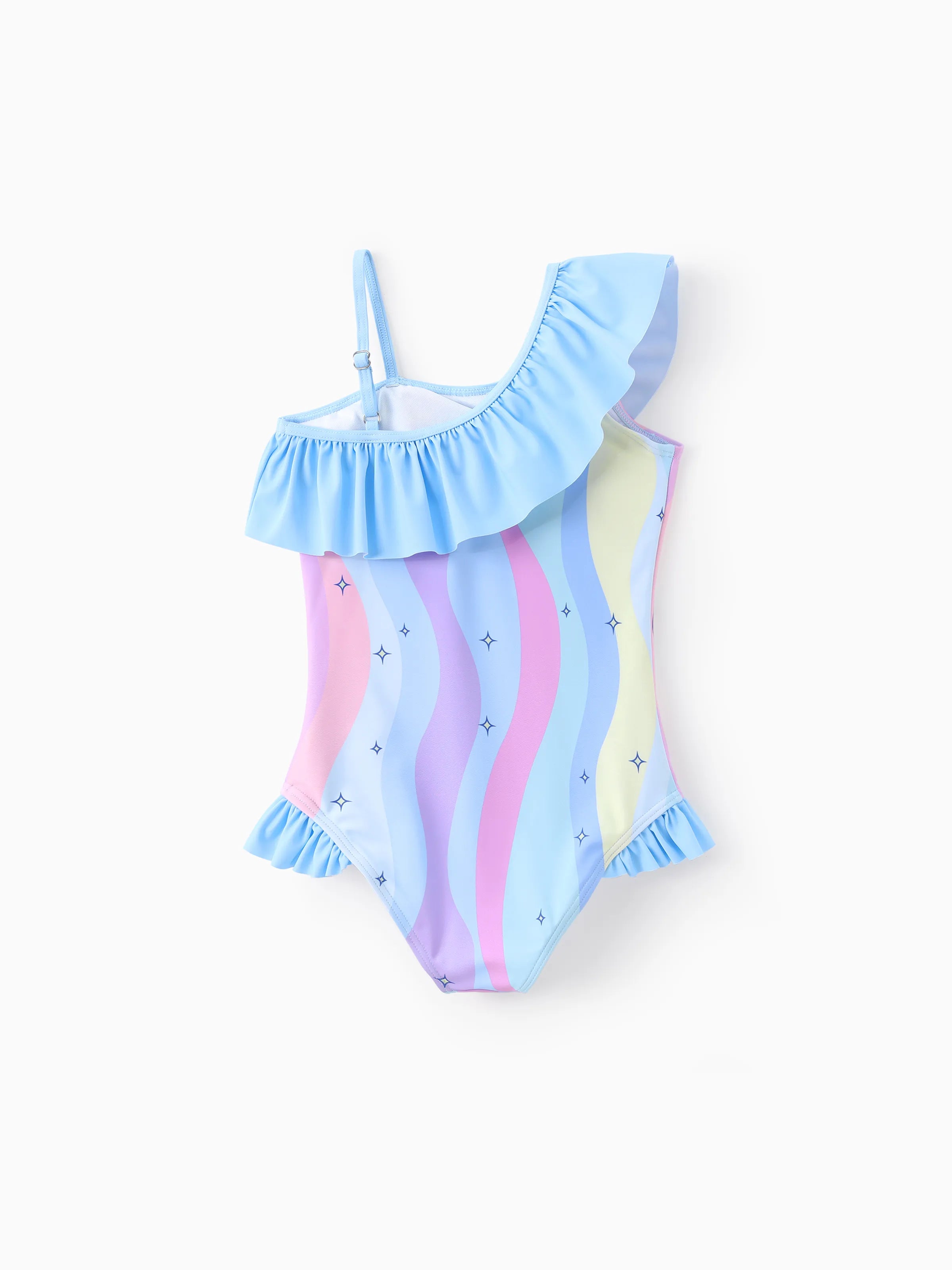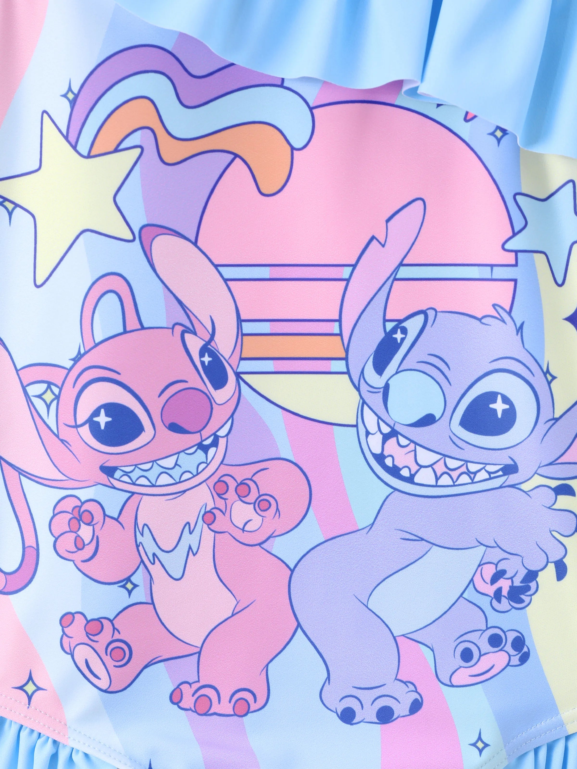 Maillot de bain 1 pièce Disney Stitch pour petite fille, imprimé floral et rayé coloré, épaules dénudées, volants, UPF 50+, bleu