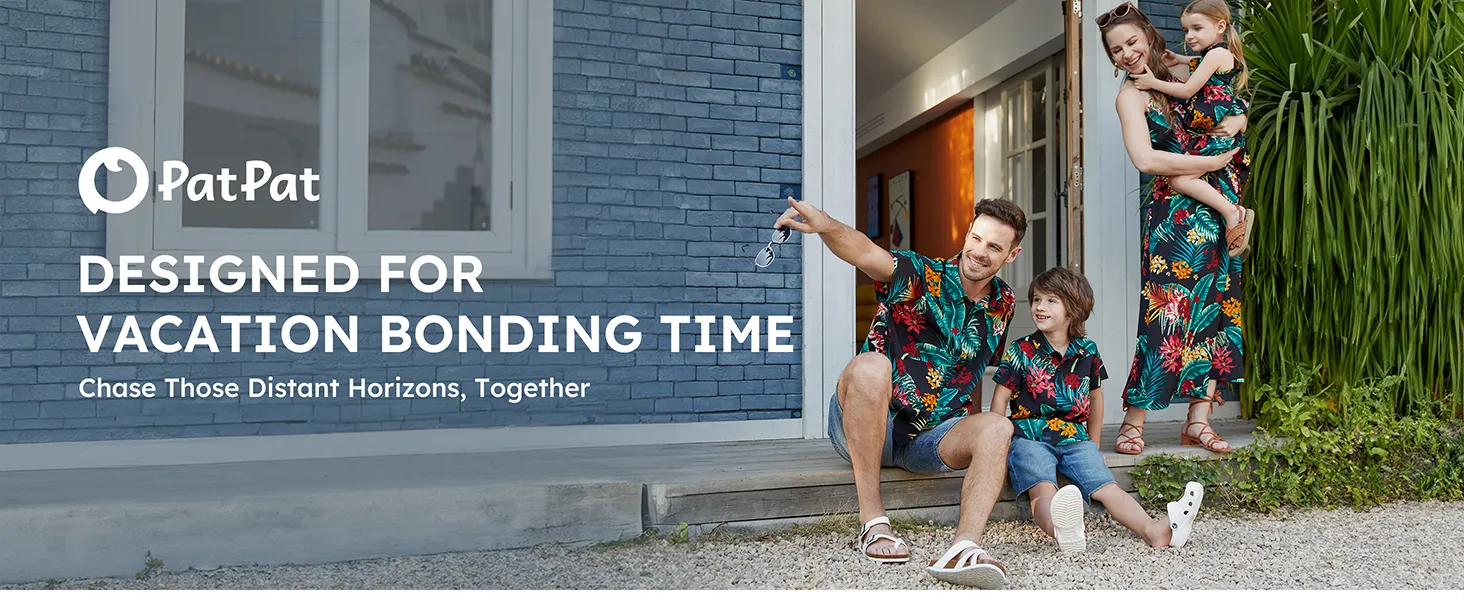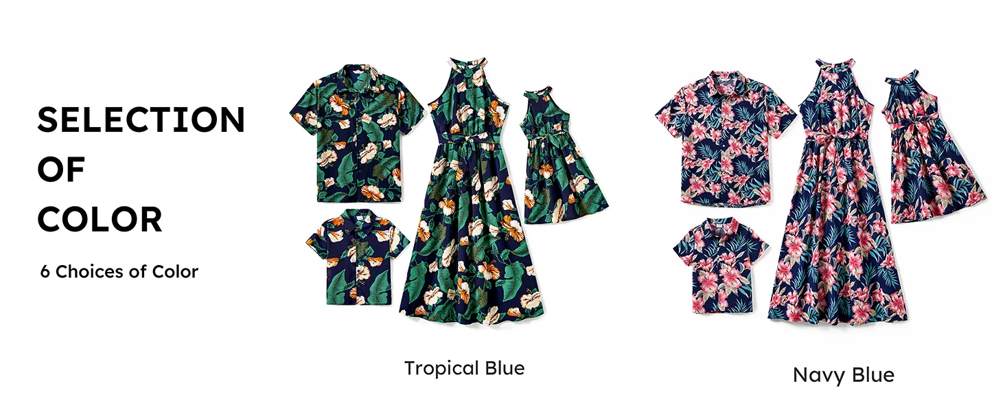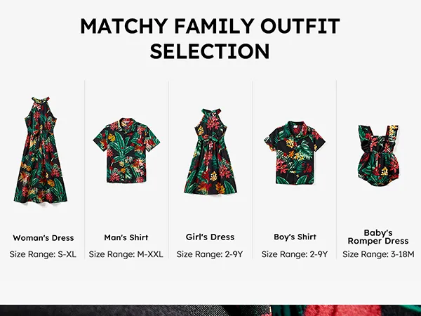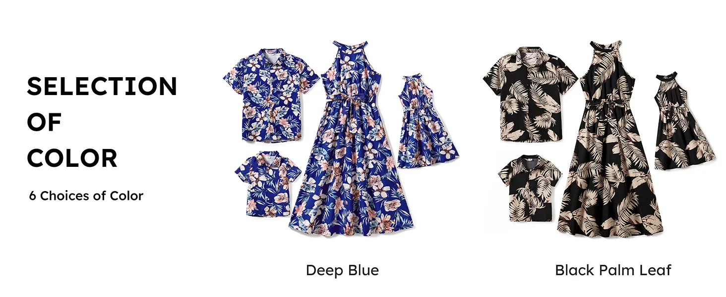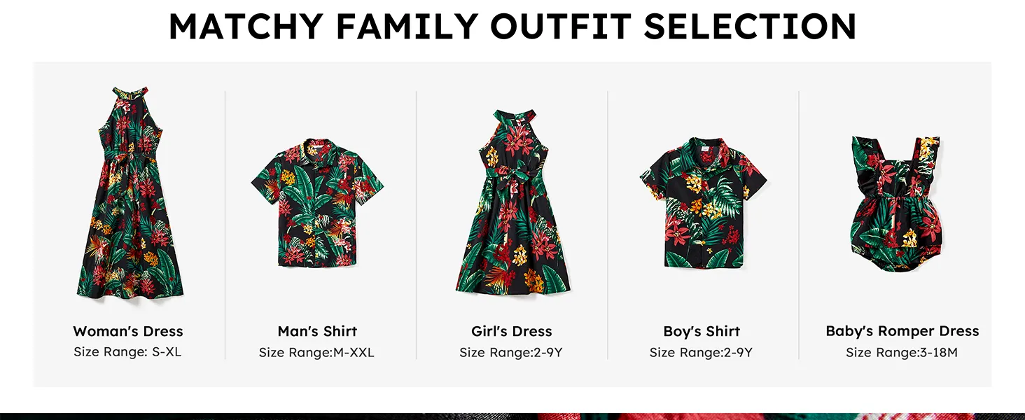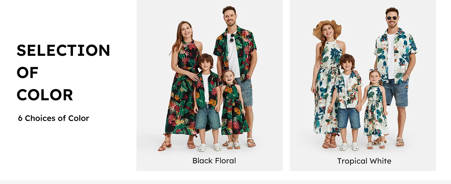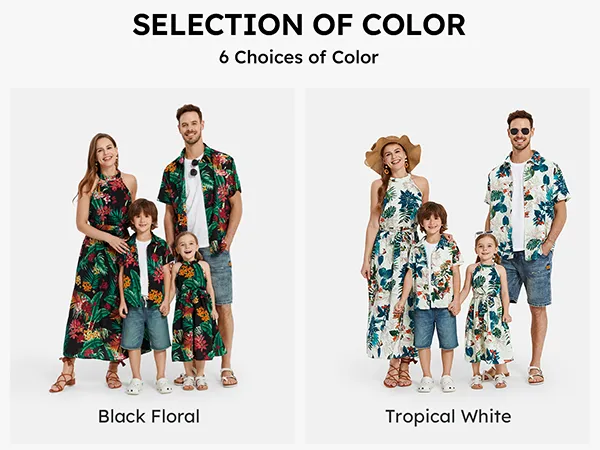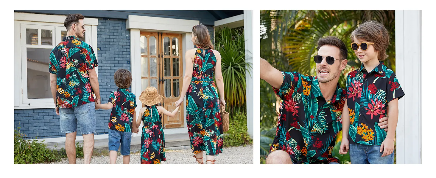 Rehaussez la garde-robe d'été de votre famille avec notre ensemble de robes dos nu et de chemises à manches courtes orné d'un imprimé floral végétal sur toute la surface et d'un élégant col licou.