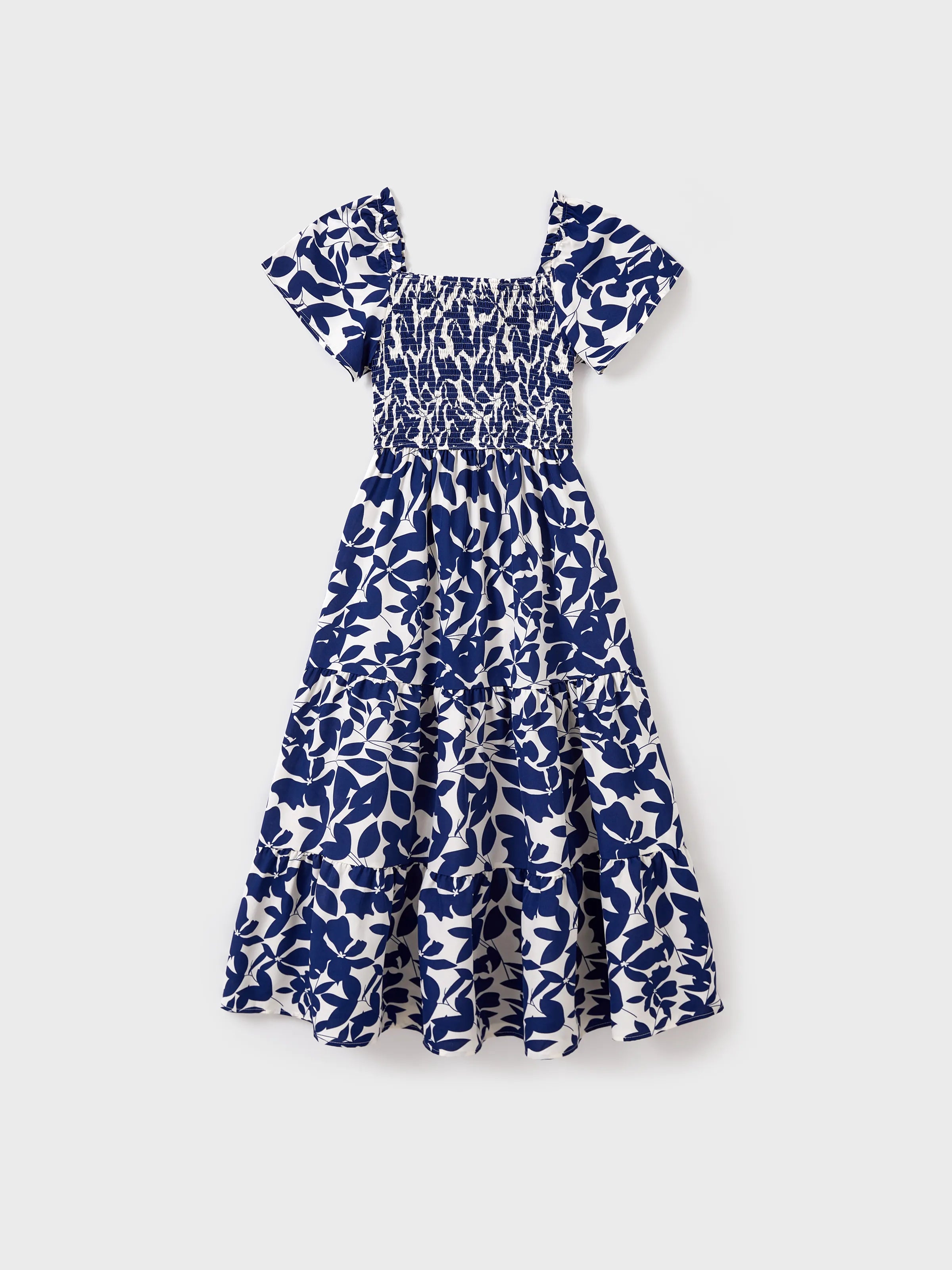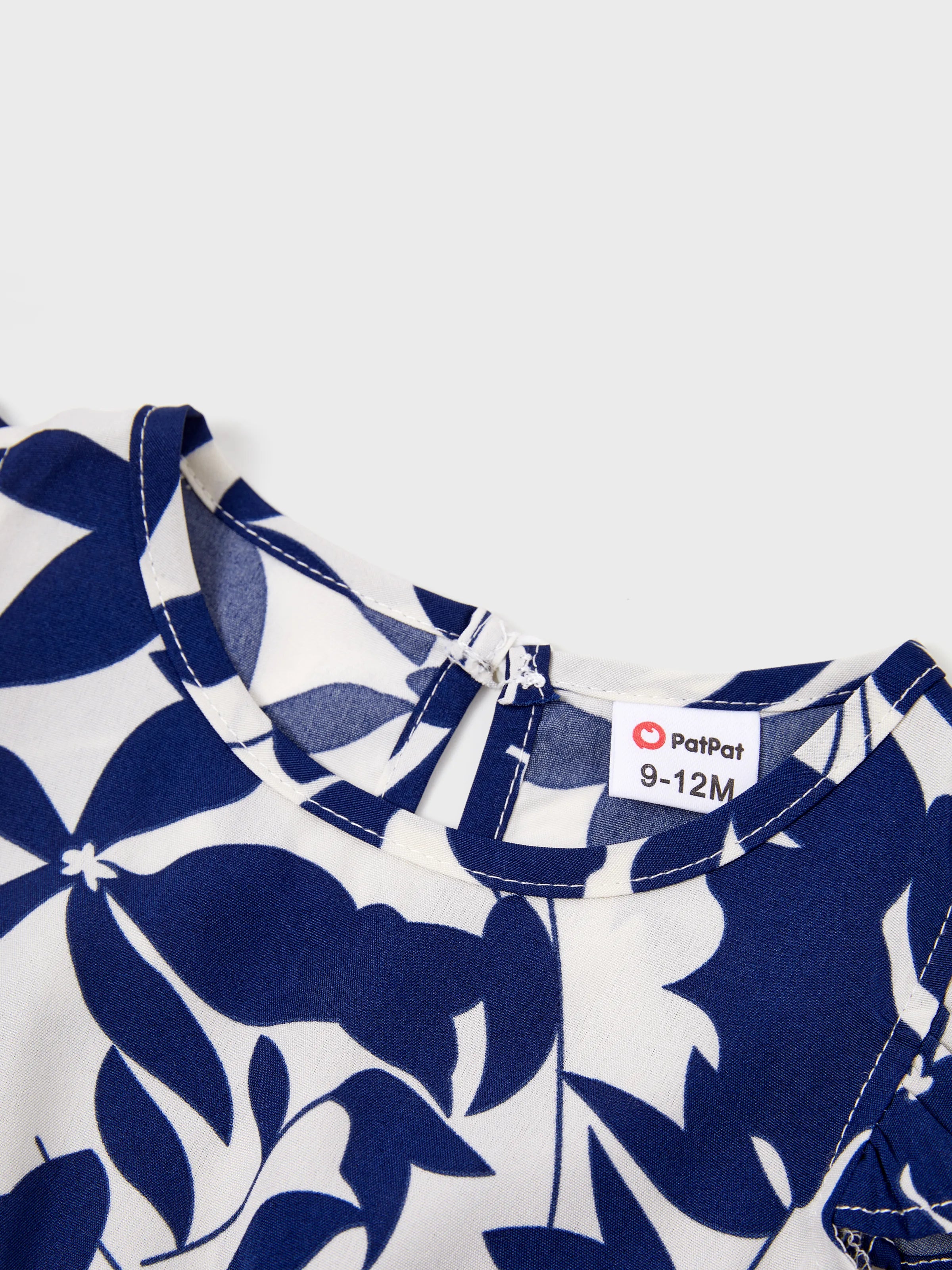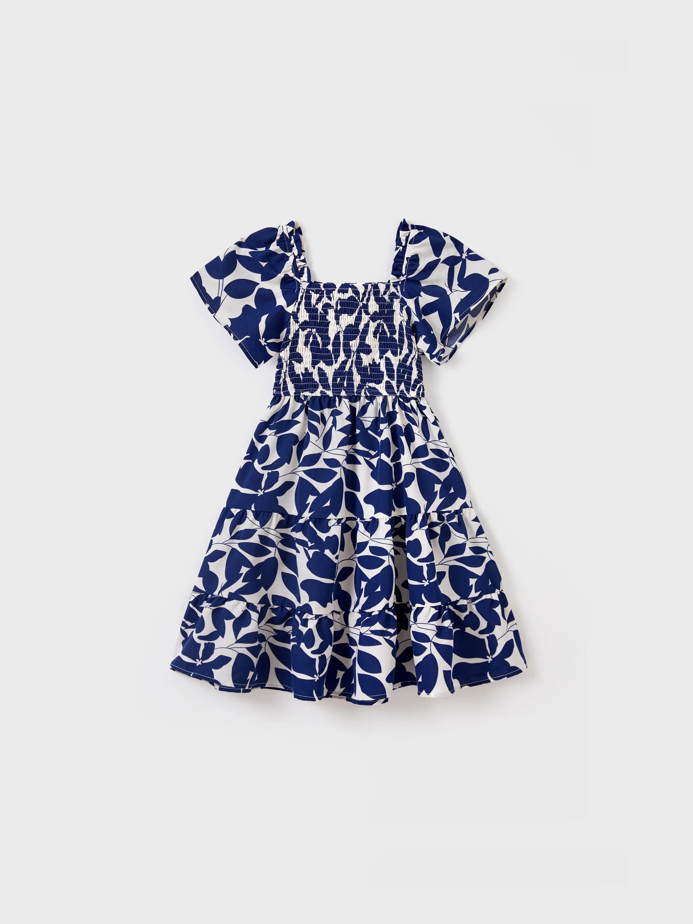 Ensemble familial assorti avec t-shirt bleu à blocs de couleurs ou robe à manches bouffantes et smocks à imprimé feuilles
