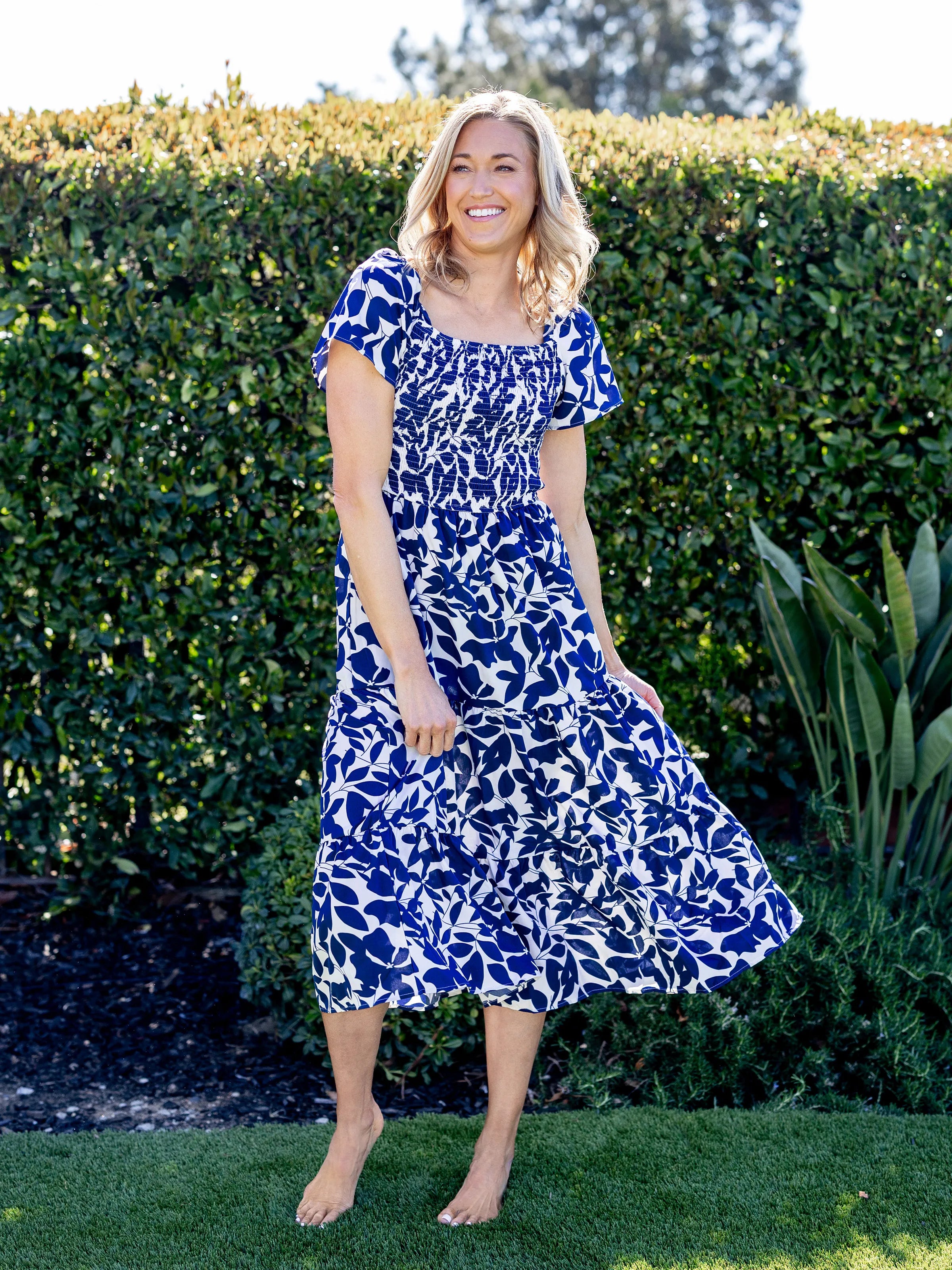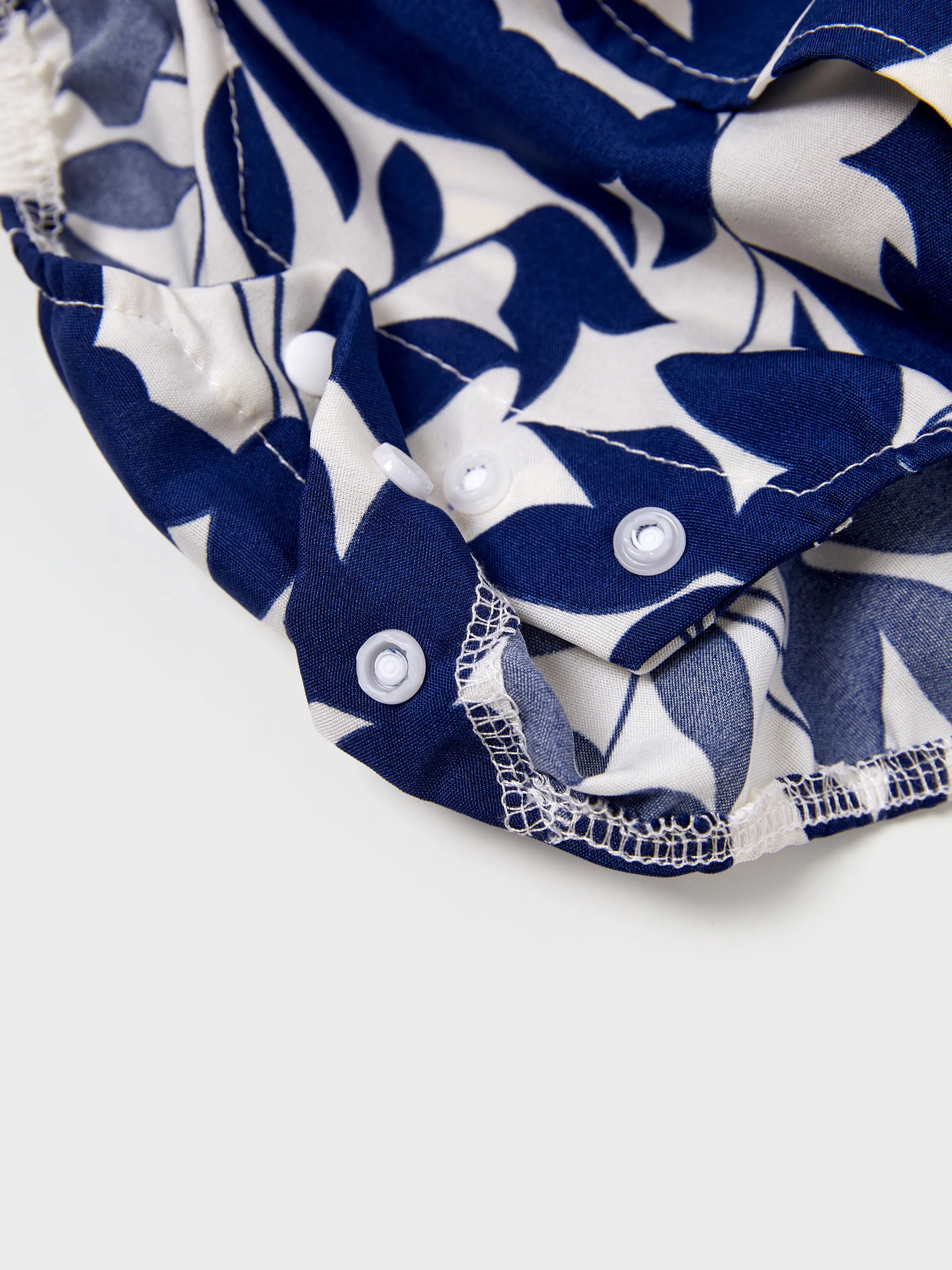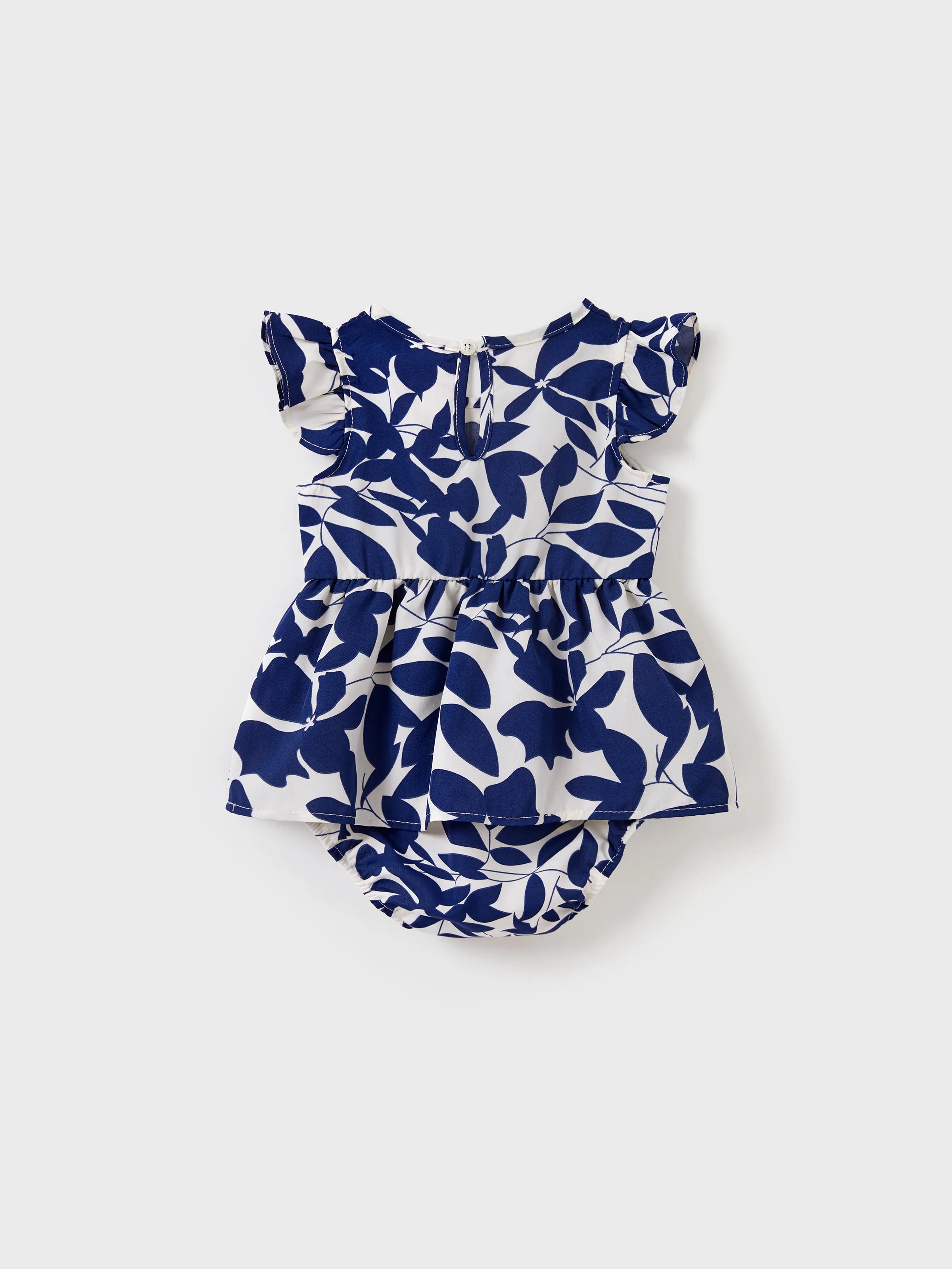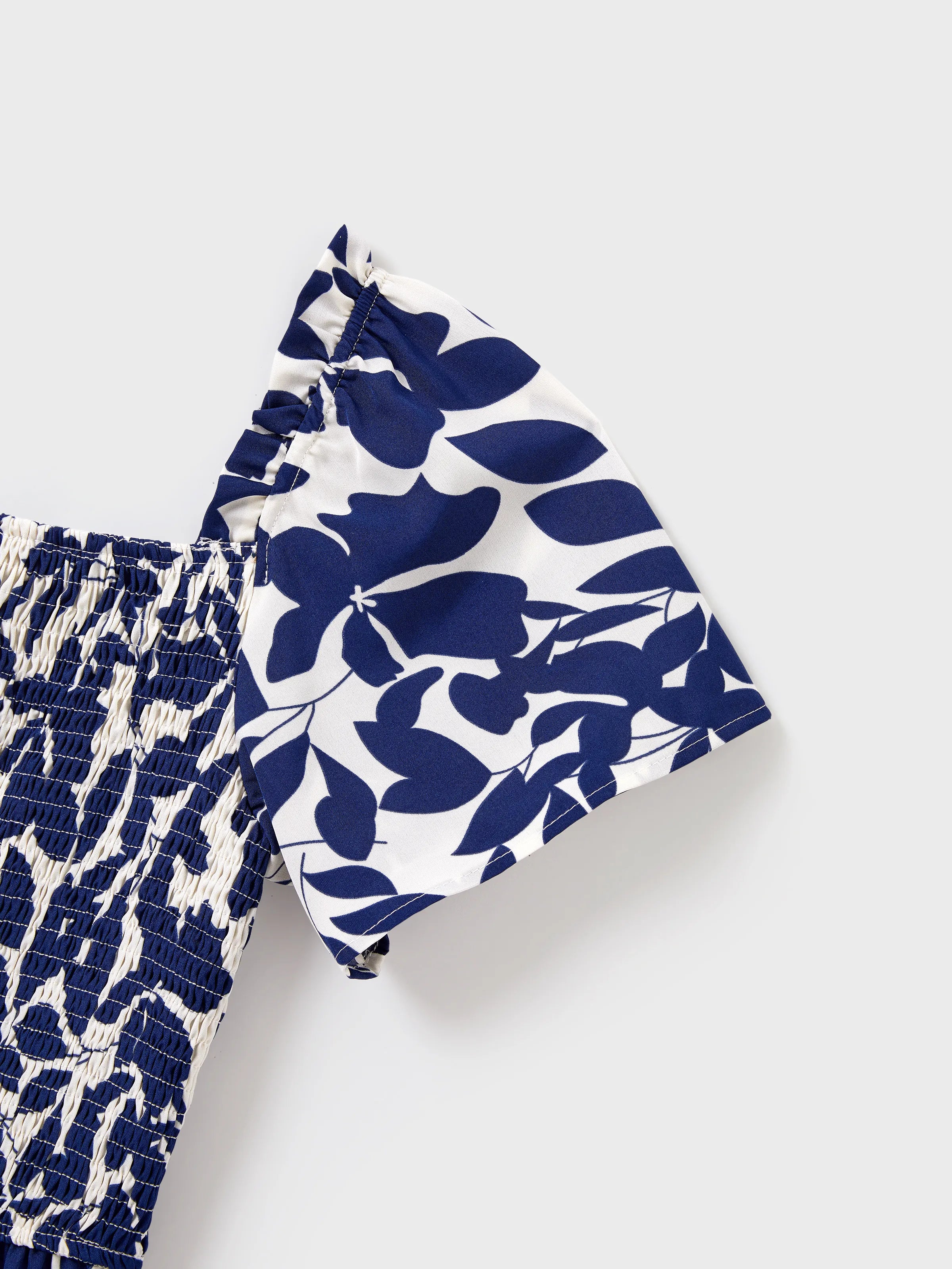 Ensemble familial assorti avec t-shirt bleu à blocs de couleurs ou robe à manches bouffantes et smocks à imprimé feuilles