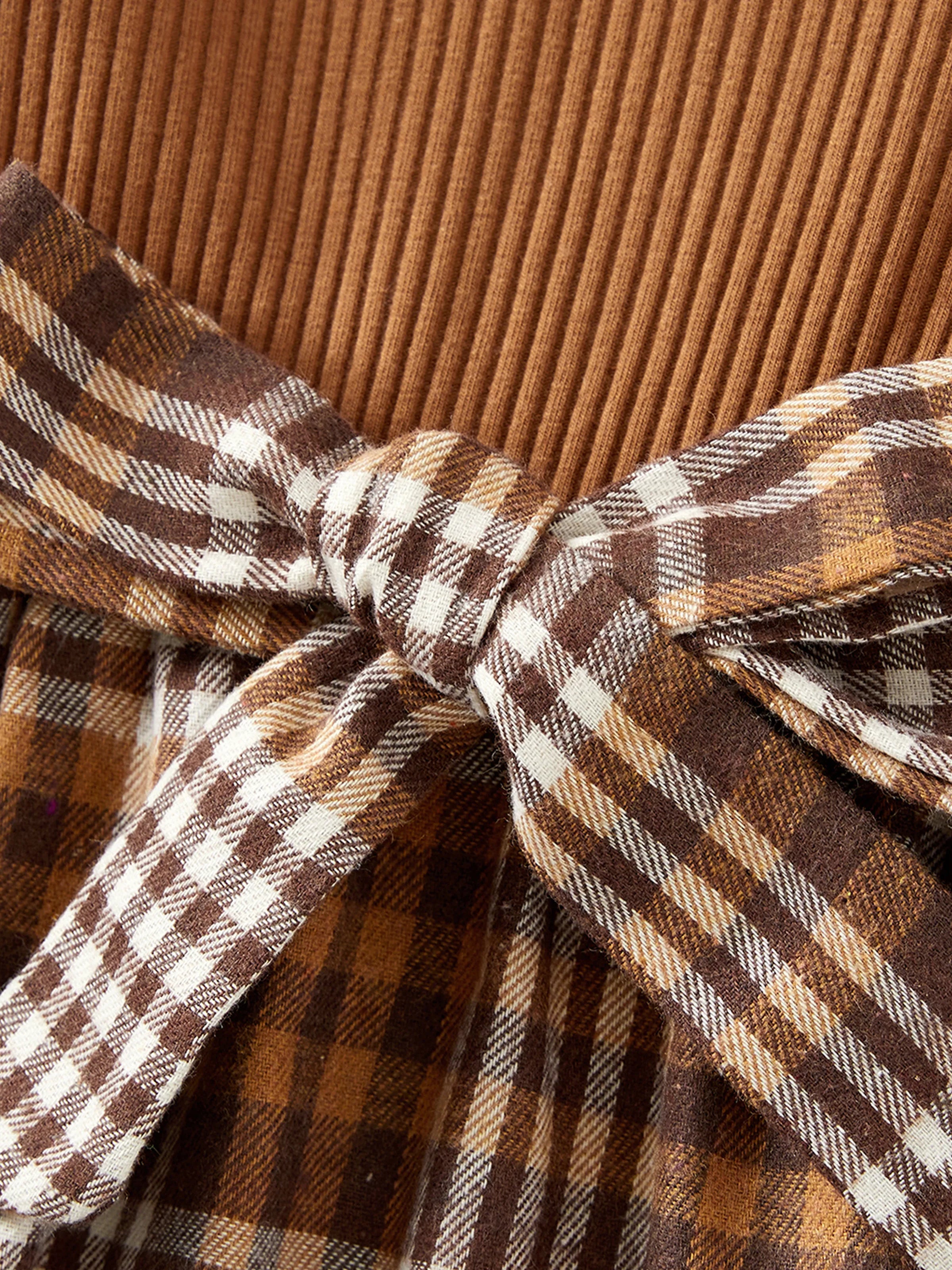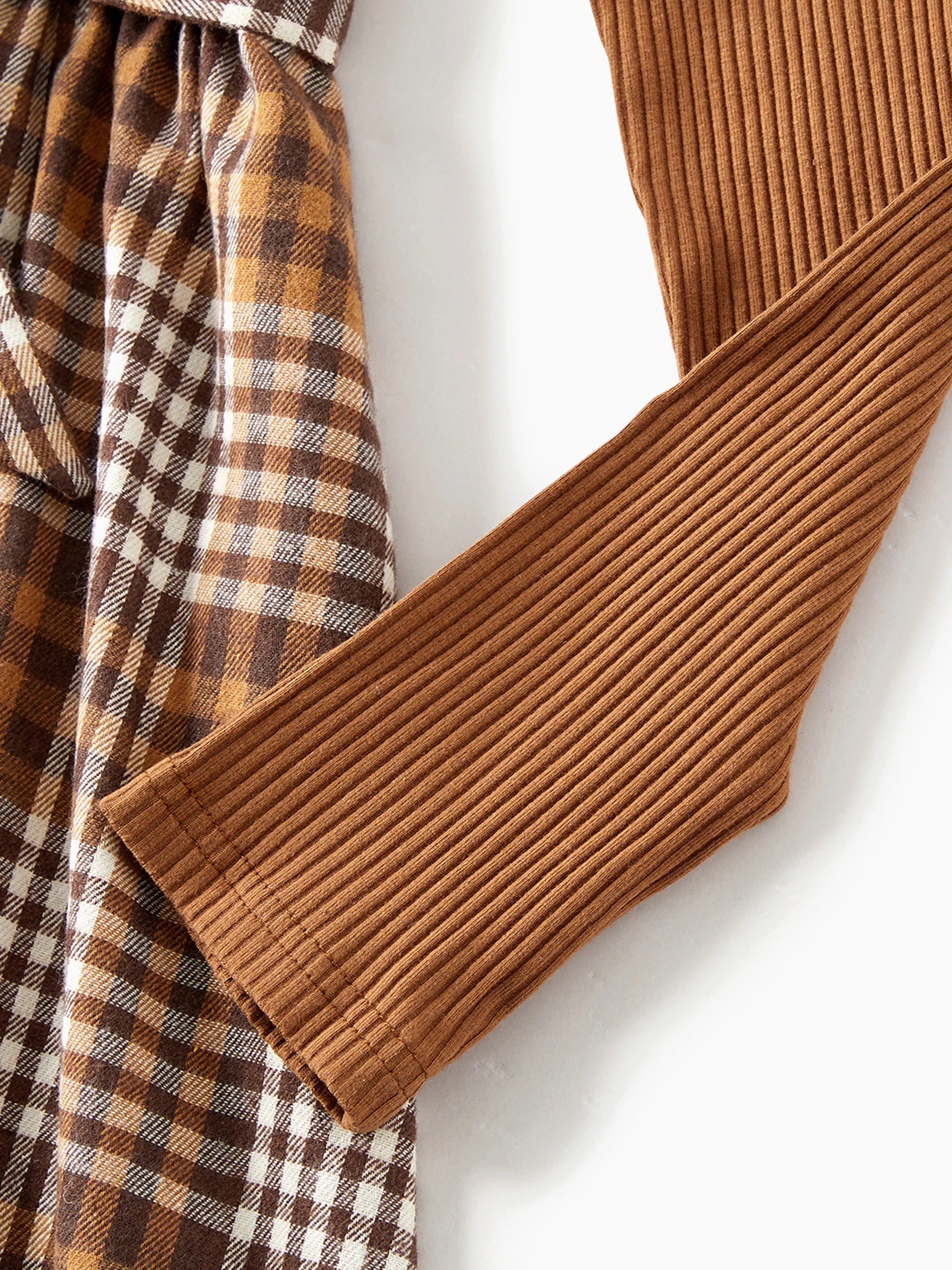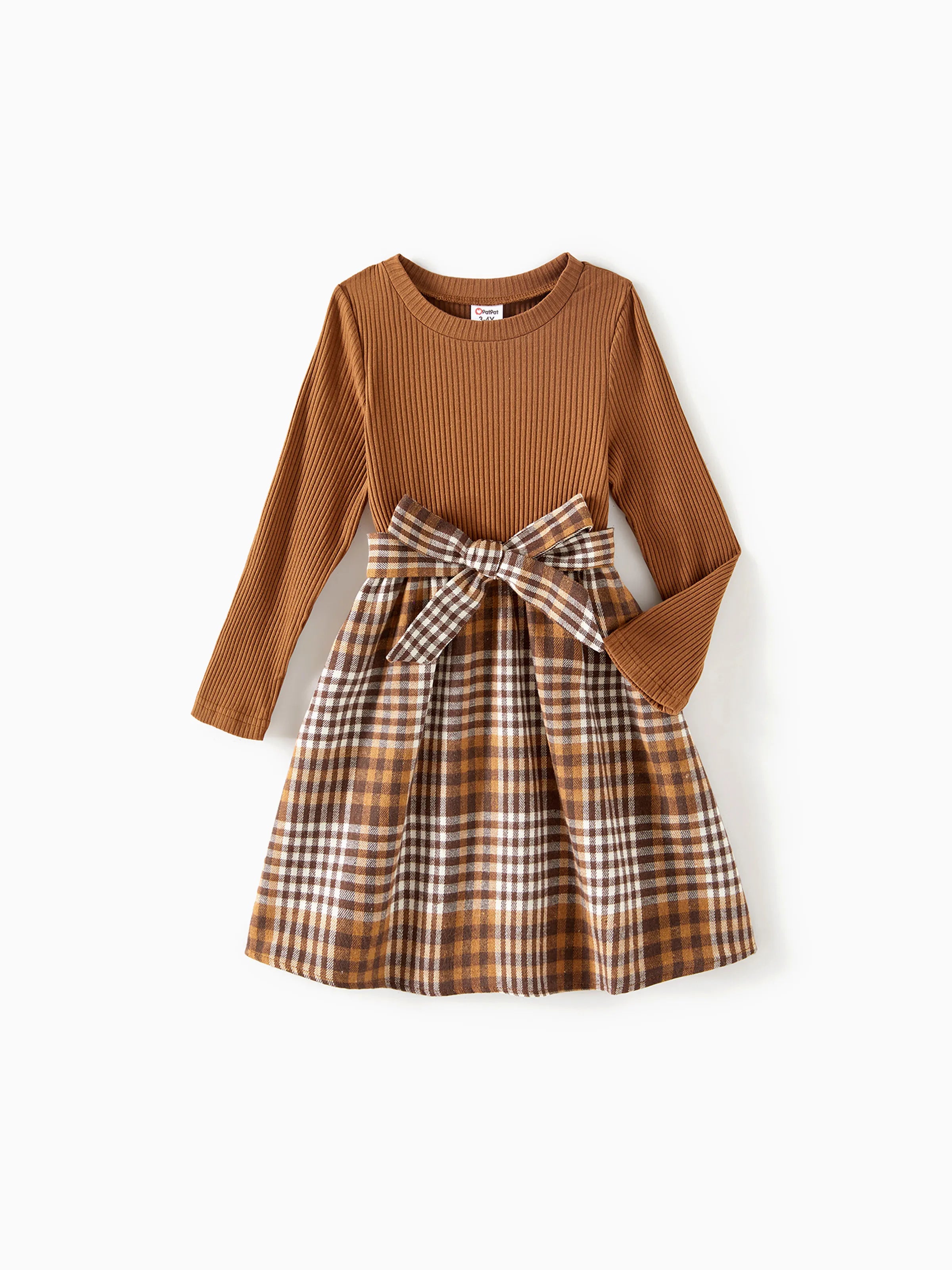 Ensemble familial assorti : robes à carreaux côtelés avec ceinture et hauts à manches longues colorblock couleur café