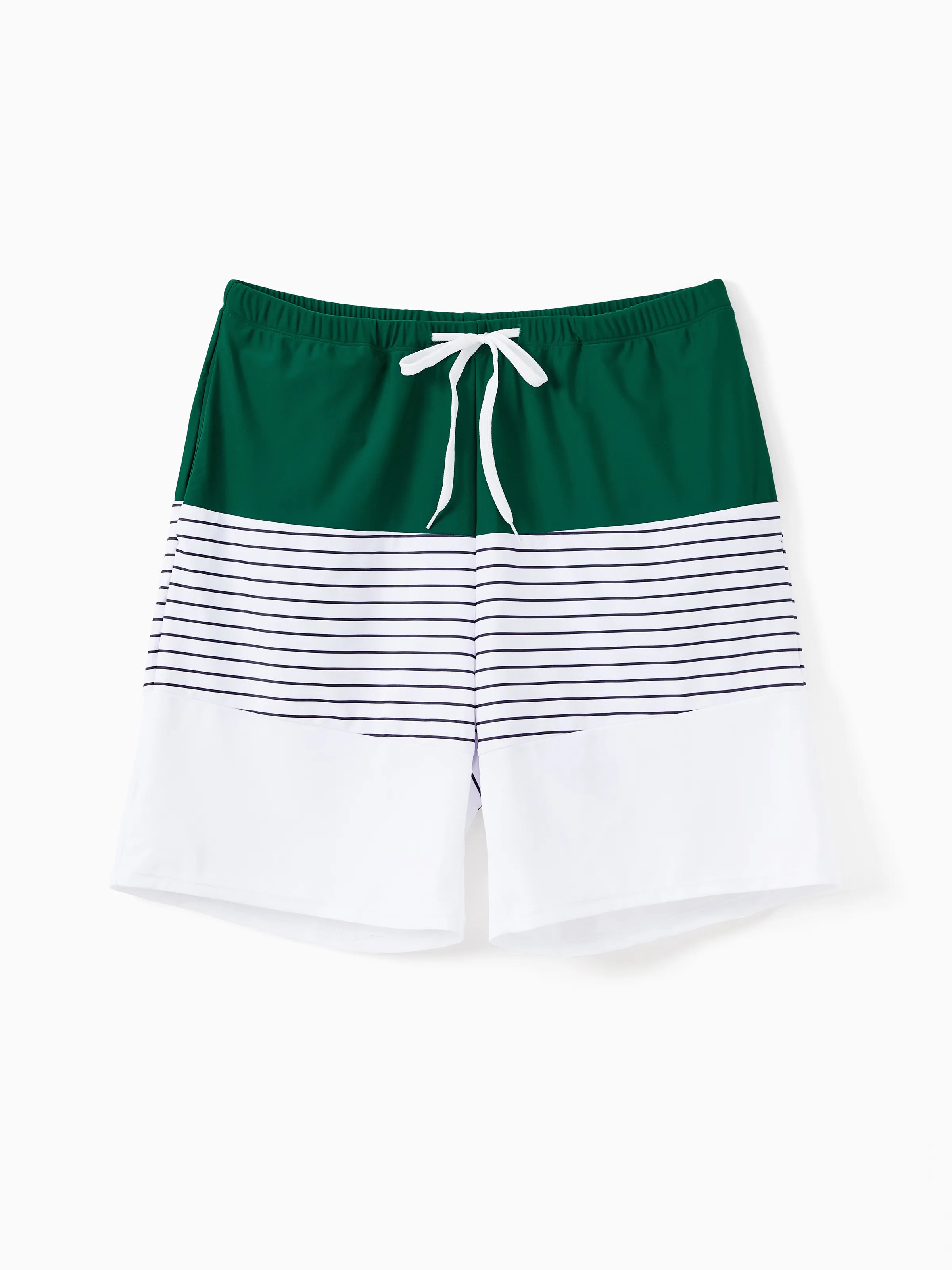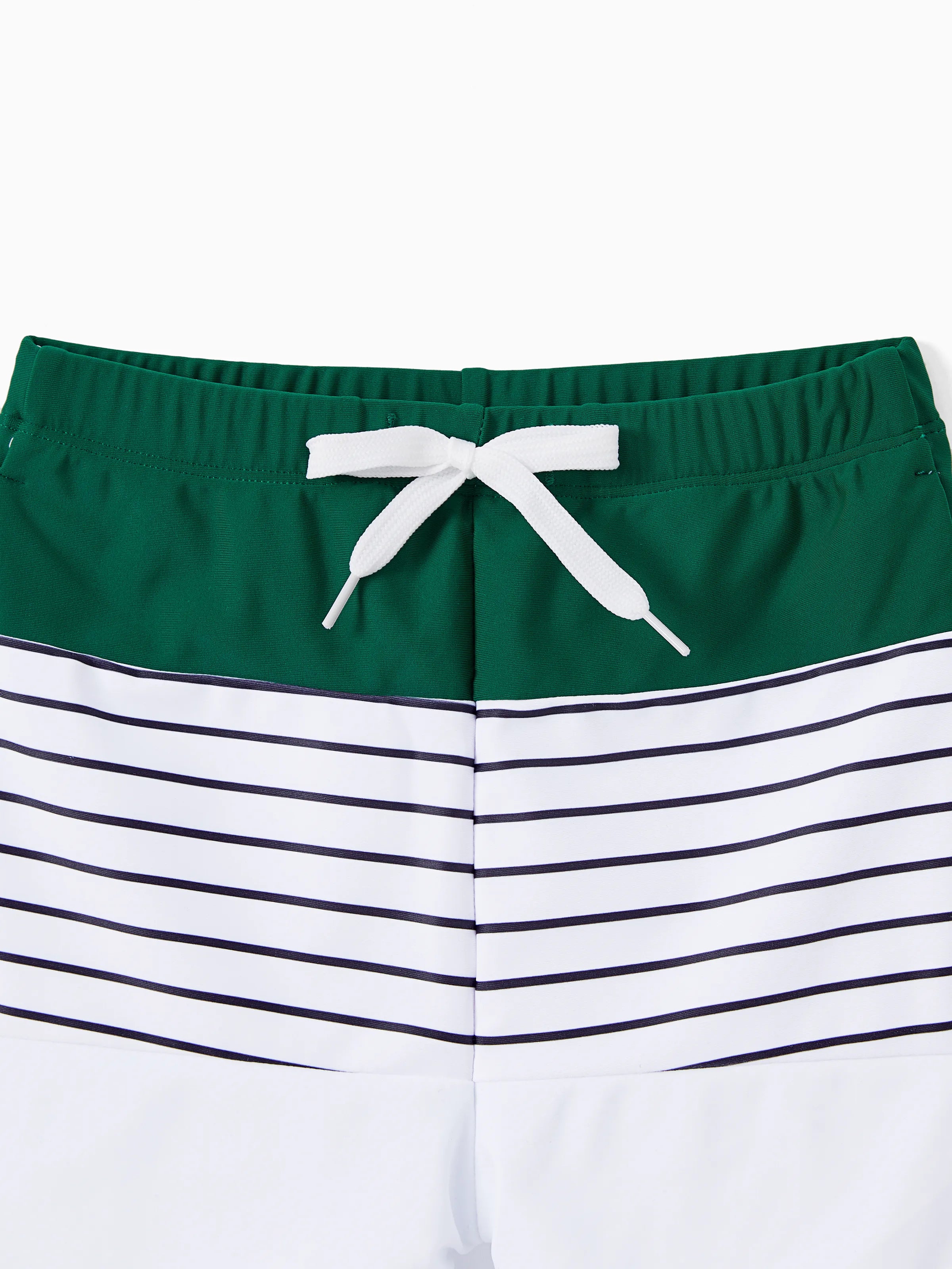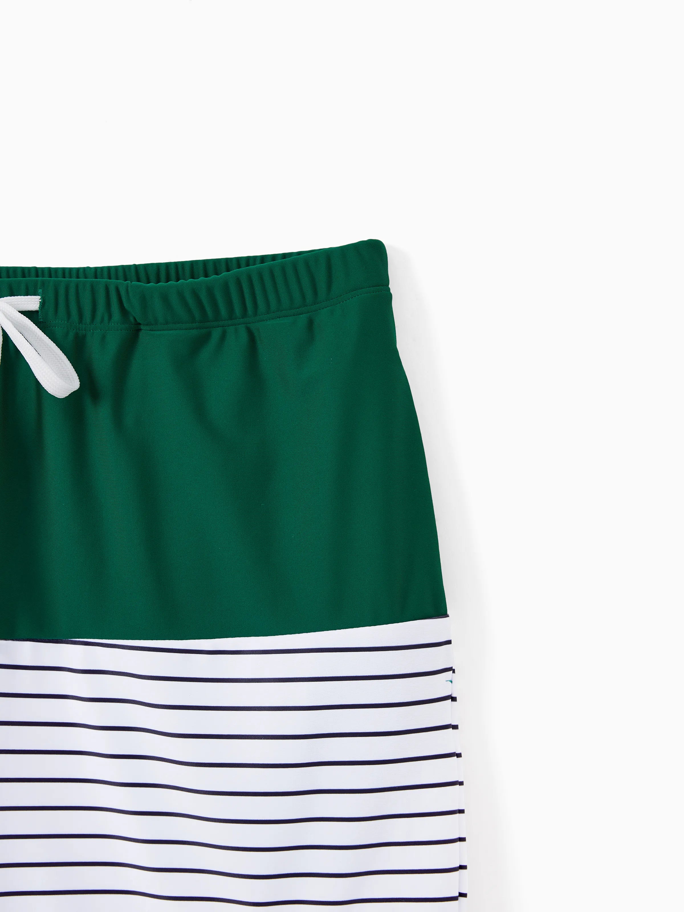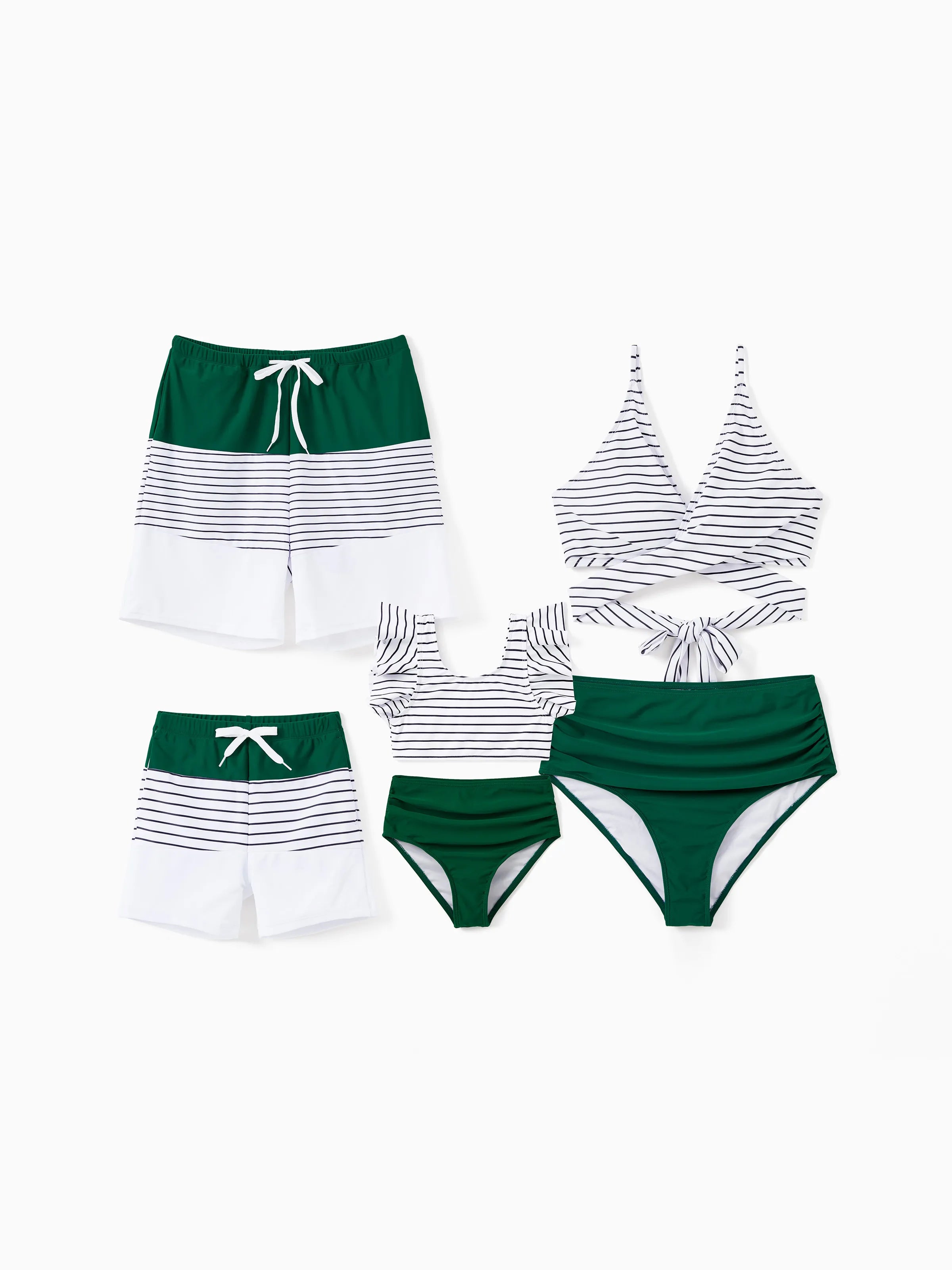Maillots de bain familiaux assortis à rayures vertes, parfaits pour les vacances d'été à la plage.