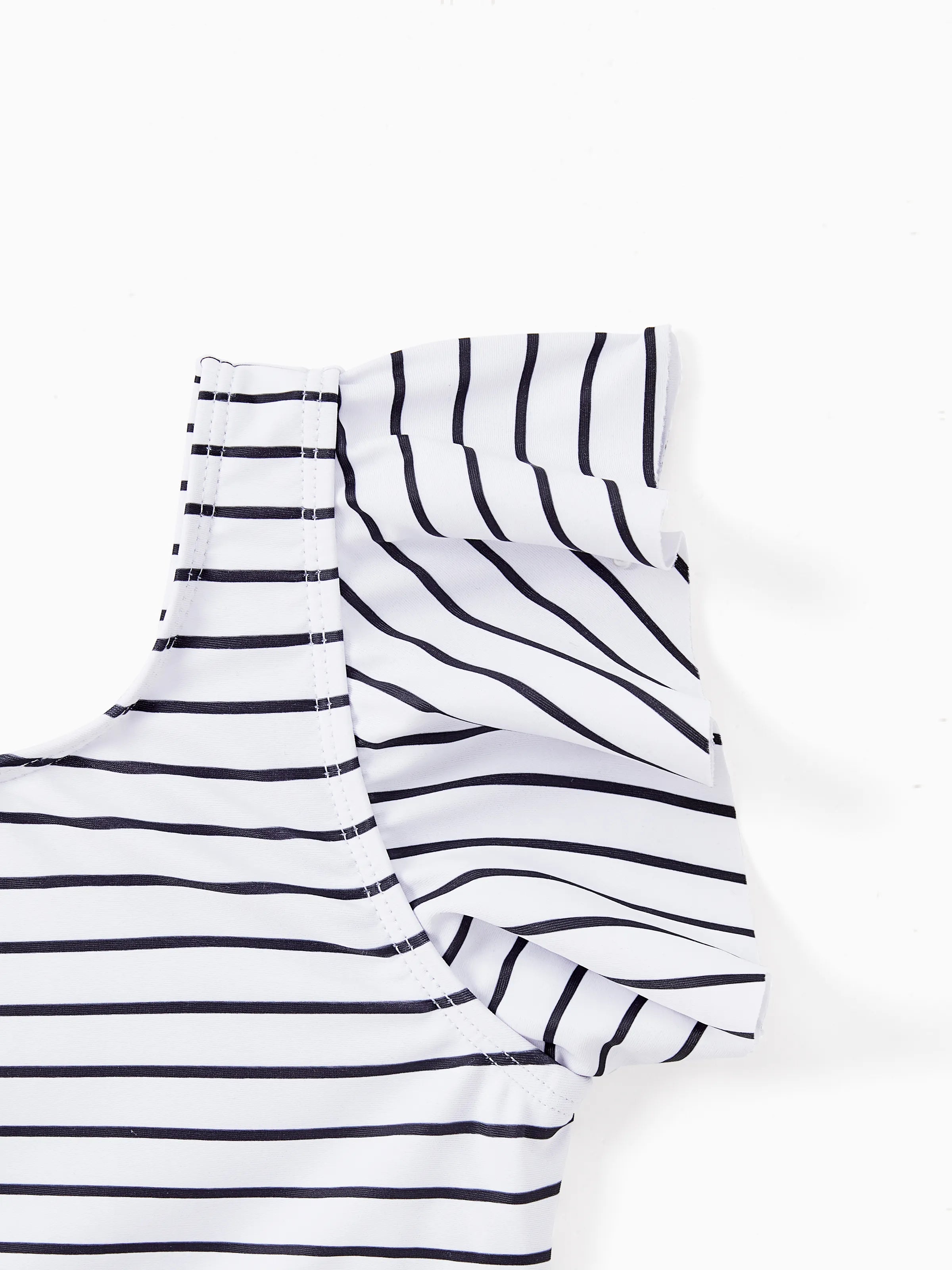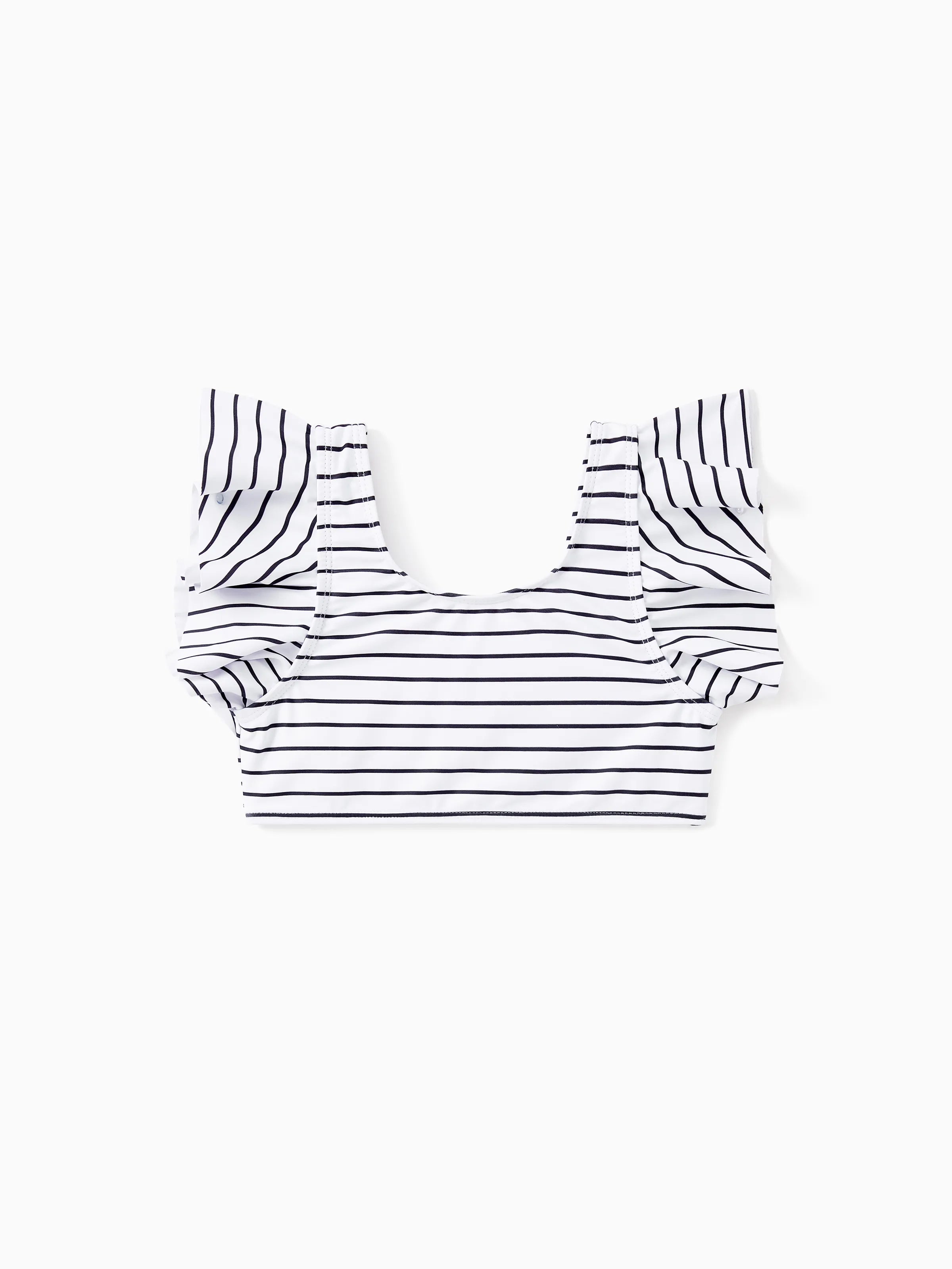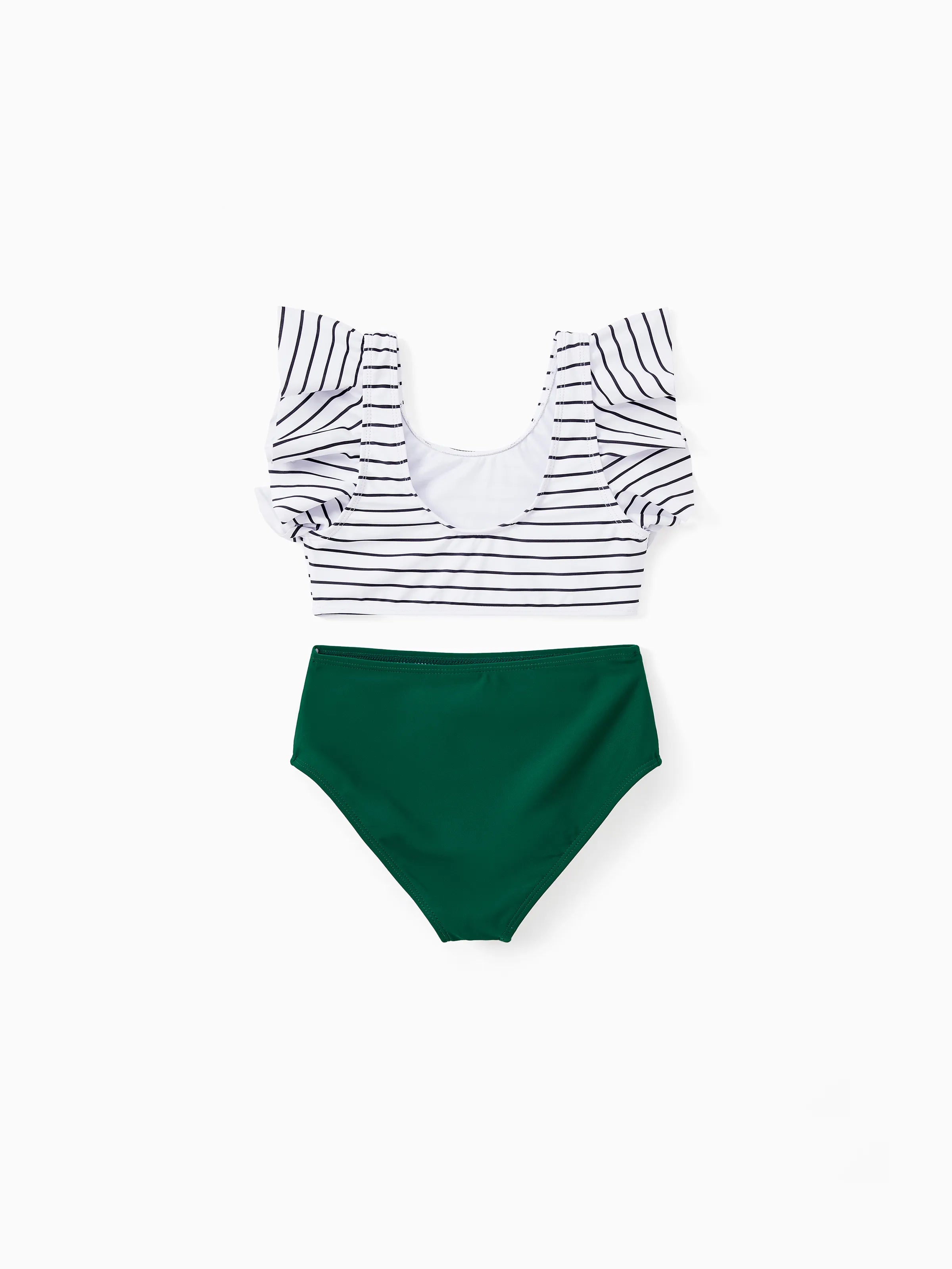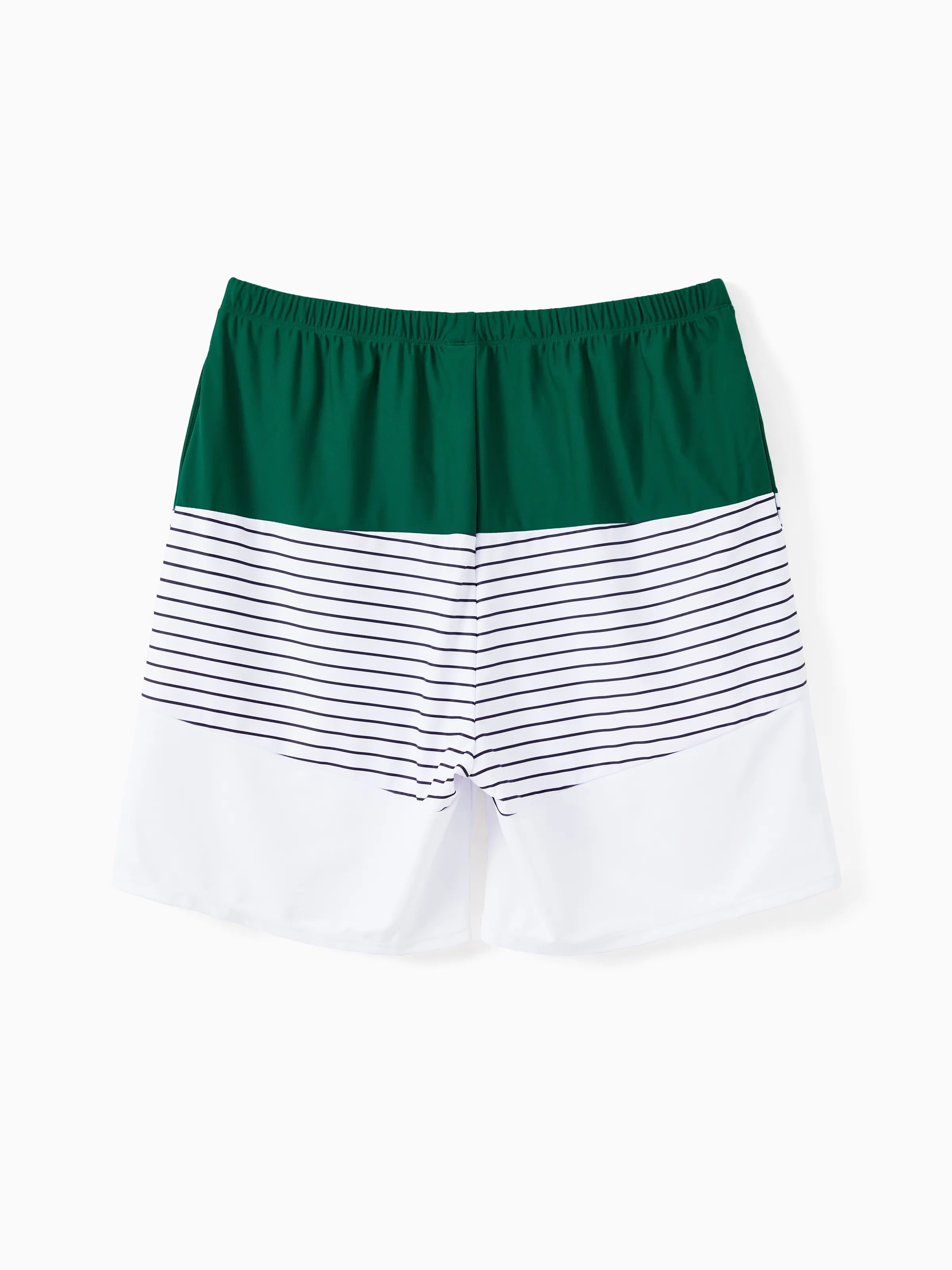 Maillots de bain familiaux assortis à rayures vertes, parfaits pour les vacances d'été à la plage.